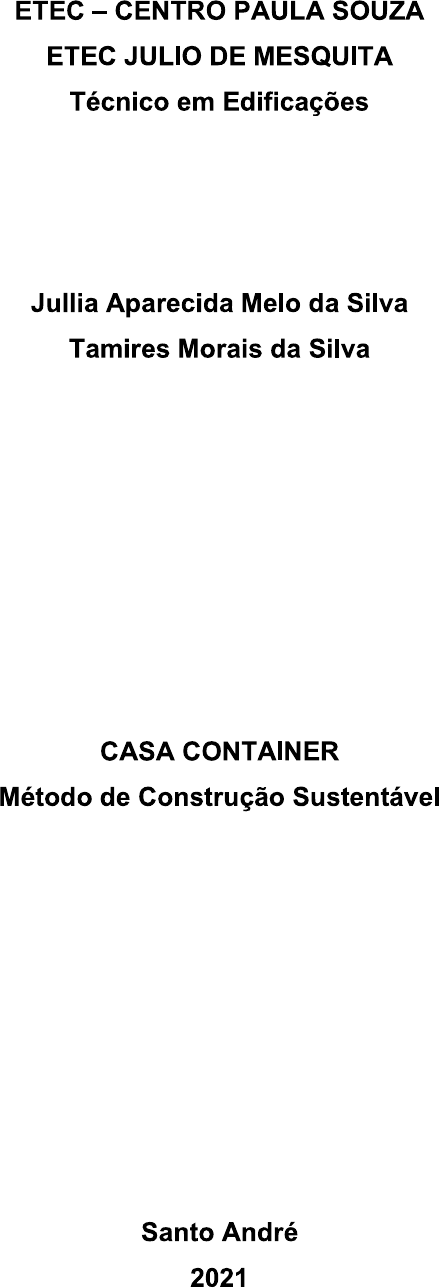 <p>ETEC - CENTRO PAULA SOUZA ETEC JULIO DE MESQUITA Técnico em Edificações Jullia Aparecida Melo da Silva Tamires Morais da Silva CASA CONTAINER Método de Construção Sustentável Santo André 2021</p><p>Jullia Aparecida Melo da Silva Tamires Morais da Silva CASA CONTAINER Método de Construção Sustentável Trabalho de Conclusão de Curso apresentado ao Curso Técnico em Edificações da ETEC Júlio de Mesquita, orientado pela Me. Eliane Correa Henrique, como requisito parcial para obtenção do título de Técnico em Edificações. Santo André 2021</p><p>AGRADECIMENTOS À Deus, por iluminar a nossas vidas e escolhas, por sempre nos proteger e guiar. Aos pais de cada integrante do grupo, que sempre nos apoiaram e nos incentivaram a crescer e amadurecer, sempre estiveram presentes durante nossa jornada de formação e sem eles nada disso seria possível. Aos nossos amigos de grupo, por estarmos juntos mesmo em meio a pandemia. Ao nosso orientador, Professor Luciano Rossi Matias, que dedicou sua paciência e seus conhecimentos e nos auxiliou neste projeto de pesquisa. À Coordenação do curso técnico de Edificações da ETEC Júlio de Mesquita, que se reinventou diante das adversidades que passamos neste ano, pela dedicação e empenho para que este curso cresça cada vez mais. À banca pela disponibilidade e pela atenção dada a este trabalho.</p><p>RESUMO trabalho apresentado traz a proposta de uma "Casa Pré-Moldada - Casa Container", aliando a necessidade de criar moradias e as ideias de sustentabilidade num setor que está entre as atividades que mais consomem recursos naturais e geram resíduos. Incorporar o container no conceito de habitação tende a dinamizar o processo construtivo, a sustentabilidade, a viabilidade e a racionalização, favorecendo a construção modular. O uso do container na construção civil abrange ambientes residenciais e Sua popularidade cresce a cada ano, levando essa prática a ser cada vez mais comum nos meios construtivos. Destacando juntamente a praticidade, economia e sustentabilidade para um novo ver no âmbito construtivo, sendo atualmente uma prática bastante proposta em projetos pelo Brasil. Nos projetos arquitetônicos, os containers são utilizados de maneira que se complementam, através dos mais variados tamanhos de container que permitem um ambiente dinâmico e um resultado harmonioso. Há dois tipos de containers, sendo: container dry standard que possui seus lados fechados contando apenas com uma porta em um dos lados menores. container é reutilizado, auxiliando o reaproveitamento do material, nesse caso, anteriormente o container foi utilizado para transportar produtos no geral, como alimentos, roupas, móveis ou carros. Tem como opção de uso também o container dry high cube que no geral se assemelha com o dry standard, porém somente varia a altura, sendo, portanto, um pouco maior. Palavras-chave: Casa container; casas pré-moldadas,</p><p>ABSTRACT The work presented brings the proposal of a "Pre-Molded House - Container House", combining the need to create new homes and the ideas of sustainability in a sector that is among the activities that most consume natural resources and generate waste. Incorporating the container into the housing concept tends to streamline the construction process, sustainability, feasibility and rationalization, favoring modular construction. The use of the container in civil construction covers residential and commercial environments. Its popularity grows every year, making this practice more and more common in construction media. Emphasizing together the practicality, economy and sustainability for a new view in the construction field, currently being a widely proposed practice in projects across Brazil. In architectural projects, containers are used in a way that complements each other, through the most varied container sizes that allow a dynamic environment and a harmonious result. There are two types of containers, namely: The standard dry container which has its sides closed with only one door on one of the smaller sides. The container is reused, helping to reuse the material, in this case, the container was previously used to transport products in general, such as food, clothing, furniture or cars. It also has the option of using the dry high cube container, which in general resembles the standard dry container, but only varies in height, being a little larger. Keywords: Container house; precast houses; Saint Andrew, Sustainability.</p><p>LISTA DE FIGURAS Figura 1: Fachada 18 Figura 2: Fachada 18 Figura 3: Fachada 19 Figura 4: Planta Térreo 19 Figura 5: Fachada 22 Figura 6: Fachada 22 Figura 7: Plantas 1°, 2° e 3° piso 23 Figura 8: Divisão das Macrozonas de São Caetano do Sul 24 Figura 9: Vista aérea do bairro com indicação da localização do terreno 26 Figura 10: Limitações com demarcação do terreno, imagem de satélite 26 Figura 11: Vista direita do terreno pela Rua Natale Furlan 27 Figura 12: Vista frontal do terreno pela Rua Natale Furlan 27 Figura 13: Vista interna do terreno 28 Figura 14: Medidas do terreno 28 Figura 15: Fluxograma 31 Figura 16: Planta de Situação 32 Figura 17: Implantação 32 Figura 18: Cobertura 33 Figura 19: Corte AA 33 Figura 20: Corte BB 33 Figura 21: Elevação Frontal 34 Figura 22: Elevação Fundos 34 Figura 23: Elevação Lateral Esquerda 35 Figura 24: Elevação Lateral Direita 35 Figura 25: Layout 35 Figura 26: Fachada Principal 36</p><p>LISTA DE TABELAS Tabela 1 - Taxas que se aplicam na classificação do terreno escolhido. 30 Tabela 2 - Levantamento preliminar do programa de necessidades 31</p><p>SUMÁRIO 1. INTRODUÇÃO 9 1.1 OBJETIVOS 10 1.2 OBJETIVO GERAL 10 1.3 OBJETIVOS ESPECÍFICOS 10 1.4 JUSTIFICATIVA 10 1.5 METODOLOGIA 11 2. REVISÃO BILIOGRÁFICA 11 2.1 IMÓVEIS RESIDENCIAIS 12 2.2 ARQUITETURA CONTAINER 12 2.2.1 Breve histórico 12 2.2.2 O CONTAINER NA ARQUITETURA 12 2.2.4 No Brasil 13 2.3 CONTAINER 13 2.4 VANTAGENS E DESVANTA