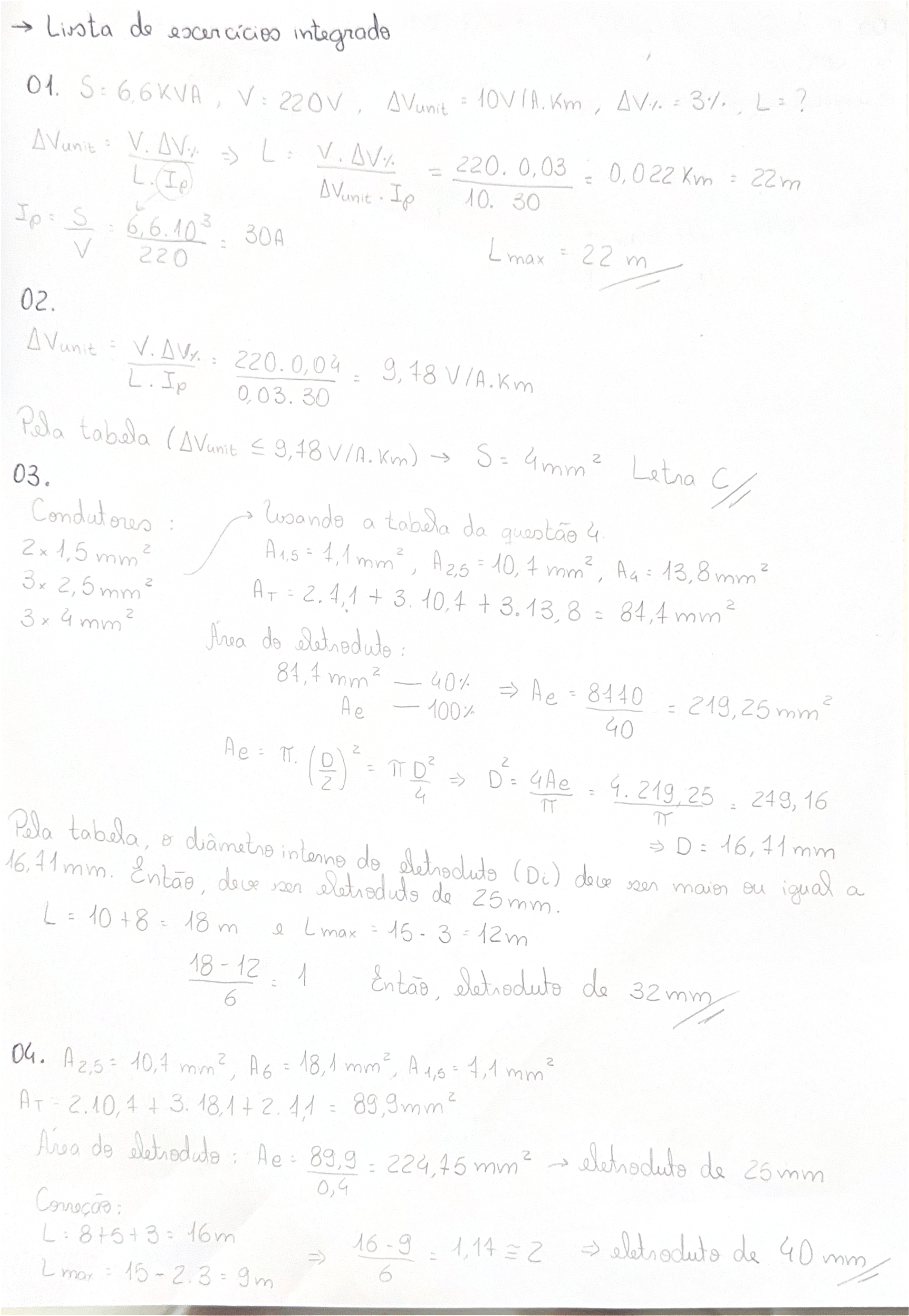 <p>Lista de integrado 01. S. V : AVunit AV% 3% V.AV% = 220.0.03 = 0,022 Km = 22m Ip Ip : 30A V 220 = 02. 220.0,04 V/A.Km L. Ip 0,03.30 Pela tabela 9,18 V/A.Km) 03. Letra Condutores a tabela da questão A2,5 = AT = + = Area do : - 40% Ae - 100% Ae = 8110 = 219,25 2 40 4 4Ae = 4.219,25 IT Pela tabela, diametro deve interno do de (Di) 16,11 ou igual mm a L = 18 m l L max = 6 eletroduto de 32mm 04. 10,7 A6 = 18,1 7,1 AT - 89,9mm2 Area do : Ae : 89,9 = 224,75 mm 2 eletroduto de 0,4 L. 8+5+3=16m L 6 eletroduto de 40</p><p>05. V = 220 B1 do Ta = 30°C => FT=1 5280 1 3 agrupados 0,4 220 In: 24A Ip 24 34,286A Pela tabela S = Letra</p>