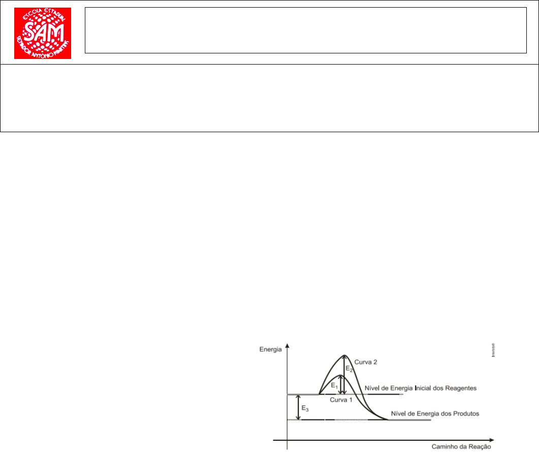 <p>1) O que a cinética química estuda?</p><p>a) o equilíbrio das reações químicas</p><p>b) a velocidade das reações químicas</p><p>c) as propriedades das soluções</p><p>d) a energia liberada ou absorvida nas reações químicas</p><p>e) o calor envolvido nas reações químicas</p><p>2) Qual das seguintes opções não afeta a velocidade das reações</p><p>a) concentração b) temperatura c) pressão</p><p>d) odor dos reagentes e) natureza química dos reagentes</p><p>3) (Ime 2013) O gráfico abaixo ilustra as variações de energia devido a uma reação química</p><p>conduzida nas mesmas condições iniciais de temperatura, pressão, volume de reator e</p><p>quantidades de reagentes em dois</p><p>sistemas diferentes. Estes sistemas</p><p>diferem apenas pela presença de</p><p>catalisador. Com base no gráfico, é</p><p>possível afirmar que:</p><p>a) a curva 1 representa a reação catalisada, que ocorre com absorção de calor.</p><p>b) a curva 2 representa a reação catalisada, que ocorre com absorção de calor.</p><p>c) a curva 1 representa a reação catalisada com energia de ativação dada por e1 + e3.</p><p>d) a curva 2 representa a reação não catalisada, que ocorre com liberação de calor e a sua</p><p>energia de ativação é dada por e2 + e3.</p><p>e) a curva 1 representa a reação catalisada, que ocorre com liberação de calor e a sua energia</p><p>de ativação é dada por e1</p><p>4) (Aman 2013) A água oxigenada ou solução aquosa de peróxido de hidrogênio é uma</p><p>espécie bastante utilizada no dia a dia na desinfecção de lentes de contato e ferimentos. A</p><p>sua decomposição produz oxigênio gasoso e pode ser acelerada por alguns fatores como o</p><p>incremento da temperatura e a adição de catalisadores. Um estudo experimental da cinética</p><p>da reação de decomposição da água oxigenada foi realizado alterando-se fatores como a</p><p>temperatura e o emprego de catalisadores, seguindo as condições experimentais listadas na</p><p>tabela a seguir:</p><p>ALUNO (A): _________________________________________________________________________________</p><p>ANO/TURMA: 2º ANO_________ TURNO: MANHÂ DATA: ____/_____/2024</p><p>PROFESSOR: Mariana VALOR: 3 PONTOS NOTA:___________</p><p>Escola Estadual Senador Antônio Martins / Ponte Nova - MG</p><p>ESTUDO DIRIGIDO – QUÍMICA</p><p>TESTE SEMANAL-6ª SÉRIE</p><p>Analisando os dados fornecidos, assinale a alternativa correta que indica a ordem crescente</p><p>dos tempos de duração dos experimentos.</p><p>a) t1 < t2 < t3 < t4 b) t3 < t4 < t2 < t1 c) t3 < t2 < t1 < t4</p><p>d) t4 < t2 < t3 < t1 e) t1 < t3 < t4 < t2</p><p>5) (UFRO–RO) Reações em que a energia dos reagentes é inferior à dos produtos, à mesma</p><p>temperatura, são:</p><p>a) endotérmicas b) lentas c) espontâneas</p><p>d) catalisadas e) explosivas</p><p>6) Se a temperatura de uma reação aumenta, marque entre as opções abaixo o que</p><p>acontecerá com a velocidade da reação</p><p>a)Diminui b) Permanece a mesma c) Aumenta</p><p>d)Torna-se igual a zero e) Nenhuma das opções acima</p><p>7) (UFRN-RN) O preparo de uma solução de hidróxido de sódio em água ocorre com</p><p>desenvolvimento de energia térmica e consequente aumento de temperatura, indicando tratar-</p><p>se</p><p>de um processo:</p><p>a) sem variação de entalpia. b) sem variação de energia livre.</p><p>c) isotérmico. d) endotérmico.</p><p>e) exotérmico.</p><p>8) 4) (UCDB-MS) Considerando a reação de dissolução do cloreto de sódio em água:</p><p>NaCℓ (s) Na+ (aq) + Cℓ-</p><p>(aq) ∆H = - 0,9kcal/mol</p><p>Podemos afirmar que este processo é:</p><p>a) exotérmico. b) endotérmico. c) isotérmico.</p><p>d) atérmico. e) adiabático.</p>