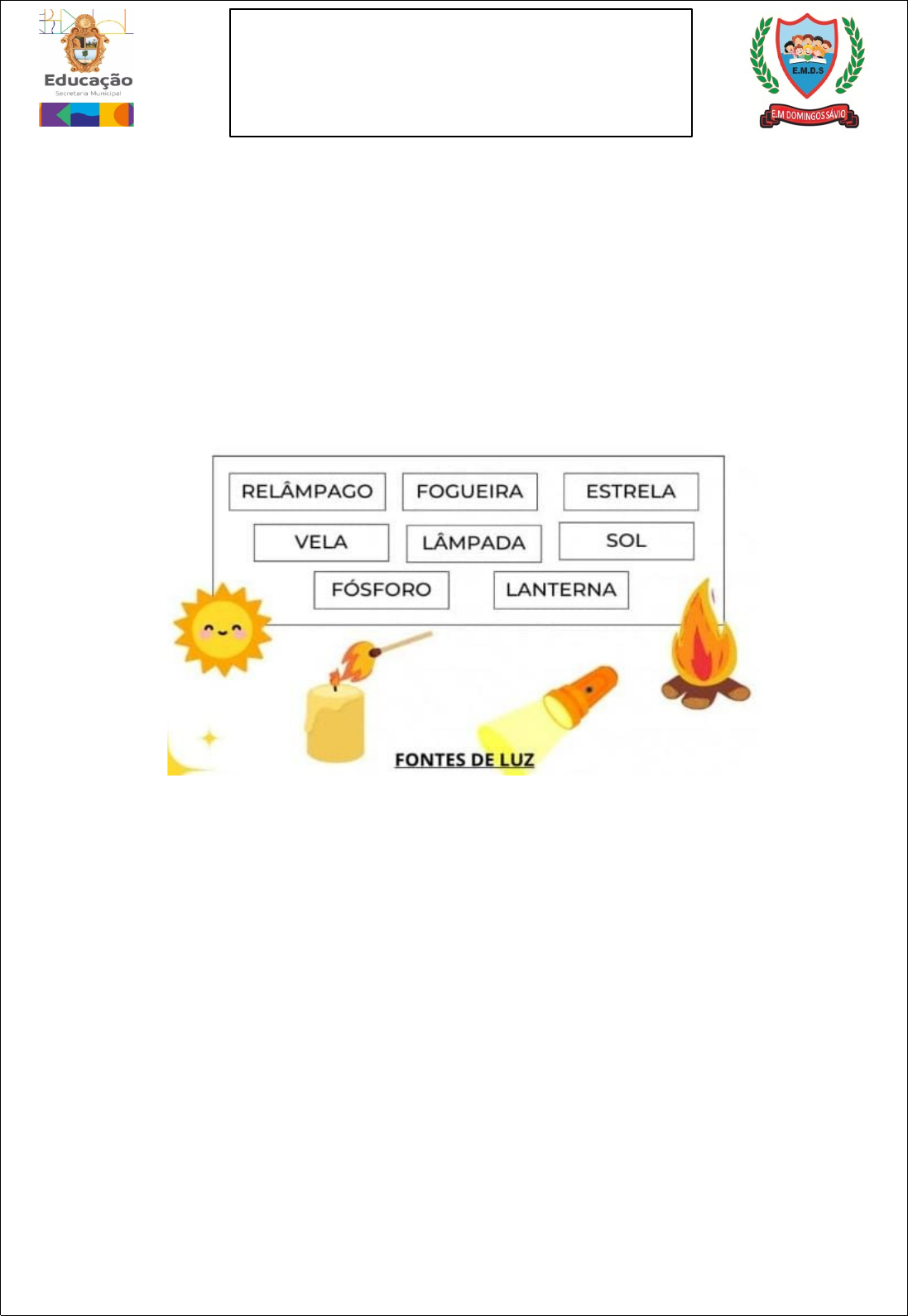 <p>SECRETARIA MUNICIPAL DE EDUCAÇÃO</p><p>SUBSECRETARIA DE GESTÃO EDUCACIONAL</p><p>DEPARTAMENTO GERAL DE DISTRITOS</p><p>ESCOLA MUNICIPAL DOMINGOS SÁVIO</p><p>RUA PROF. ABÍLIO ALENCAR S/N – ALVORADA 2</p><p>ESCOLA MUNICIPAL DOMINGOS SÁVIO</p><p>PROFESSORA: ____________________________________________________________</p><p>ALUNO(A): _______________________________________________________________</p><p>3º ANO TURMA: _____ TURNO: _______________ NOTA: __________</p><p>____________________________________________________________________________________________</p><p>AVALIAÇÃO DE CIÊNCIAS – 3º BIMESTRE</p><p>1. A luz pode ser natural ou artificial. Classifique as fontes de luz do quadro abaixo: (2,0)</p><p>Naturais - ______________________________________________________________________</p><p>Artificiais - _____________________________________________________________________</p><p>2. Marque um X somente nos objetos que não deixam a luz passar: (2,0)</p><p>3. Coloque V para afirmação verdadeira e F para afirmação falsa: (2,0)</p><p>( ) Todo solo é igual.</p><p>( ) Os solos servem como abrigo para minhocas e tatus.</p><p>( ) O solo é um lugar que tem pouca vida.</p><p>( ) É no solo que as plantas se desenvolvem.</p><p>4. Um dos aspectos que afetam o solo é a poluição. Marque a alternativa que possui somente elementos quem contribuem para a poluição do solo: (2,0)</p><p>( ) Folhas secas e lixo.</p><p>( ) Cascas de frutas e folhas.</p><p>( ) Chuva e sol.</p><p>( ) Agrotóxicos e lixo.</p><p>5. Assinale os possíveis problemas de saúde gerados pela poluição sonora e visual: (2,0)</p><p>image6.jpeg</p><p>image7.jpeg</p><p>image1.png</p><p>image2.png</p><p>image3.jpeg</p><p>image4.jpeg</p><p>image5.jpeg</p>