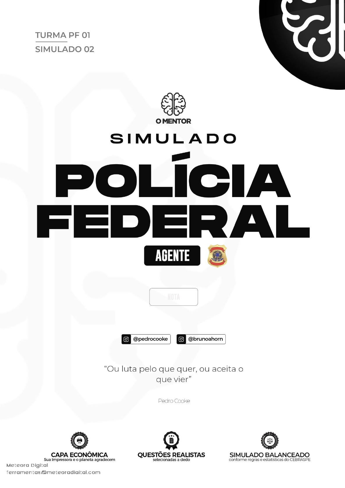 <p>INSERIR NOVA CAPA</p><p>João Gabriel Vicari Santana - vicarisantanagabriel@gmail.com - IP: 131.161.64.216</p><p>GABARITO</p><p>João Gabriel Vicari Santana - vicarisantanagabriel@gmail.com - IP: 131.161.64.216</p><p>BLOCO I</p><p>Língua Portuguesa</p><p>Texto para o item 1 a 3</p><p>A história constitucional brasileira está repleta de</p><p>referências difusas à segurança pública, mas, até a</p><p>Constituição Federal de 1988 (CF), esse tema não era</p><p>tratado em capítulo próprio nem previsto mais</p><p>detalhadamente no texto constitucional.</p><p>A constitucionalização traz importantes</p><p>consequências para a legitimação da atuação estatal</p><p>na formulação e na execução de políticas de</p><p>segurança. As leis acerca de segurança, nos três</p><p>planos federativos de governo, devem estar em</p><p>conformidade com a CF, assim como as respectivas</p><p>estruturas administrativas e as próprias ações</p><p>concretas das autoridades policiais. Devem ser</p><p>especialmente observados os princípios</p><p>constitucionais fundamentais — a república, a</p><p>democracia, o estado de direito, a cidadania, a</p><p>dignidade da pessoa humana — bem como os direitos</p><p>fundamentais — a vida, a liberdade, a igualdade, a</p><p>segurança. O art. 144 deve ser interpretado de acordo</p><p>com o núcleo axiológico do sistema constitucional em</p><p>que se situam esses princípios fundamentais.</p><p>Cláudio Pereira de Souza Neto. A segurança pública na</p><p>Constituição Federal de 1988:</p><p>conceituação constitucionalmente adequada, competências federativas e órgãos de</p><p>execução das políticas. Internet: <www.oab.org.br> (com adaptações).</p><p>1. Com relação às ideias e a aspectos gramaticais</p><p>desse texto, julgue o item.</p><p>O emprego do acento indicativo de crase em “à</p><p>segurança pública” justifica-se pela regência do termo</p><p>“difusas” e pela presença do artigo definido a antes de</p><p>“segurança pública”.</p><p>2. Com relação às ideias e a aspectos gramaticais</p><p>desse texto, julgue o item.</p><p>A correção gramatical do texto seria prejudicada caso</p><p>se suprimisse a vírgula antes da conjunção “mas”.</p><p>3. Com relação às ideias e a aspectos gramaticais</p><p>desse texto, julgue o item.</p><p>Mantendo-se a coerência e a correção gramatical do</p><p>texto, o trecho “em que se situam esses princípios</p><p>fundamentais” poderia ser substituído por aonde se</p><p>situam esses princípios fundamentais.</p><p>4. Julgue se o item seguinte apresenta relações de</p><p>sentido que correspondem à estrutura semântica</p><p>dada pela fórmula genérica "X, não Y" em que X é uma</p><p>estrutura linguística que expressa condição ou</p><p>concessão, e Y é uma estrutura linguística afirmativa.</p><p>Embora a nossa concepção de violência tenha sido</p><p>ampliada, não é possível afirmar que nossa</p><p>sensibilidade e tolerância em relação a ela estejam</p><p>igualmente distribuídas.</p><p>Cada um dos itens da prova objetiva está vinculado ao comando que imediatamente o antecede. De acordo com o</p><p>comando a que cada um deles esteja vinculado, marque, na Folha de Respostas, para cada item: o campo designado</p><p>com o código C, caso julgue o item CERTO; ou o campo designado com o código E, caso julgue o item ERRADO. A</p><p>ausência de marcação ou a marcação de ambos os campos não serão apenadas, ou seja, não receberão pontuação</p><p>negativa. Para as devidas marcações, use a Folha de Respostas, único documento válido para a correção da sua prova</p><p>objetiva.</p><p>• Nos itens que avaliarem conhecimentos de informática e(ou) tecnologia da informação, a menos que seja</p><p>explicitamente informado o contrário, considere que todos os programas mencionados estão em configuração-</p><p>padrão e que não há restrições de proteção, de funcionamento e de uso em relação aos programas, arquivos,</p><p>diretórios, recursos e equipamentos mencionados.</p><p>• Eventuais espaços livres — identificados ou não pela expressão “Espaço livre” — que constarem deste caderno de</p><p>prova poderão ser utilizados para rascunho</p><p>PROVA OBJETIVA</p><p>João Gabriel Vicari Santana - vicarisantanagabriel@gmail.com - IP: 131.161.64.216</p><p>Texto para o item 5</p><p>CONSTITUIÇÃO DA REPÚBLICA FEDERATIVA DO</p><p>BRASIL DE 1988</p><p>Preâmbulo</p><p>Nós, representantes do povo brasileiro, reunidos em</p><p>Assembleia Nacional Constituinte para instituir um</p><p>Estado Democrático, destinado a assegurar o exercício</p><p>dos direitos sociais e individuais, a liberdade, a</p><p>segurança, o bem-estar, o desenvolvimento, a</p><p>igualdade e a justiça como valores supremos de uma</p><p>sociedade fraterna, pluralista e sem preconceitos,</p><p>fundada na harmonia social e comprometida, na</p><p>ordem interna e internacional, com a solução pacífica</p><p>das controvérsias, promulgamos, sob a proteção de</p><p>Deus, a seguinte CONSTITUIÇÃO DA REPÚBLICA</p><p>FEDERATIVA DO BRASIL.</p><p>5. Julgue o seguinte item, referente ao texto acima.</p><p>No texto, o verbo que inicia o predicado para o sujeito</p><p>"Nós" é "promulgamos".</p><p>6. Julgue os fragmentos de texto apresentados no</p><p>seguinte item com relação à grafia das palavras.</p><p>Dotar todas as escolas com as condições necessárias</p><p>para receber dignamente alunos e professores é o</p><p>mínimo que se espera do poder público.</p><p>7. Julgue o item seguinte, relativos a acentuação de</p><p>palavras e a aspectos gramaticais do trecho a seguir.</p><p>No trecho “É certo que a evidência da beleza não</p><p>pode ser em arte um critério axiomático”, tanto o</p><p>termo “certo” quanto o termo “axiomático”</p><p>caracterizam, respectivamente, referentes que</p><p>constituem sujeitos oracionais.</p><p>8. Julgue o seg