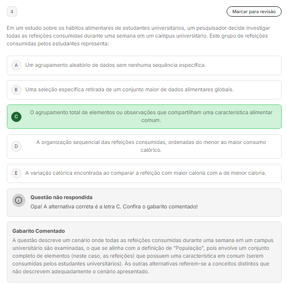 <p>4 Marcar para revisão Em um estudo sobre os hábitos alimentares de estudantes universitários, um pesquisador decide investigar todas as refeições consumidas durante uma semana em um campus universitário. Este grupo de refeições consumidas pelos estudantes representa: A Um agrupamento aleatório de dados sem nenhuma sequência B Uma seleção retirada de um conjunto maior de dados alimentares globais. agrupamento total de elementos ou observações que compartilham uma alimentar A organização sequencial das refeições consumidas, ordenadas do menor ao maior consumo D E A variação calórica encontrada ao comparar a refeição com maior caloria com a de menor Questão não respondida Opa! A alternativa correta é a letra C. Confira gabarito comentado! Gabarito Comentado A questão descreve um onde todas as refeições consumidas durante uma semana em um campus universitário são examinadas, que se alinha com a definição de "População", pois envolve um conjunto completo de elementos (neste caso, as refeições) que possuem uma em comum (serem consumidas pelos estudantes universitários). As outras alternativas referem-se a conceitos distintos que não descrevem adequadamente cenário apresentado.</p>
