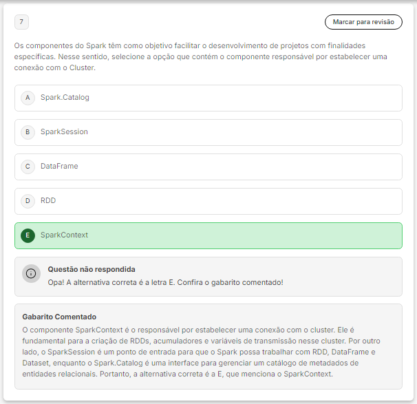 <p>7 Marcar para revisão Os componentes do Spark têm como objetivo facilitar desenvolvimento de projetos com finalidades Nesse sentido, selecione a opção que contém componente responsável por estabelecer uma conexão com A Spark.Catalog B SparkSession C DataFrame D RDD E SparkContext Questão não respondida Opa! A alternativa correta é a letra E. Confira gabarito comentado! Gabarito Comentado componente SparkContext é responsável por estabelecer uma conexão com Ele é fundamental para a criação de RDDs, acumuladores e variáveis de transmissão nesse cluster. Por outro lado, SparkSession é um ponto de entrada para que Spark possa trabalhar com RDD, DataFrame e Dataset, enquanto Spark.Catalog é uma interface para gerenciar um de metadados de entidades Portanto, a alternativa correta é a E, que menciona SparkContext.</p>