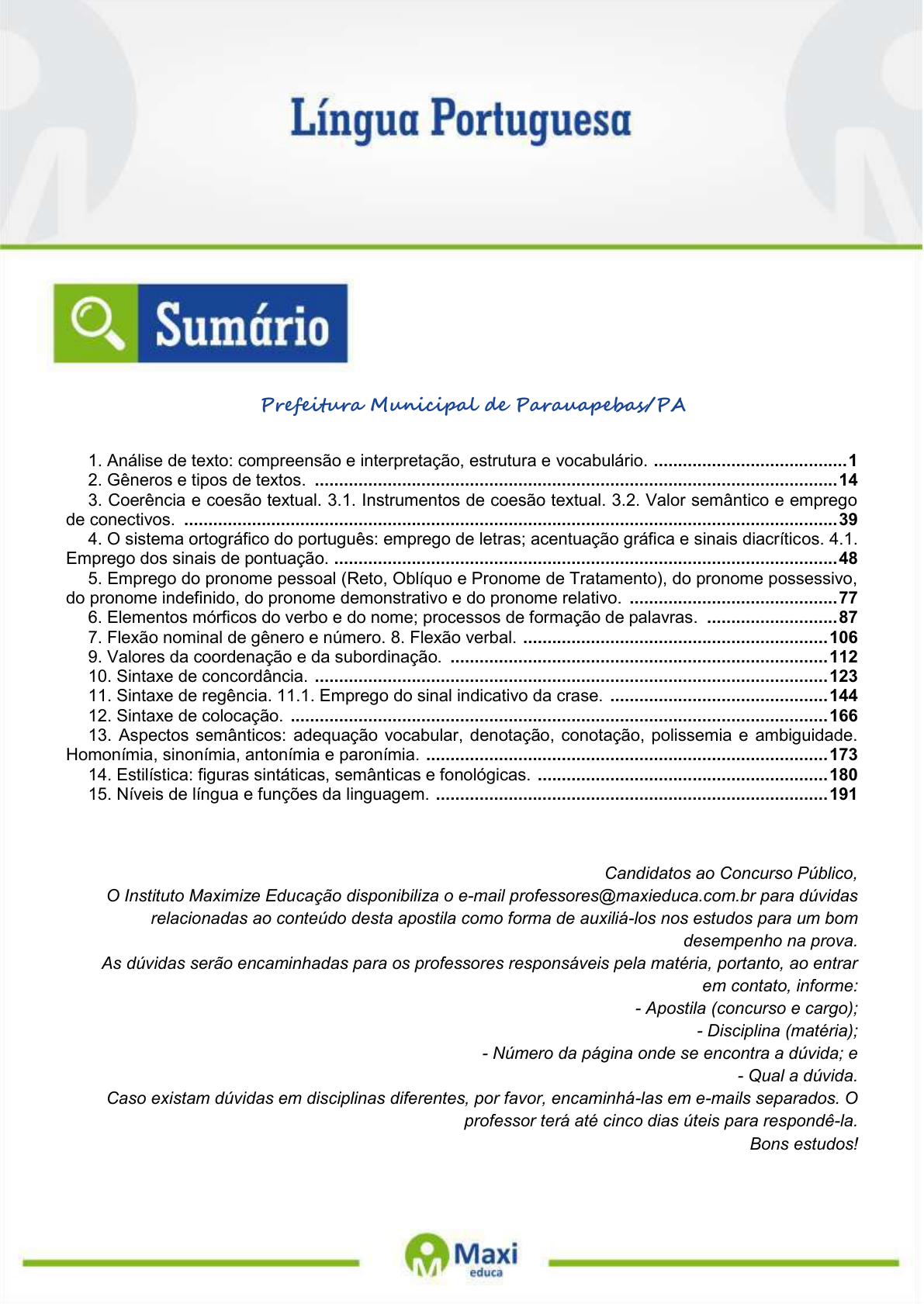 <p>. 1</p><p>Prefeitura Municipal de Parauapebas/PA</p><p>1. Análise de texto: compreensão e interpretação, estrutura e vocabulário. ........................................ 1</p><p>2. Gêneros e tipos de textos. ............................................................................................................ 14</p><p>3. Coerência e coesão textual. 3.1. Instrumentos de coesão textual. 3.2. Valor semântico e emprego</p><p>de conectivos. ....................................................................................................................................... 39</p><p>4. O sistema ortográfico do português: emprego de letras; acentuação gráfica e sinais diacríticos. 4.1.</p><p>Emprego dos sinais de pontuação. ........................................................................................................ 48</p><p>5. Emprego do pronome pessoal (Reto, Oblíquo e Pronome de Tratamento), do pronome possessivo,</p><p>do pronome indefinido, do pronome demonstrativo e do pronome relativo. ........................................... 77</p><p>6. Elementos mórficos do verbo e do nome; processos de formação de palavras. ........................... 87</p><p>7. Flexão nominal de gênero e número. 8. Flexão verbal. ............................................................... 106</p><p>9. Valores da coordenação e da subordinação. .............................................................................. 112</p><p>10. Sintaxe de concordância. .......................................................................................................... 123</p><p>11. Sintaxe de regência. 11.1. Emprego do sinal indicativo da crase. ............................................. 144</p><p>12. Sintaxe de colocação. ............................................................................................................... 166</p><p>13. Aspectos semânticos: adequação vocabular, denotação, conotação, polissemia e ambiguidade.</p><p>Homonímia, sinonímia, antonímia e paronímia. ................................................................................... 173</p><p>14. Estilística: figuras sintáticas, semânticas e fonológicas. ............................................................ 180</p><p>15. Níveis de língua e funções da linguagem. ................................................................................. 191</p><p>Candidatos ao Concurso Público,</p><p>O Instituto Maximize Educação disponibiliza o e-mail professores@maxieduca.com.br para dúvidas</p><p>relacionadas ao conteúdo desta apostila como forma de auxiliá-los nos estudos para um bom</p><p>desempenho na prova.</p><p>As dúvidas serão encaminhadas para os professores responsáveis pela matéria, portanto, ao entrar</p><p>em contato, informe:</p><p>- Apostila (concurso e cargo);</p><p>- Disciplina (matéria);</p><p>- Número da página onde se encontra a dúvida; e</p><p>- Qual a dúvida.</p><p>Caso existam dúvidas em disciplinas diferentes, por favor, encaminhá-las em e-mails separados. O</p><p>professor terá até cinco dias úteis para respondê-la.</p><p>Bons estudos!</p><p>1400458 E-book gerado especialmente para OZIEL DE SOUZA COSTA</p><p>. 1</p><p>Caro(a) candidato(a), antes de iniciar nosso estudo, queremos nos colocar à sua disposição, durante</p><p>todo o prazo do concurso para auxiliá-lo em suas dúvidas e receber suas sugestões. Muito zelo e técnica</p><p>foram empregados na edição desta obra. No entanto, podem ocorrer erros de digitação ou dúvida</p><p>conceitual. Em qualquer situação, solicitamos a comunicação ao nosso serviço de atendimento ao cliente</p><p>para que possamos esclarecê-lo. Entre em contato conosco pelo e-mail: professores@maxieduca.com.br</p><p>Interpretação</p><p>Cada vez mais, é comprovada a dificuldade dos estudantes, de qualquer idade, e para qualquer</p><p>finalidade de compreender o que se pede em textos, e também dos enunciados. Qual a importância de</p><p>entender um texto?</p><p>Quando se fala em texto, pensamos naqueles longos, com introdução, desenvolvimento e conclusão,</p><p>onde depois temos que responder a uma ou a várias questões sobre ele. Na verdade, texto pode ser a</p><p>questão em si, a leitura que fazemos antes de resolver o exercício. E como é possível cometer um erro</p><p>numa simples leitura de enunciado? Mais fácil de acontecer do que se imagina. Se na hora da leitura,</p><p>deixamos de prestar atenção numa só palavra, como um “não”, já muda a interpretação. Veja a diferença:</p><p>Qual opção abaixo não pertence ao grupo?</p><p>Qual opção abaixo pertence ao grupo?</p><p>Isso já muda totalmente a questão, e se o leitor está desatento, vai marcar a primeira opção que</p><p>encontrar correta. Pode parecer exagero pelo exemplo dado, mas tenha certeza que isso acontece mais</p><p>do que imaginamos, ainda mais na pressão da prova, tempo curto e muitas questões. Partindo desse</p><p>princípio, se podemos errar num simples enunciado, que é um texto curto, imagine os erros que podemos</p><p>cometer ao ler um texto maior, sem prestar devida atenção aos detalhes. É por isso que é preciso</p><p>melhorar a capacidade de leitura e compreensão.</p><p>A literatura é a arte de recriar através da língua escrita. Sendo assim, temos vários tipos de gêneros</p><p>textuais, formas de escrita. Mas a grande dificuldade encontrada pelas pessoas é a interpretação de</p><p>textos. Muitos dizem que não sabem interpretar, ou que é muito difícil. Se você tem pouca leitura,</p><p>consequentemente terá pouca argumentação, pouca visão, pouco ponto de vista e um grande medo de</p><p>interpretar. A interpretação é o alargamento dos horizontes. E esse alargamento acontece justamente</p><p>quando há leitura. Somos fragmentos de nossos escritos, de nossos pensamentos, de nossas histórias,</p><p>muitas vezes contadas por outros. Quantas vezes voc