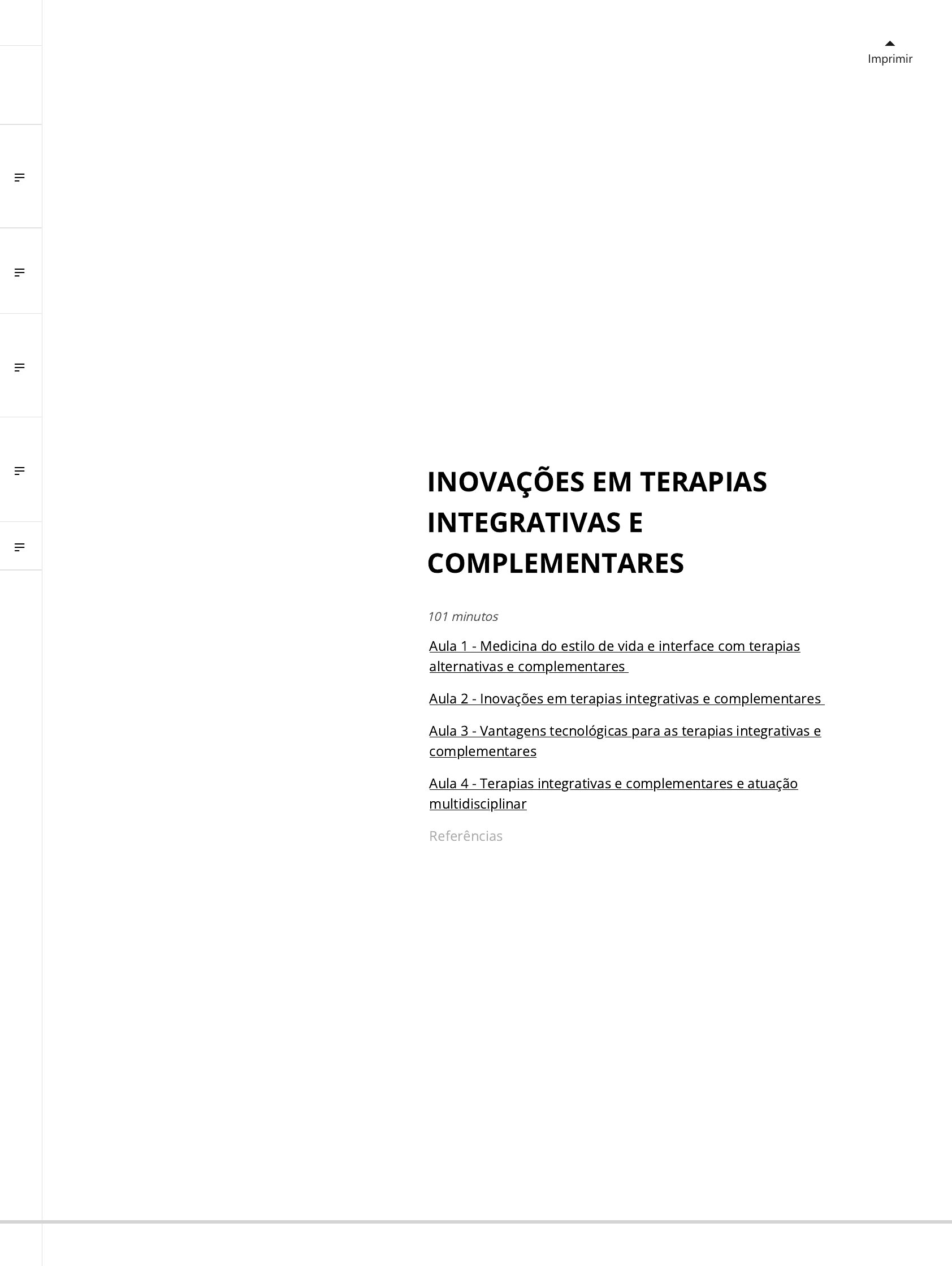<p>20/02/23, 11:42 wlldd_222_u4_asp_reg_ter_int_com</p><p>https://colaboraread.com.br/integracaoAlgetec/index?usuarioEmail=joice_pina%40yahoo.com.br&usuarioNome=JOICE+LEMES+PINA+RAMOS&disciplinaDescricao=ASPECTOS+REGULATÓRIOS+DE+TERAPIA… 1/21</p><p>Imprimir</p><p></p><p>INOVAÇÕES EM TERAPIAS</p><p>INTEGRATIVAS E</p><p>COMPLEMENTARES</p><p>101 minutos</p><p>Aula 1 - Medicina do estilo de vida e interface com terapias</p><p>alternativas e complementares</p><p>Aula 2 - Inovações em terapias integrativas e complementares</p><p>Aula 3 - Vantagens tecnológicas para as terapias integrativas e</p><p>complementares</p><p>Aula 4 - Terapias integrativas e complementares e atuação</p><p>multidisciplinar</p><p>Referências</p><p>20/02/23, 11:42 wlldd_222_u4_asp_reg_ter_int_com</p><p>https://colaboraread.com.br/integracaoAlgetec/index?usuarioEmail=joice_pina%40yahoo.com.br&usuarioNome=JOICE+LEMES+PINA+RAMOS&disciplinaDescricao=ASPECTOS+REGULATÓRIOS+DE+TERAPIA… 2/21</p><p>INTRODUÇÃO</p><p>Olá, estudante!</p><p>A medicina do estilo de vida consiste em uma abordagem multidisciplinar que reconhece o ser humano como</p><p>promotor de seu bem-estar e saúde, através da interação com o meio em que vive e com seus hábitos de vida.</p><p>O Sistema Único de Saúde (SUS) atua no âmbito da promoção da saúde, já que objetiva a melhoria da qualidade</p><p>de vida, e na a�rmação do direito à saúde e à vida. Nesta aula, você terá a oportunidade de aprender mais</p><p>sobre a medicina do estilo de vida, através de alguns conceitos importantes sobre alimentação saudável,</p><p>qualidade do sono, controle do estresse, promoção de saúde e prevenção de doenças. Vamos lá?</p><p>UMA INTRODUÇÃO SOBRE A MEDICINA DO ESTILO DE VIDA</p><p>As mudanças políticas, econômicas, culturais e sociais que vêm ocorrendo no mundo desde o século XIX</p><p>produziram signi�cativas alterações na vida do indivíduo no contexto social. A saúde também foi alterada nesse</p><p>período, já que o processo de transformação da sociedade engloba os processos de transformação dos</p><p>problemas sanitários e da saúde. Nas últimas décadas, cuidar da vida com o intuito de reduzir a vulnerabilidade</p><p>de adoecer, de sofrimento crônico e de morte prematura �gurou como prioridade para garantir a saúde da</p><p>população.</p><p>Segundo às diretrizes e recomendações para o cuidado integral de doenças crônicas não-transmissíveis, o</p><p>consumo excessivo de bebidas alcoólicas, o tabagismo, o sedentarismo e a má alimentação são hábitos de vida</p><p>não saudáveis que estão entre as principais causas dessas doenças. Através da manutenção de hábitos de vida</p><p>saudáveis, objetivando a prevenção de doenças e a promoção da saúde, é possível reduzir as chances de a</p><p>pessoa desenvolver patologias que podem ser evitadas, como doenças metabólicas (diabetes e obesidade),</p><p>hipertensão, doenças cardiovasculares, alguns tipos de câncer e doenças respiratórias crônicas.</p><p>A medicina do estilo de vida pode ser de�nida como uma abordagem interdisciplinar voltada para a promoção</p><p>da saúde e a prevenção de doenças, através da manutenção de bons hábitos de vida, como alimentação</p><p>saudável, qualidade do sono e controle do estresse. Ela é composta por seis pilares fundamentais para a saúde,</p><p>incluindo atividade física, controle de tóxicos, saúde do sono, conexões pessoais e interpessoais, saúde mental</p><p>Aula 1</p><p>MEDICINA DO ESTILO DE VIDA E INTERFACE COM TERAPIAS</p><p>ALTERNATIVAS E COMPLEMENTARES</p><p>A medicina do estilo de vida consiste em uma abordagem multidisciplinar que reconhece o ser</p><p>humano como promotor de seu bem-estar e saúde, através da interação com o meio em que vive</p><p>e com seus hábitos de vida.</p><p>24 minutos</p><p></p><p>20/02/23, 11:42 wlldd_222_u4_asp_reg_ter_int_com</p><p>https://colaboraread.com.br/integracaoAlgetec/index?usuarioEmail=joice_pina%40yahoo.com.br&usuarioNome=JOICE+LEMES+PINA+RAMOS&disciplinaDescricao=ASPECTOS+REGULATÓRIOS+DE+TERAPIA… 3/21</p><p>e alimentação saudável. A medicina do estilo de vida visa à promoção de um estilo de vida saudável, com o</p><p>objetivo de poder reduzir as complicações de uma doença ou para evitar que, devido a um hábito de vida que</p><p>não seja saudável, a pessoa �que doente.</p><p>O desenvolvimento de uma relação de parceria entre paciente e médico deve existir para que seja possível</p><p>transformar o estilo de vida do paciente, a partir da utilização de técnicas motivacionais que abordem</p><p>sistematicamente os seis pilares fundamentais da saúde. Alimentação saudável, qualidade do sono e controle</p><p>do estresse estão entre os pilares que fundamentam a medicina do estilo de vida, os quais podem ser</p><p>controlados através de intervenções terapêuticas para tratar, prevenir e reverter doenças não transmissíveis</p><p>associadas.</p><p>Os programas de prevenção e promoção da saúde são extremamente importantes, pois melhoram o estado de</p><p>saúde e a qualidade de vida de pessoas, famílias, comunidades, estados e países, e reduzem tanto mortes</p><p>prematuras quanto custos com tratamentos médicos. Manter as pessoas saudáveis é o objetivo comum dos</p><p>programas de promoção e prevenção de saúde. Mas você sabe qual é a diferença entre promoção e prevenção?</p><p>Basicamente, a promoção de saúde visa a mudanças no estilo de vida para, através do incentivo de pessoas ou</p><p>comunidades a terem um comportamento saudável, reduzir o risco de doenças. Já a prevenção de saúde,</p><p>através de intervenções sociais e ambientais, busca prevenir doenças, e não somente o tratamento ou a cura,</p><p>com o objetivo de proteger a qualidade de vida e a saúde de cada pessoa.</p><p>CONCEITOS E PILARES DA MEDICINA DO ESTILO DE VIDA</p><p>Antigamente, a 