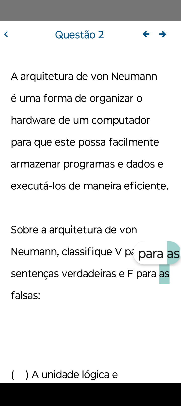 <p>< Questão 2 A arquitetura de von Neumann é uma forma de organizar hardware de um computador para que este possa facilmente armazenar programas e dados e executá-los de maneira eficiente. Sobre a arquitetura de von Neumann, classifique V para as sentenças verdadeiras e F para as falsas: ) A unidade lógica e</p>