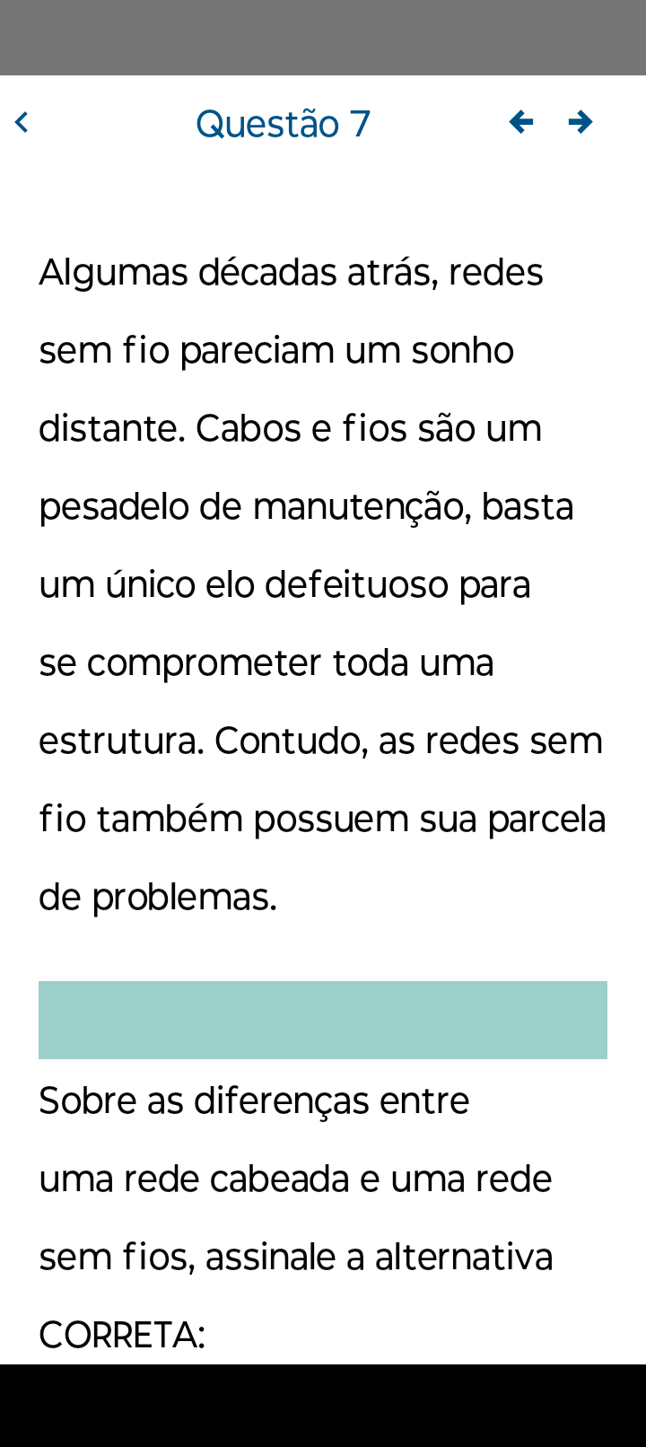<p>< Questão 7 Algumas décadas atrás, redes sem fio pareciam um sonho distante. Cabos e fios são um pesadelo de manutenção, basta um único elo defeituoso para se comprometer toda uma estrutura. Contudo, as redes sem fio também possuem sua parcela de problemas. Sobre as diferenças entre uma rede cabeada e uma rede sem fios, assinale a alternativa CORRETA:</p>