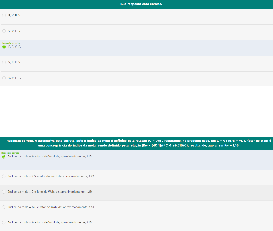 <p>ATIVIDADE 1 - ELEMENTOS DE MÁQUINAS</p><p>1 - O dimensionamento das molas helicoidais de tração contempla a presença de um carregamento inicial aplicado sobre a mola, o qual tem por objetivo possibilitar que os arames da mola, após a correspondente fabricação dela, permaneçam em contato direto uns com os outros.</p><p>A respeito do dimensionamento das molas helicoidais de tração, analise as afirmativas a seguir e assinale V para a(s) Verdadeira(s) e F para a(s) Falsa(s).</p><p>I. ( ) A relação carga-deformação de uma mola helicoidal de tração é definida pela relação: F = Ky, sendo F a força, K a constante (ou razão) da mola e y a deflexão da mola.</p><p>II. ( ) A deflexão máxima de uma mola helicoidal de tração é definida pela relação: ymax = Fmax/K, sendo ymax a deflexão máxima da mola, K a constante (ou razão) da mola e Fmax a carga máxima aplicada.</p><p>III. ( ) O comprimento total de uma mola helicoidal de tração é definido pela relação: L = Lo + ymax, sendo “Lo” o comprimento fechado (sólido) da mola e ymax a deflexão máxima da mola.</p><p>IV. ( ) A carga inicial aplicada sobre uma mola helicoidal de tração não apresenta qualquer influência no dimensionamento da mola.</p><p>Assinale a alternativa que apresenta a sequência correta.</p><p>Resposta correta. A sequência está correta, pois a afirmativa III é verdadeira, visto que a soma realizada entre o comprimento sólido da mola e a máxima deformação sofrida por ela, quando solicitada por um carregamento externo máximo, fornece o valor do comprimento livre da mola.</p><p>2 - O dimensionamento das molas de compressão envolve diversos parâmetros geométricos da mola, como: passo, comprimento livre, comprimento sólido e diâmetro do arame, e, também, parâmetros externos, tais como: força atuante e deflexão sofrida pela mola.</p><p>Nesse sentido, assinale a alternativa que indique o valor do índice da mola e o valor do fator de Wahl, para uma mola helicoidal de diâmetro de arame 5 mm e diâmetro médio 45 mm.</p><p>3 - Leia o excerto a seguir.</p><p>O processo de fabricação de molas de compressão contempla um desenrolador de fio de mola, o qual dará formato final à mola. Em decorrência desse processo, as molas serão submetidas a um elevado nível de tensões, necessitando de um tratamento térmico posterior para alívio dessas tensões.</p><p>Considerando o excerto apresentado sobre a fabricação das molas de compressão, analise as afirmativas a seguir.</p><p>I. Os tratamentos térmicos utilizados para alívio de tensões são padronizados, independente do material considerado para a mola.</p><p>II. O tratamento térmico de revenimento é, normalmente, aplicado com o objetivo de corrigir a tenacidade da mola.</p><p>III. O tratamento térmico de têmpera é, normalmente, aplicado com o objetivo de fornecer o endurecimento necessário para a mola.</p><p>IV. Os tratamentos térmicos de revenimento e têmpera são excludentes, ou seja, considera-se apenas um dos dois tratamentos no processo de fabricação das molas.</p><p>Está correto o que se afirma em:</p><p>4 - Leia o trecho a seguir.</p><p>No dimensionamento de uma mola helicoidal de compressão, além da determinação da tensão de cisalhamento atuante no arame da mola, é necessário determinar a deflexão sofrida por esta, visto que, a partir dessa informação, torna-se possível relacionar o passo e os comprimentos livre e sólido da mola.</p><p>Com base no contexto apresentado, analise as asserções a seguir e a relação proposta entre elas.</p><p>I. A deflexão máxima sofrida pela mola depende dos comprimentos livre e sólido desta.</p><p>Pois:</p><p>II. A deflexão sofrida pela mola é diretamente proporcional à carga atuante sobre ela e inversamente proporcional ao módulo de rigidez do material dessa mola.</p><p>A seguir, assinale a alternativa correta.</p><p>5 - Dentre os diversos tipos de molas disponíveis, pode-se considerar que as molas helicoidais, tanto de tração quanto de compressão, apresentam diversas similaridades no contexto do dimensionamento delas. Ambas apresentam tensões de cisalhamento atuantes no corpo da mola.</p><p>A respeito do dimensionamento das molas helicoidais de tração, analise as afirmativas a seguir e assinale V para a(s) Verdadeira(s) e F para a(s) Falsa(s).</p><p>I. ( ) As tensões de cisalhamento no corpo da mola de tração devem ser tratadas da mesma maneira que são para o caso das molas de compressão.</p><p>II. ( ) Além do dimensionamento do corpo da mola de tração, existe a necessidade em se dimensionar os ganchos das extremidades dessa mola quanto a esforços de tração e de torção.</p><p>III. ( ) A relação carga-deformação de uma mola helicoidal de tração é calculada de forma equivalente ao caso de uma mola helicoidal de compressão.</p><p>IV. ( ) As molas de tração são, geralmente, submetidas a um esforço de tração inicial, fato esse que altera a relação carga-deformação delas.</p><p>Assinale a alternativa que apresenta a sequência correta.</p><p>6 - As molas, em um contexto geral, são classificadas como elementos elásticos, tendo por objetivos principais exercer força, armazenar energia e proporcionar flexibilidade. Dessa forma, uma das principais maneiras de classificação das molas está relacionada com a natureza e o sentido da força exercida.</p><p>Nesse sentido, assinale a alternativa correta que indique apenas molas classificadas como molas de compressão.</p><p>7 - Leia o excerto a seguir.</p><p>O cálculo das tensões de cisalhamento atuantes nos arames de uma mola helicoidal de compressão contempla um fator de correção específico e válido para a correção da curvatura dos arames da mola. Esse fator é associado a um estudioso na área de molas helicoidais, conhecido, assim, como fator de Wahl.</p><p>A respeito do fator de Wahl, analise as afirmativas a seguir e assinale V para a(s) Verdadeira(s) e F para