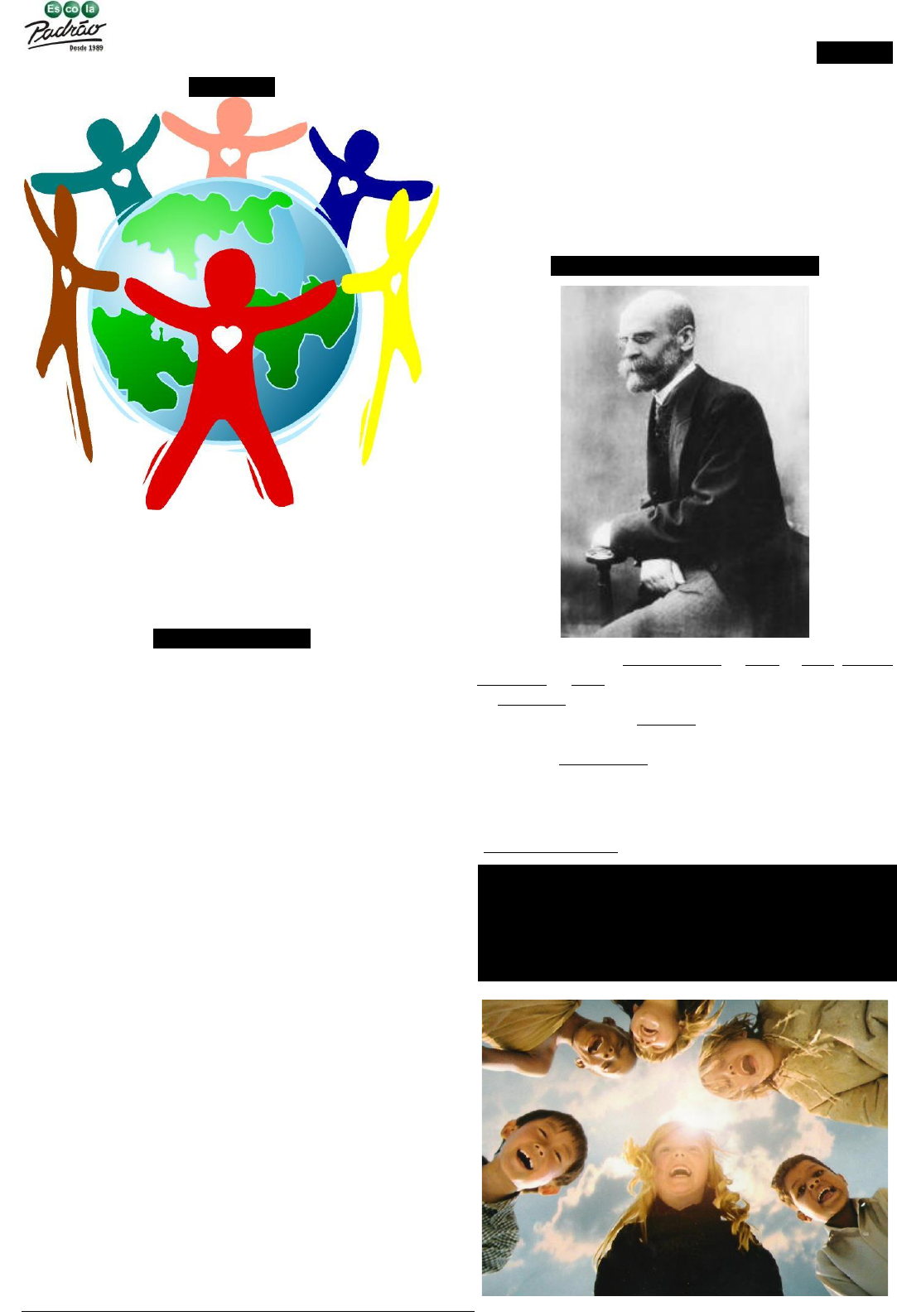 <p>Paixão por Aprender. Prazer em Ensinar.</p><p>EJA - EaD</p><p>Outono A2 /Sociologia</p><p>__________________________________________________________________________________________________________________________________________________________________________________________________________________</p><p>Rua Joaquim Murtinho, 2.293 - Bairro Itanhangá Park – (67) 3026-1665www.escolapadrao.com.br</p><p>21</p><p>SOCIOLOGIA</p><p>• O QUE A FIGURA ACIMA REPRESENTA?</p><p>• O QUE SIGNIFICA VIVER EM SOCIEDADE?</p><p>• POR QUE O SER HUMANO VIVE EM SOCIEDADE?</p><p>A VIDA EM SOCIEDADE</p><p>Desenvolvemos todas as nossas potencialidades</p><p>interagindo com outras pessoas o que nos torna de certa</p><p>forma dependentes uns dos outros direta ou indiretamente</p><p>pelo simples fatos de estamos vivendo em sociedade.</p><p>Vejamos o exemplo de um saboroso almoço no domingo em</p><p>família: O senhor José Taksumoto tem uma banca de</p><p>verduras e faz feira todos os dias da semana, exceto na sexta</p><p>à noite, pois toda a sua família é da Igreja Adventista e como</p><p>é sabido, ao pôr do sol na sexta a dedicação ao trabalho na</p><p>fera é substituído por um dia a Deus e a vida em</p><p>comunidade. Os Taksumotos dedicam-se a plantação de</p><p>verduras que será o complemento para o almoço de</p><p>domingo. Então, quando chegamos a feira, a família do</p><p>senhor José já selecionou as melhores verduras que</p><p>compraremos para fazer o almoço de domingo. Sendo assim,</p><p>indiretamente os Taksumotos estão envolvidos com o</p><p>almoço que será um momento de muita felicidade.</p><p>Então, se pensarmos no exemplo acima, note a</p><p>relação de dependência existente em um simples almoço.</p><p>Sendo assim, se focarmos na nossa infância evidenciaremos a</p><p>necessidade que temos dos nossos pais para quando</p><p>crescermos, aprendemos a fazer coisas sozinhas. Mesmo</p><p>quando saímos de casa e temos a nossa profissão</p><p>dependemos do nosso emprego, e mesmo se tivermos um</p><p>negócio próprio dependeríamos dos clientes, ou seja, somos</p><p>todos dependentes. Viver num círculo social não é uma</p><p>escolha apenas, mas sim uma necessidade. Dessa forma,</p><p>mesmo que uma pessoa vá morar sozinha em outro planeta</p><p>com todas as condições de sobrevivência, logo se sentiria</p><p>solitário, sentiria falta de afeto e calor humano e certamente</p><p>ficaria depressivo. Temos necessidade de interação com os</p><p>outros. Nossa constituição física e psicológica não permite</p><p>que vivamos a sós.</p><p>A sociedade é muito antiga, desde os primórdios da</p><p>humanidade, os homens já se organizavam com tarefas</p><p>estabelecidas para cada um. Visto isso é notável que</p><p>civilizações antigas tivessem seu próprio jeito de organizar a</p><p>vida em comum, com suas regras e leis, organização política,</p><p>manifestações religiosas e artísticas. Assim, é importante</p><p>observar que a vida em sociedade é organizada de acordo</p><p>com os valores que construímos e se modifica de acordo com</p><p>o tempo.</p><p>A SOCIOLOGIA PARA ÉMILE DURKHEIM</p><p>Émile Durkheim (15 de abril de 1858 — Paris, 15 de</p><p>novembro de 1917) é considerado um dos pais</p><p>da Sociologia tendo sido o fundador da escola francesa, que</p><p>combinava a pesquisa empírica com a teoria sociológica. É</p><p>amplamente reconhecido como um dos melhores teóricos do</p><p>conceito da coesão social.</p><p>Durkheim formou-se em Filosofia, porém sua obra</p><p>inteira é dedicada à Sociologia. Seu principal trabalho é na</p><p>reflexão e no reconhecimento da existência de uma</p><p>"consciência coletiva".</p><p>Ele parte do princípio que o homem seria apenas um</p><p>animal selvagem que só se tornou humano porque se</p><p>tornou sociável, ou seja, foi capaz de aprender hábitos e</p><p>costumes característicos de seu grupo social para poder</p><p>conviver no meio deste.</p><p>http://pt.wikipedia.org/wiki/15_de_abril</p><p>http://pt.wikipedia.org/wiki/1858</p><p>http://pt.wikipedia.org/wiki/Paris</p><p>http://pt.wikipedia.org/wiki/15_de_novembro</p><p>http://pt.wikipedia.org/wiki/15_de_novembro</p><p>http://pt.wikipedia.org/wiki/1917</p><p>http://pt.wikipedia.org/wiki/Sociologia</p><p>http://pt.wikipedia.org/wiki/Empirismo</p><p>http://pt.wikipedia.org/wiki/Coes%C3%A3o_social</p><p>http://pt.wikipedia.org/wiki/Consci%C3%AAncia_coletiva</p><p>Paixão por Aprender. Prazer em Ensinar.</p><p>EJA - EaD</p><p>Outono A2 /Sociologia</p><p>__________________________________________________________________________________________________________________________________________________________________________________________________________________</p><p>Rua Joaquim Murtinho, 2.293 - Bairro Itanhangá Park – (67) 3026-1665www.escolapadrao.com.br</p><p>22</p><p>A SOCIALIZAÇÃO</p><p>A este processo de aprendizagem, Durkheim chamou</p><p>de "Socialização", a consciência coletiva seria então formada</p><p>durante a nossa socialização e seria composta por tudo</p><p>aquilo que habita nossas mentes e que serve para nos</p><p>orientar como devemos ser, sentir e nos comportar. E esse</p><p>"tudo" ele chamou de "fatos sociais", e disse que esses eram</p><p>os verdadeiros objetos de estudo da Sociologia.</p><p>A MENTE HUMANA</p><p>Nem tudo que uma pessoa faz é um fato social,</p><p>para ser um fato social tem de atender a três características:</p><p>generalidade, exterioridade e coercitividade. Isto é, o que as</p><p>pessoas sentem, pensam ou fazem independente de suas</p><p>vontades individuais, é um comportamento estabelecido pela</p><p>sociedade. Não é algo que seja imposto especificamente a</p><p>alguém, é algo que já estava lá antes e que continua depois e</p><p>que não dá margem a escolhas.</p><p>O mérito de Durkheim aumenta ainda mais quando</p><p>publica seu livro "à nova ciência”. Era necessário revelar</p><p>as
