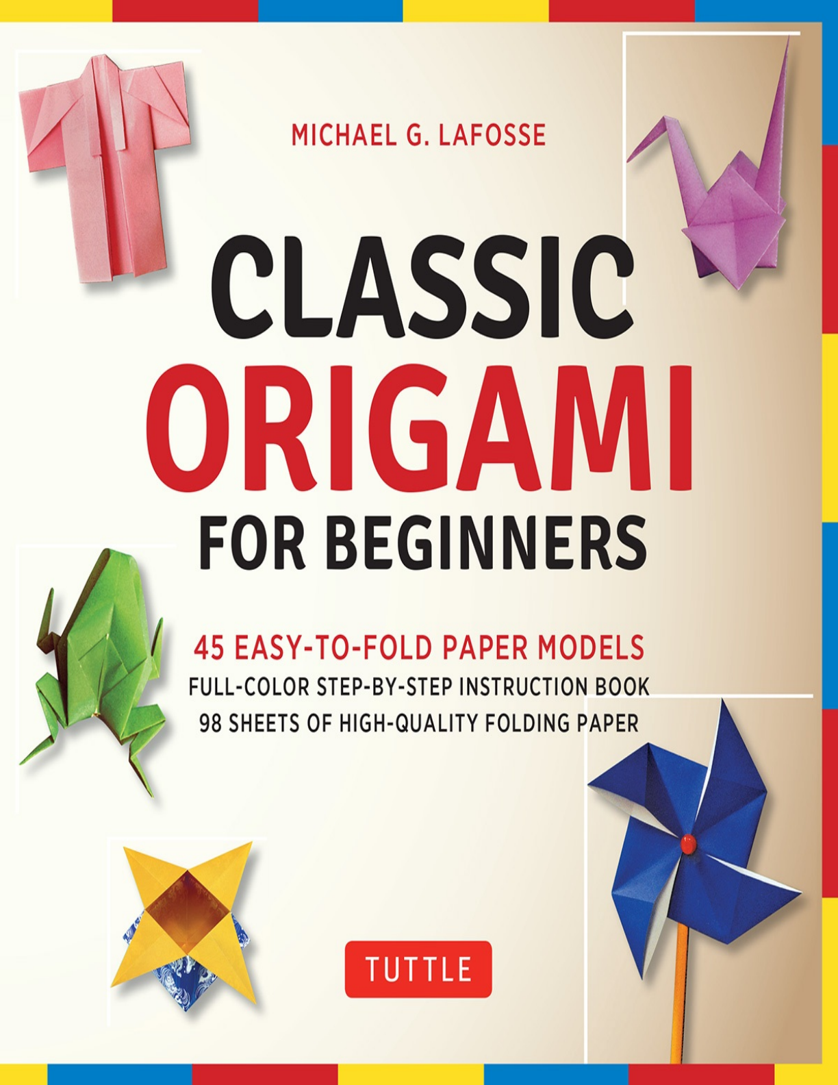 <p>CLASSIC</p><p>ORIGAMI</p><p>FOR BEGINNERS</p><p>MICHAEL G. LAFOSSE</p><p>Contents</p><p>Origami Symbols Key</p><p>Kite</p><p>Duck</p><p>Fish</p><p>Jumping Frog</p><p>Cup</p><p>Japanese House</p><p>Piano</p><p>Chopsticks Wrapper</p><p>Chopstick Rest</p><p>Knot Note</p><p>Fox Puppet</p><p>Newspaper Hat</p><p>Dart</p><p>Squid Plane</p><p>Bookmark</p><p>Samurai Helmet</p><p>Sailboat</p><p>Fishing Boat</p><p>Dory</p><p>Picture Frame</p><p>Pinwheel</p><p>Pajarita</p><p>Catamaran</p><p>Salt Cellar</p><p>Chinese Tea Table</p><p>Japanese Lantern</p><p>Paper Doll</p><p>Hakama</p><p>Lotus</p><p>Candy Box</p><p>Wallet</p><p>Chinese Junk</p><p>Masu</p><p>Swallow</p><p>Star Box</p><p>Kimono</p><p>Balloon</p><p>Bunny Balloon</p><p>Pagoda</p><p>Flapping Bird</p><p>Crane</p><p>Lily</p><p>Frog</p><p>Wreath</p><p>Fortune Cookie Box</p><p>Key to Origami Symbols</p><p>Crease Line</p><p>Fold in front</p><p>Fold and unfold</p><p>Fold behind</p><p>Turn paper over</p><p>Repeat behind</p><p>Push or pull</p><p>Blow air to inflate</p><p>Kite</p><p>Traditional Design</p><p>This is one of the simplest origami bases, a set of folds common to many origami</p><p>pieces. It shows how a few folds transform a square into a dynamic shape with</p><p>unlimited uses. Make several, and then tile them with glue or tape onto a card—eight</p><p>will form a flat starburst. Glue smaller kites of a different color for the contrasting</p><p>center. Fewer tiled kites make cupped flower blossoms.</p><p>1</p><p>2</p><p>Fold in half, corner to corner, and unfold.</p><p>Fold two edges to meet at the crease.</p><p>3Turn over.</p><p>4</p><p>5</p><p>The finished Kite.</p><p>Paste or tape the kites together on a greeting card or display board.</p><p>Use the origami kite to make decorative shapes—eight kites make a star. Make</p><p>large kites and small kites to add layers of color.</p><p>1</p><p>Duck</p><p>Traditional Design</p><p>This simple and charming origami duck illustrates “outside” reverse folds. Notice how the</p><p>paper is first pleated before folding the model in half. By pulling each segment outward</p><p>and pinching it at the correct angle, you can change the expression, or “attitude” of your</p><p>model. Fold a family from different sizes and colors.</p><p>Fold in half, corner to corner, and unfold.</p><p>2Fold two edges to meet at the crease.</p><p>3Turn over.</p><p>4</p><p>5</p><p>Fold up the bottom corner.</p><p>Fold corner to the bottom edge.</p><p>6</p><p>7</p><p>8</p><p>Mountain-fold in half.</p><p>Pull up the neck.</p><p>Pull up the beak.</p><p>9The finished Duck.</p><p>1</p><p>Fish</p><p>Traditional Design</p><p>This is an action model from a “fish base,” an efishient method of forming a slender</p><p>shape as long as the square’s diagonal. Folding the raw edges to the inner diagonal</p><p>completely covers the white side. This base cleverly produces a pair of “rabbit ears”—two</p><p>pointed flaps from the excess length which create upper and lower jaws of the hungry</p><p>toy.</p><p>Fold in half, corner to corner, both ways.</p><p>2</p><p>3</p><p>Fold two edges from the left side to meet at the crease. Unfold.</p><p>Fold two edges from the right side to meet at the crease. Unfold.</p><p>4</p><p>5</p><p>6</p><p>Fold all four edges to meet at the horizontal crease. Let the top and bottom corners</p><p>fold in half.</p><p>Fold in half, long corners to the right and short corners to the left.</p><p>Your paper should look like this.</p><p>7</p><p>8</p><p>Fold up the front tail point and fold down the back tail point.</p><p>The finished Fish. Move the tail fins apart to make the mouth open and close.</p><p>1</p><p>Jumping Frog</p><p>Michael G. LaFosse</p><p>This action model becomes a fun game of skill. Cut a square from a magazine’s reader</p><p>reply card (or other stiff paper). After a few easy folds, stretch the hind legs slightly.</p><p>Position your thumb behind the frog’s rear legs, while stroking your index finger down</p><p>the frog’s backside. This will cause it to spring forward. See how far away you can</p><p>launch your frog and hop into a target dish “pond”.</p><p>Fold in half, corner to corner.</p><p>2</p><p>3</p><p>4</p><p>Fold in half, corner to corner, and unfold.</p><p>Fold corners to meet at the center of the bottom edge.</p><p>Turn over.</p><p>5</p><p>6</p><p>Fold edges to meet in the middle. Let corners come out from behind.</p><p>Your paper will look like this. Turn over.</p><p>7</p><p>8</p><p>9</p><p>Fold up the bottom edge.</p><p>Fold down to the bottom edge.</p><p>Turn over.</p><p>10</p><p>11</p><p>Fold over paper for the eyes.</p><p>The finished Jumping Frog. Press on the back to make it jump!</p><p>Cup</p><p>Traditional Design</p><p>Michael folded and filled this model from his school’s water cooler, amazing his friends.</p><p>As an origami fan, you will probably have paper, which is handy when you want to share</p><p>drink from a larger container. Waxed paper from the kitchen makes a longer lasting cup,</p><p>but be careful not to use fancy papers with water-soluble dyes, coatings, or glitter!</p><p>Fold in half, corner to corner.</p><p>1</p><p>2</p><p>3</p><p>4</p><p>Fold right corner to the opposite edge.</p><p>Turn over.</p><p>Fold right corner to opposite corner.</p><p>5</p><p>6</p><p>Fold down the top corner. Repeat behind.</p><p>The finished Cup.</p><p>1</p><p>Japanese House</p><p>Traditional Design</p><p>These simple houses can adorn a greeting card, or be artfully arranged to lay out an</p><p>origami village with paper people, trees, birds and animals. Decorate them with drawn-on</p><p>bricks, shingles, doors, windows and shutters to reflect different types of architectural</p><p>styles. How would a Dutch door be depicted? How would Cape Cod windows be drawn?</p><p>Use different colors for the houses and roofs.</p><p>Fold in half, edge to edge.</p><p>2</p><p>3</p><p>4</p><p>5</p><p>Fold sides in to meet in the middle of the paper.</p><p>Open sides ou