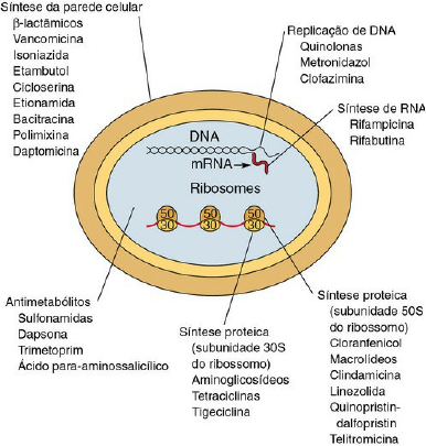 <p>Mecani smos de Ação de Antibacterianos</p><p>Agentes quimioterápicos tratam-se de fármacos utilizados no tratamento de doenças,neste caso, bacteriana. Os antimicrobianos podem ser antibacterianos, antifúngicos, antivirais e anti protozoários. Entre os antibacterianos está o antibiótico, como normalmente essa classe de fármacos é conhecida, porém, os antibióticos são produtos naturais de alguns organismos e estão englobados dentro da classe maior.</p><p>Um agente microbiano deve apresentar toxicidade seletiva, ou seja, que deve agir apenas contra os microrganismos patogênicos e não contra o hospedeiro, com seu mecanismo de ação não atacando nada na célula do hospedeiro, esse mecanismo pode ter efeito bacteriostático - não há morte das bactérias por atuação do fármaco, eles inibem o crescimento e a reprodução bacteriana, acionando o sistema imune para eliminá-las (o fármaco estaciona a proliferação) -, os quais não devem ser utilizados em imunodeficientes, ou efeito bactericida - capazes de matar ou lesar o irreversivelmente as bactérias.</p><p>Os antibacterianos são divididos em grupos quanto à sua estrutura, podendo ser químicos (Q), em que apresentam estruturas totalmente artificial; natural (N), os antibióticos, que têm origem de algum organismo; ou semi sintético (SS), no qual a estrutura de um antibacteriano natural é alterada para ter melhor eficácia. Quanto ao espectro de ação, eles podem ter o espectro restrito, ou seja, funciona contra um determinado grupo de bactérias, como a vancomicina contra Gram positivas e o ácido nalidíxico contra Gram negativas; ou pode ser de amplo espectro, atuando contra mais grupos de bactérias, como tetraciclina e ampicilina que agem contra Gram positivas e negativas.</p><p>Os antibacterianos podem interferir em diferentes atividades ou em estruturas típicas da célula bacteriana, como na inibição da síntese da parede celular (β-lactâmicos, glicopeptídios), inibição de síntese de proteínas (Macrolídeos, Tetraciclinas), inibição da síntese dos ácidos nucleico (do RNA - Rifampicina - ou do DNA - Fluoroquinolonas) ou lesão na membrana plasmática (polimixina).</p><p>A camada externa das bactérias é a parede celular, mantendo o tamanho, forma e pressão osmótica elevada na bactéria. Ela contém o mucopeptídeo, o peptideoglicano, um polipeptídeo que apresenta diversas ligações cruzadas, formado pelos monômeros aminoaçúcares N-acetilglicosamina (NAG) e ácido acetil murâmico (NAM) repetidos alternados, neles, no NAM, se ligam aminoácidos, formando cadeias peptídicas. A rigidez da parede celular se dá por ligações cruzadas entre as cadeias peptídicas por reação de transpeptidação (transpeptidases) e da ligação dessas cadeias com o peptidoglicano por meio de transglicosidases, atuam na junção dos monômeros no peptidoglicano, elas são chamadas de Proteínas Ligantes de Penicilina por serem alvo de β-lactâmicos. A maioria dos antibacterianos que interferem na síntese da parede celular bacteriana são classificados como β-lactâmicos, pois apresentam a estrutura em anel β-lactâmico. Eles atuam inibindo a síntese do peptideoglicano, sua síntese ocorre antes da divisão celular com autolisinas que degradam parcialmente o peptideoglicano, gerando colunas onde novos monômeros (partes) serão adicionados (adição de novos materiais à parede pré-existente), em que o bactoprenol transfere os monômeros para onde vai ocorrer a síntese. São exemplos de fármacos que atuam por inibição da síntese da parede celular as penicilinas, cefalosporinas e vancomicina.</p><p>Os β-lactâmicos se ligam a receptores celulares (como proteínas de ligação de penicilina PBP (Penicillin Binding Protein)), se ligando à enzimas transpeptidases, inibindo a reação de transpeptidação, o que bloqueia a síntese do peptideoglicano, uma vez que não forma as ligações cruzadas, e ocasiona a morte da bactéria em divisão. Em seguida, há aumento da atividade das autolisinas (enzima lítica), ocasionando a lise celular.</p><p>Essa classe de fármacos são de baixa toxicidade, uma vez que nos animais não há parede celular. A penicilina G é inativada pelo ácido gástrico; portanto, é usada principalmente como um fármaco por via intravenosa para o tratamento de infecções provocadas por um número limitado de organismos sensíveis. Penicilina V é mais resistente ao ácido gástrico e é a forma oral preferida para o tratamento de bactérias sensíveis a este fármaco. As cefalosporinas e cefamicinas têm o mesmo mecanismo de ação, no entanto, elas apresentam um espectro antibacteriano mais amplo, são resistentes a muitas β-lactamases, e têm melhores propriedades farmacocinéticas. Outra classe são os carbapenêmicos (amplo espectro) e monobactâmicos (usado contra bactérias aeróbicas Gram -, uma vantagem é proteger a população bacteriana normal)</p><p>Outra classe que inibe a síntese da parede celular são os glicopeptídeos como a vancomicina, que atua especificamente sobre Gram positivas. Ela interage com a porção terminal D-alanina-D-alanina das cadeias laterais, o que interfere estericamente na formação de pontes entre as cadeias de peptidoglicanos, impedindo espacialmente a ação da transpeptidase. A vancomicina é inativa contra bactérias Gram-negativas, porque a molécula é muito grande para atravessar os poros da membrana externa e atingir o sítio de destino no peptidoglicano. Ele é mais utilizado no uso hospitalar, para resistentes à penicilina.</p><p>Na inibição da função da membrana celular - barreira de permeabilidade seletiva -, como as membranas citoplasmáticas de bactérias e fungos têm estrutura diferente da dos animais, utiliza-se quimioterapia seletiva, para romper as membranas. A classe de polimixinas consiste em peptídeos cíclicos que atuam como detergentes e danificam seletivamente as membranas celulares que contenham f