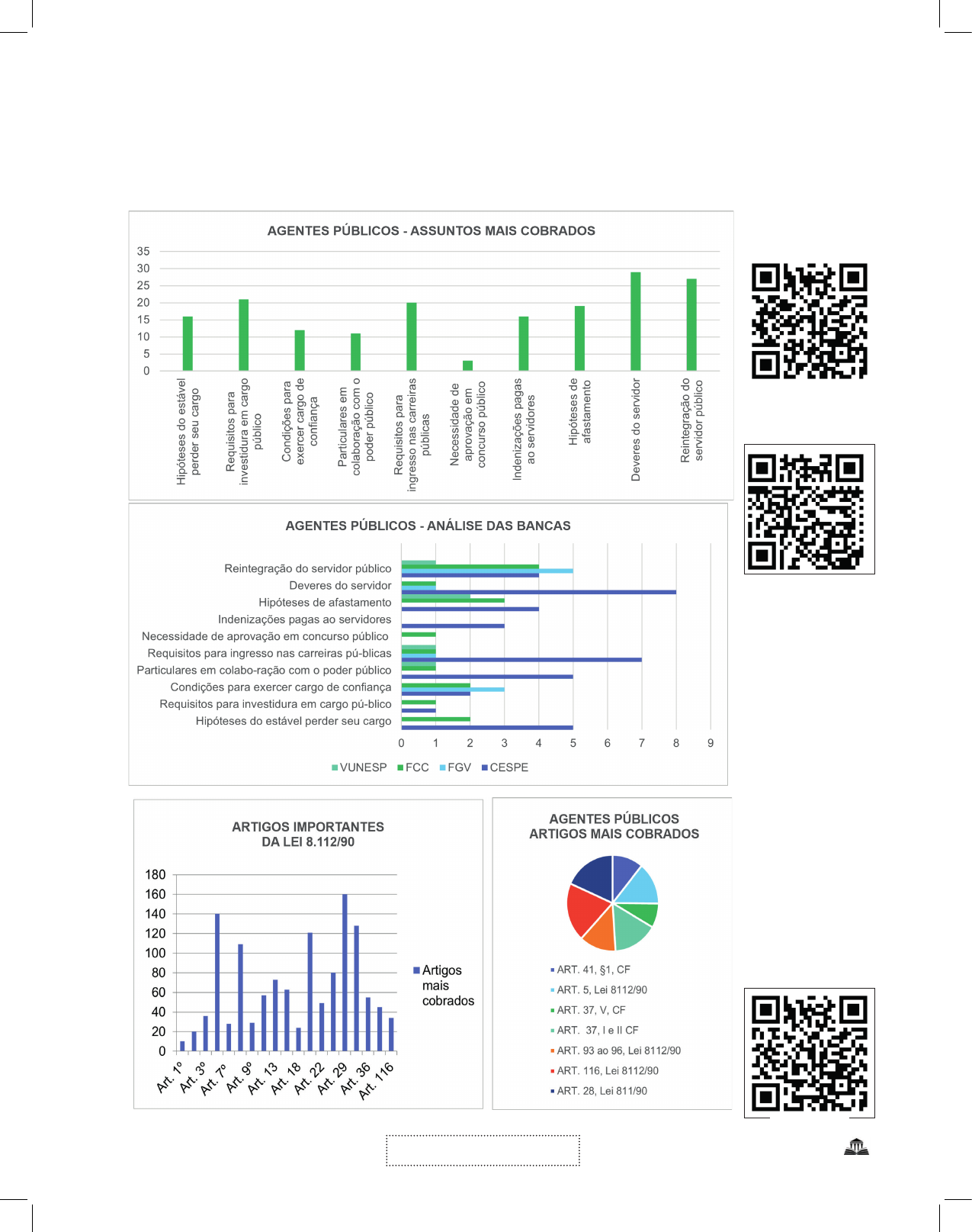 <p>131Número de acertos = ______</p><p>Questões resolvidas</p><p>VIII. AGENTES PÚBLICOS</p><p>PONTOS MAIS COBRADOS – Os gráficos abaixo demonstram os pontos mais cobrados dessa matéria, quais</p><p>sejam: servidores públicos que ocupam cargo de provimento efetivo, questões atinentes ao acesso a esses car-</p><p>gos, concurso público, estágio probatório, vencimentos e questões relativas ao PROCESSO ADMINISTRATIVO</p><p>DISCIPLINAR.</p><p>Questões</p><p>Videoaula</p><p>Audioaula</p><p>132 Número de acertos = ______</p><p>Questões resolvidas</p><p>CONCEITO</p><p>O termo agente público é uma designação genérica que abrange todas as pessoas que</p><p>desempenham funções públicas, mandato, cargo ou emprego estatal, de forma definitiva</p><p>ou transitória, remunerada ou gratuita. Nesse sentido, o art. 2º da Lei 8.429/1992 define:</p><p>“Art. 2° Para os efeitos desta Lei, consideram-se agente público o agente político, o</p><p>servidor público e todo aquele que exerce, ainda que transitoriamente ou sem remu-</p><p>neração, por eleição, nomeação, designação, contratação ou qualquer outra forma de</p><p>investidura ou vínculo, mandato, cargo, emprego ou função nas entidades referidas no art. 1º desta Lei.</p><p>(Redação dada pela Lei nº 14.230, de 2021)”</p><p>Portanto, os agentes políticos, os militares, os servidores públicos, os particulares em colaboração e todos aque-</p><p>les que desempenham em algum momento a função estatal são considerados agentes públicos.</p><p>AGENTES POLÍTICOS</p><p>Os agentes políticos são aqueles que exercem a função pública de alta direção do Estado e compõem a</p><p>cúpula diretiva do Governo. A vinculação desses agentes com o Poder Público é uma vinculação estatutária,</p><p>estabelecida mediante o ingresso desses à máquina estatal, em regra, por meio das eleições. Ex: Presidente da</p><p>República, Parlamentares, Governadores, Prefeitos, Ministros, Secretários, etc. Destaca-se que os cargos de</p><p>Ministro de Estado e Secretário são cargos políticos, haja vista que são cargos ligados à alta gestão, a despeito</p><p>do fato de que o ingresso desses agentes à máquina estatal não ocorre através das eleições, e sim mediante a</p><p>nomeação para o exercício de cargos em comissão.</p><p>A competência dos agentes políticos encontra expressa previsão constitucional e, em virtude do alto escalona-</p><p>mento desses agentes, esses não estão sujeitos às regras gerais aplicáveis aos servidores públicos. Ademais,</p><p>convém destacar que não há relação de hierarquia entre os agentes políticos. Assim, é incorreto afirmar que um</p><p>governador ou secretário de Estado, por exemplo, esteja subordinado ao Presidente da República.</p><p>Cumpre ressaltar que alguns autores, como Hely Lopes Meirelles, entendem que os magistrados e os membros</p><p>do Ministério Público também se encontram inseridos nessa categoria de agentes políticos. Há, ainda, corrente</p><p>que defende que os membros dos Tribunais de Contas são agentes políticos.</p><p>SERVIDORES EFETIVOS</p><p>A palavra “efetivo” transmite a noção de continuidade, permanência, manutenção do agente na prestação daque-</p><p>la atividade. De fato, os cargos de provimento efetivo serão ocupados, em caráter definitivo, por agentes</p><p>admitidos por meio de Concurso Público. Esses agentes, após aprovação no Concurso, estabelecem um</p><p>vínculo estatutário (não contratual - o Estatuto é a Lei da carreira) com o ente estatal e poderão adquirir a tão</p><p>sonhada estabilidade. Esse regime garante a estabilidade/permanência do servidor público no exercício de suas</p><p>funções, protegendo-o contra influências políticas e partidárias.</p><p>O regime estatutário desses agentes é o regime adotado para fins de provimento de cargos públicos pelos entes</p><p>da Administração Pública Direta, Autarquias, Fundações e Associações Públicas, ou seja, pelas entidades que</p><p>possuem personalidade jurídica de direito público. Portanto, os servidores efetivos desempenham suas fun-</p><p>ções nessas entidades. Desse modo, dispõe o caput do art. 41 da CF/88:</p><p>Art. 41. São estáveis após três anos de efetivo exercício os servidores nomeados para</p><p>cargo de provimento efetivo em virtude de concurso público.</p><p>Posicionamento do</p><p>CESPE</p><p>FICA A DICA</p><p>Em razão do fato de não se tratar de vínculo de natureza contratual, o ente público poderá promover alter-</p><p>ação unilateral no regime aplicável aos servidores estatutários, desde que sejam respeitados os direitos</p><p>adquiridos.</p><p>Portanto, o servidor público não tem direito adquirido à imutabilidade de seu regime jurídico, de sorte</p><p>que não há violação a direito quando se altera, por exemplo, a jornada de trabalho ou escalonamento</p><p>hierárquico da carreira. Questões</p><p>Audioaula</p><p>133Número de acertos = ______</p><p>Questões resolvidas</p><p>Destaca-se que durante o período de três anos</p><p>iniciais de exercício, denominado período proba-</p><p>tório, o agente será submetido a uma avaliação</p><p>especial de desempenho e a aquisição da es-</p><p>tabilidade estará condicionada a um resultado</p><p>satisfatório nessa avaliação. Essa avaliação</p><p>tem a finalidade de verificar se o servidor, no exer-</p><p>cício de suas funções, atende ao Princípio da Efi-</p><p>ciência previsto no caput do artigo 37 da CR/88.</p><p>Contudo, é importante lembrar que a avaliação de desempenho não</p><p>acontece apenas durante o estágio probatório. A referida avaliação</p><p>também será promovida depois que o servidor já alcançou a estabilidade administrativa, pois este deve continuar</p><p>sendo eficiente na prestação dos serviços.</p><p>Adquirida a estabilidade, o servidor somente poderá perder o cargo nas hipóteses previstas n