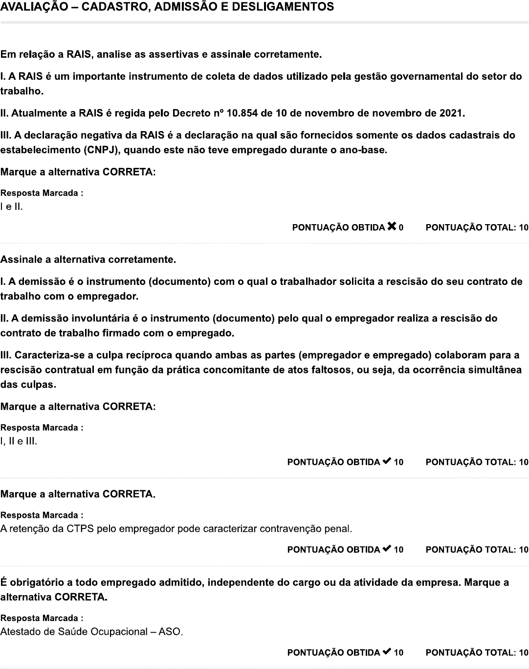 <p>AVALIAÇÃO - CADASTRO, ADMISSÃO E DESLIGAMENTOS Em relação a RAIS, analise as assertivas e assinale corretamente. I. A RAIS é um importante instrumento de coleta de dados utilizado pela gestão governamental do setor do trabalho. II. Atualmente a RAIS é regida pelo Decreto n° 10.854 de 10 de novembro de novembro de 2021. III. A declaração negativa da RAIS é a declaração na qual são fornecidos somente os dados cadastrais do estabelecimento (CNPJ), quando este não teve empregado durante o ano-base. Marque a alternativa CORRETA: Resposta Marcada : I e II. PONTUAÇÃO OBTIDA 0 PONTUAÇÃO TOTAL: 10 Assinale a alternativa corretamente. I. A demissão é o instrumento (documento) com o qual o trabalhador solicita a rescisão do seu contrato de trabalho com o empregador. II. A demissão involuntária é o instrumento (documento) pelo qual o empregador realiza a rescisão do contrato de trabalho firmado com o empregado. III. Caracteriza-se a culpa recíproca quando ambas as partes (empregador e empregado) colaboram para a rescisão contratual em função da prática concomitante de atos faltosos, ou seja, da ocorrência simultânea das culpas. Marque a alternativa CORRETA: Resposta Marcada : I, e III. PONTUAÇÃO OBTIDA 10 PONTUAÇÃO TOTAL: 10 Marque a alternativa CORRETA. Resposta Marcada : A retenção da CTPS pelo empregador pode caracterizar contravenção penal. PONTUAÇÃO OBTIDA 10 PONTUAÇÃO TOTAL: 10 É obrigatório a todo empregado admitido, independente do cargo ou da atividade da empresa. Marque a alternativa CORRETA. Resposta Marcada : Atestado de Saúde Ocupacional - ASO. PONTUAÇÃO OBTIDA 10 PONTUAÇÃO TOTAL: 10</p><p>Representa um programa destinado a promover a integração do empregado na vida e no desenvolvimento das empresas, viabilizando melhor distribuição na renda nacional. Marque a alternativa CORRETA. Resposta Marcada : PIS. PONTUAÇÃO OBTIDA 10 PONTUAÇÃO TOTAL: 10 Sobre o tema estudado "Preenchimento de documentos" marque V para verdadeiro e F para falso. ( ) Alguns documentos que fazem parte da organização da relação de emprego são considerados formalidades obrigatórias. ( ) Anotações da CTPS - devem ser anotados os dados de identificação do empregador e as informações básicas da contratação, tais como, cargo, admissão, registro e valor da remuneração. ( ) Termo de responsabilidade de salário-família - é parte integrante da ficha de salário-família. ( ) Incluir o nome do empregado no cadastro de empregados e desempregados - CAGED. Assinale a alternativa CORRETA: Resposta Marcada : F, V, V, V. PONTUAÇÃO OBTIDA 0 PONTUAÇÃO TOTAL: 10 Em relação ao cadastro, assinale a alternativa corretamente de acordo com os estudos ministrados: I. A lei trabalhista oferece dois opções para fazer o registro dos empregados. II. o processo para cadastro de funcionários pode variar bastante, dependendo do modo de registro utilizado. III. Os dados coletados ainda devem ser armazenados, dispostos e atualizados com frequência, do contrário, podem não contemplar a necessidade da empresa ou ficar obsoletos demais. Marque a alternativa CORRETA: Resposta Marcada : I, e III. PONTUAÇÃO OBTIDA 0 PONTUAÇÃO TOTAL: 10 Seguindo as exigências traçadas pela legislação brasileira, os documentos necessários para a admissão do funcionário são, EXCETO: Resposta Marcada : Cpia da certidão de nascimento de filhos maiores de 12 anos para fins de recebimento de salário-família. PONTUAÇÃO OBTIDA 10 PONTUAÇÃO TOTAL: 10</p><p>Leia atentamente as assertivas e assinale corretamente de acordo com os estudos. I. A ficha ou livro de registro do empregado é um documento no qual deve constar, obrigatoriamente, todas as informações do empregador e do empregado, principalmente sobre admissão, cargo, salário, horário e local de trabalho. II. Tanto o livro quanto a ficha são registrados pelo fiscal do trabalho, quando de sua visita ao local da relação de emprego, devendo ficar à disposição da fiscalização pelo período mínimo de 12 meses. Marque a alternativa CORRETA: Resposta Marcada : Apenas I. PONTUAÇÃO OBTIDA 0 PONTUAÇÃO TOTAL: 10 o contrato por prazo determinado somente é admitido, tratando-se de, EXCETO: Resposta Marcada : De acordo com o artigo 45 da CLT, é permitida a prorrogação do contrato por prazo determinado por uma única vez, porém não pode ultrapassar o período de três anos ou 90 dias. PONTUAÇÃO OBTIDA 10 PONTUAÇÃO TOTAL: 10 Total</p>