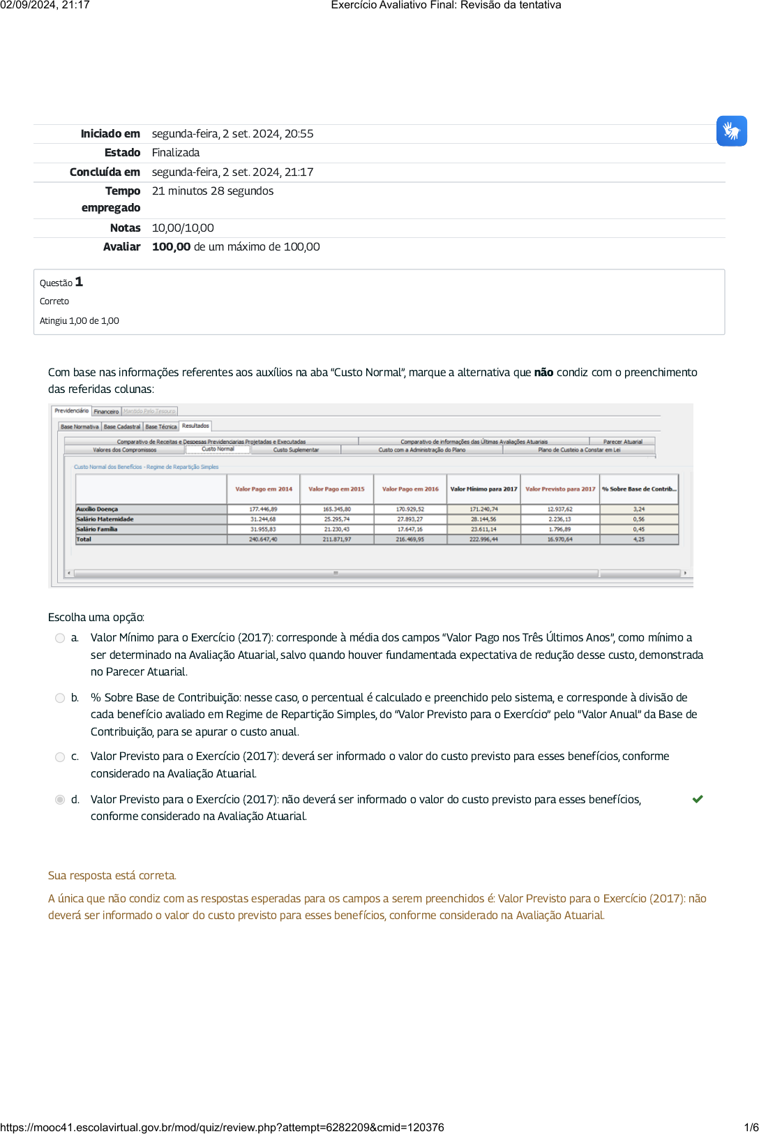 <p>Iniciado em segunda-feira, 2 set. 2024, 20:55</p><p>Estado Finalizada</p><p>Concluída em segunda-feira, 2 set. 2024, 21:17</p><p>Tempo</p><p>empregado</p><p>21 minutos 28 segundos</p><p>Notas 10,00/10,00</p><p>Avaliar 100,00 de um máximo de 100,00</p><p>Questão 1</p><p>Correto</p><p>Atingiu 1,00 de 1,00</p><p>Com base nas informações referentes aos auxílios na aba “Custo Normal”, marque a alternativa que não condiz com o preenchimento</p><p>das referidas colunas:</p><p>Escolha uma opção:</p><p>a. Valor Mínimo para o Exercício (2017): corresponde à média dos campos “Valor Pago nos Três Últimos Anos”, como mínimo a</p><p>ser determinado na Avaliação Atuarial, salvo quando houver fundamentada expectativa de redução desse custo, demonstrada</p><p>no Parecer Atuarial.</p><p>b. % Sobre Base de Contribuição: nesse caso, o percentual é calculado e preenchido pelo sistema, e corresponde à divisão de</p><p>cada benefício avaliado em Regime de Repartição Simples, do “Valor Previsto para o Exercício” pelo “Valor Anual” da Base de</p><p>Contribuição, para se apurar o custo anual.</p><p>c. Valor Previsto para o Exercício (2017): deverá ser informado o valor do custo previsto para esses benefícios, conforme</p><p>considerado na Avaliação Atuarial.</p><p>d. Valor Previsto para o Exercício (2017): não deverá ser informado o valor do custo previsto para esses benefícios,</p><p>conforme considerado na Avaliação Atuarial.</p><p></p><p>Sua resposta está correta.</p><p>A única que não condiz com as respostas esperadas para os campos a serem preenchidos é: Valor Previsto para o Exercício (2017): não</p><p>deverá ser informado o valor do custo previsto para esses benefícios, conforme considerado na Avaliação Atuarial.</p><p>02/09/2024, 21:17 Exercício Avaliativo Final: Revisão da tentativa</p><p>https://mooc41.escolavirtual.gov.br/mod/quiz/review.php?attempt=6282209&cmid=120376 1/6</p><p>Questão 2</p><p>Correto</p><p>Atingiu 1,00 de 1,00</p><p>Questão 3</p><p>Correto</p><p>Atingiu 1,00 de 1,00</p><p>Conforme o que estudamos sobre os elementos da Base Técnica no nosso curso DRAA, assinale a opção em que estão listados os</p><p>regimes �nanceiros que podem ser utilizados no RPPS.</p><p>Escolha uma opção:</p><p>a. Somente Repartição de Capitais de Cobertura.</p><p>b. Somente Capitalização.</p><p>c. Capitalização, Repartição de Capitais de Cobertura e Repartição Simples. </p><p>d. Somente Repartição Simples.</p><p>e. Nenhuma das anteriores.</p><p>Sua resposta está correta.</p><p>Segundo a Portaria nº 403/2008, podem ser utilizados os regimes �nanceiros de Capitalização como mínimo utilizável para benefícios</p><p>programados; Repartição de Capitais de Cobertura como mínimo utilizável para benefícios de risco; e Repartição Simples como mínimo</p><p>utilizável para benefícios temporários de risco.</p><p>Como vimos, entre as informações relativas à classi�cação da população coberta, temos o tipo de segurado. Em relação às opções que</p><p>caracterizam o grupo de segurados civis, assinale a alternativa correta.</p><p>Escolha uma opção:</p><p>a. Servidores, Aposentados e Pensionistas.</p><p>b. Servidores, Servidores Iminentes e Aposentados.</p><p>c. Servidores, Servidores Iminentes e Pensionistas.</p><p>d. Servidores, Servidores Iminentes, Aposentados e Pensionistas. </p><p>e. Servidores e Aposentados.</p><p>Sua resposta está correta.</p><p>A relação correta é Servidores, Servidores Iminentes, Aposentados e Pensionistas, pois nela estão listadas todas as opções do primeiro</p><p>combo que caracterizam o tipo da população coberta.</p><p>02/09/2024, 21:17 Exercício Avaliativo Final: Revisão da tentativa</p><p>https://mooc41.escolavirtual.gov.br/mod/quiz/review.php?attempt=6282209&cmid=120376 2/6</p><p>Questão 4</p><p>Correto</p><p>Atingiu 1,00 de 1,00</p><p>Questão 5</p><p>Correto</p><p>Atingiu 1,00 de 1,00</p><p>De acordo com as hipóteses de Projeção de Crescimento Real do Salário, Projeção da Taxa de Rotatividade e Critérios da Projeção de</p><p>Novos Entrantes, é correto falar que:</p><p>I – A rotatividade máxima admitida será de 1% ao ano;</p><p>II – A taxa real mínima de crescimento da remuneração ao longo da carreira será de 1% ao ano;</p><p>III – Não há regras especí�cas para o critério de novos entrantes na legislação vigente;</p><p>IV – A expectativa de reposição de servidores não poderá resultar em aumento da massa de segurados ativos, e os critérios deverão ser</p><p>demonstrados e justi�cados na Nota Técnica Atuarial.</p><p>Escolha uma opção:</p><p>a. I, II e III são corretas.</p><p>b. I e II são corretas.</p><p>c. Somente III é correta.</p><p>d. Somente IV é correta.</p><p>e. I, II e IV são corretas. </p><p>Sua resposta está correta.</p><p>De acordo com a Portaria nº 403/2008, a rotatividade máxima admitida será de 1% ao ano, a expectativa de reposição de servidores</p><p>não poderá resultar em aumento da massa de segurados ativos e os critérios deverão ser demonstrados e justi�cados na Nota Técnica</p><p>Atuarial, assim como a taxa real mínima de crescimento da remuneração ao longo da carreira será de 1% ao ano.</p><p>Tendo em vista as alíquotas de contribuição para os servidores públicos ativos da União, qual é a alíquota estabelecida para servidores</p><p>públicos ativos, de quaisquer dos Poderes da União?</p><p>Escolha uma opção:</p><p>a. 10%.</p><p>b. 11%. </p><p>c. 12%.</p><p>d. 13%.</p><p>Sua resposta está correta.</p><p>Atenção: cabe atentar-se que é para servidores públicos ativos, de quaisquer dos Poderes da União.</p><p>02/09/2024, 21:17 Exercício Avaliativo Final: Revisão da tentativa</p><p>https://mooc41.escolavirtual.gov.br/mod/quiz/review.php?attempt=6282209&cmid=120376 3/6</p><p>Questão 6</p><p>Correto</p><p>Atingiu 1,00 de 1,00</p><p>Questão 7</p><p>Correto</p><p>Ati