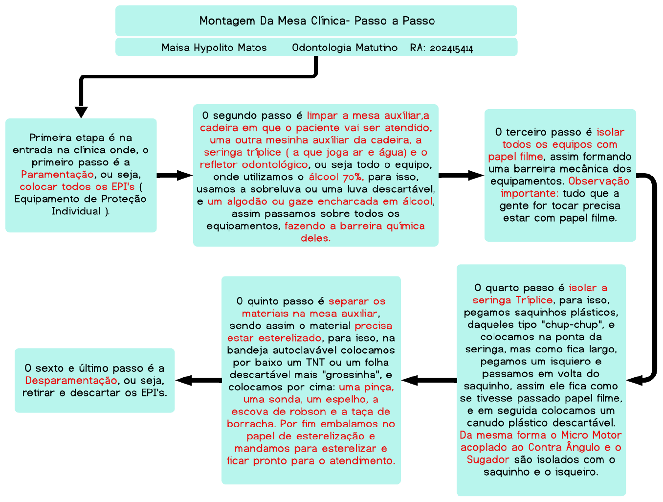 <p>Montagem Da Mesa Clínica- Passo a Passo Maisa Hypolito Matos Odontologia Matutino RA: 202415414 o segundo passo é limpar a mesa cadeira em que paciente vai ser atendido, o terceiro passo é isolar Primeira etapa é na uma outra mesinha auxíliar da cadeira, a entrada na clínica onde, todos os equipos com seringa tríplice ( a que joga e água) e primeiro passo é a papel filme, assim formando refletor odontológico, ou seja todo equipo, uma barreira mecânica dos Paramentação, ou seja, onde utilizamos álcool para isso, equipamentos. Observação colocar todos os EPI's ( usamos a sobreluva ou uma luva descartável, Equipamento de Proteção importante: tudo que a e um algodão ou gaze encharcada em álcool, Individual ). gente for tocar precisa assim passamos sobre todos os estar com papel filme. equipamentos, fazendo a barreira química deles. o quarto passo é isolar a o quinto passo é separar os seringa Tríplice, para isso, materiais na mesa auxiliar, pegamos saquinhos plásticos, sendo assim material precisa daqueles tipo "chup-chup", e estar esterelizado, para isso, na colocamos na ponta da bandeja autoclavável colocamos seringa, mas como fica largo, por baixo um TNT ou um folha pegamos um isquiero e sexto e último passo é a descartável mais "grossinha", e passamos em volta do Desparamentação, ou seja, colocamos por cima: uma pinça, saquinho, assim ele fica como retirar e descartar os EPI's. uma sonda, um espelho, a se tivesse passado papel filme, escova de robson e a taça de e em seguida colocamos um borracha. Por fim embalamos no canudo plástico descartável. papel de esterelização e Da mesma forma Micro Motor mandamos para esterelizar e acoplado ao Contra e ficar pronto para atendimento. Sugador são isolados com saquinho e isqueiro.</p>