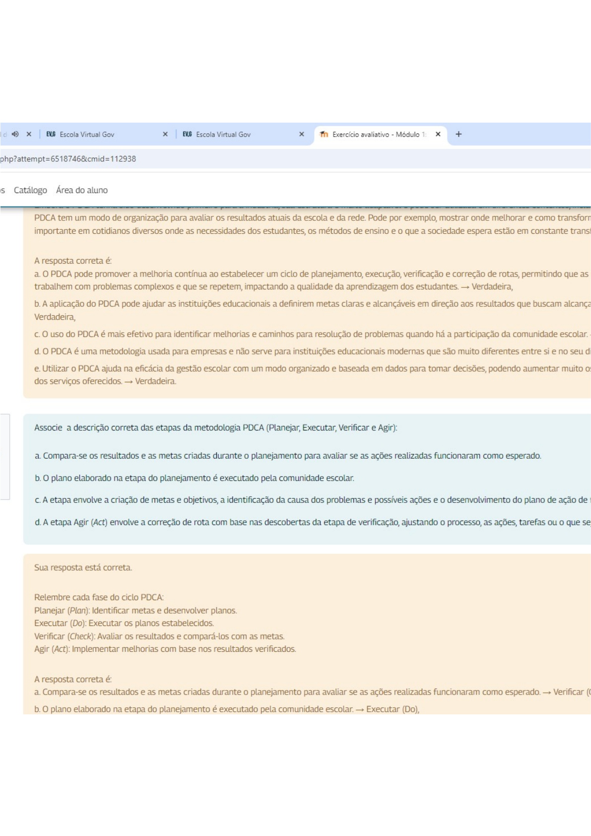 <p>EV.G Escola Virtual Gov Escola Virtual Gov in Exercício avaliativo - Módulo 1: + Catálogo Área do aluno PDCA tem um modo de organização para avaliar os resultados atuais da escola e da rede. Pode por exemplo, mostrar onde melhorar e como transform importante em cotidianos diversos onde as necessidades dos estudantes, os métodos de ensino e o que a sociedade espera estão em constante transt A resposta correta é: a. o PDCA pode promover a melhoria contínua ao um ciclo de planejamento, execução, verificação e correção de rotas, permitindo que as trabalhem com problemas complexos e que se repetem, impactando a qualidade da aprendizagem dos Verdadeira, b. A aplicação do PDCA pode ajudan as instituições educacionais a definirem metas claras e alcançáveis em direção aos resultados que buscam alcança Verdadeira, o uso do PDCA é mais efetivo para identificar melhorias e caminhos para resolução de problemas quando há a participação da comunidade escolar. d. o PDCA é uma metodologia usada para empresas e não serve para instituições educacionais modernas que são muito diferentes entre si e no seu d e. Utilizar PDCA ajuda na eficácia da gestão escolar com um modo organizado e baseada em dados para tomar decisões, podendo aumentar muito os dos serviços oferecidos. Associe a descrição correta das etapas da metodologia PDCA (Planejar, Executar, Verificar e Agir): a. Compara-se os resultados e as metas criadas durante o planejamento para se as ações realizadas funcionaram como esperado. b. o plano elaborado na etapa do planejamento é executado pela comunidade escolar. C. A etapa envolve a criação de metas e objetivos, a identificação da causa dos problemas e possíveis ações e o desenvolvimento do plano de ação de d. A etapa Agir (Act) envolve a correção de rota com base nas descobertas da etapa de verificação, ajustando o processo, as ações, tarefas ou o que se Sua resposta está correta. Relembre cada fase do ciclo PDCA: (Plan): Identificar metas e desenvolver planos. Executar (Do): Executar os planos estabelecidos. Verificar (Check): os resultados e compará-los com as Agir (Act): Implementar melhorias com base nos resultados verificados. A resposta correta é: a. Compara-se os resultados e as metas criadas durante o planejamento para avaliar se as ações realizadas funcionaram como esperado. Verificar b. o plano elaborado na etapa do planejamento é executado pela comunidade escolar. Executar (Do),</p>