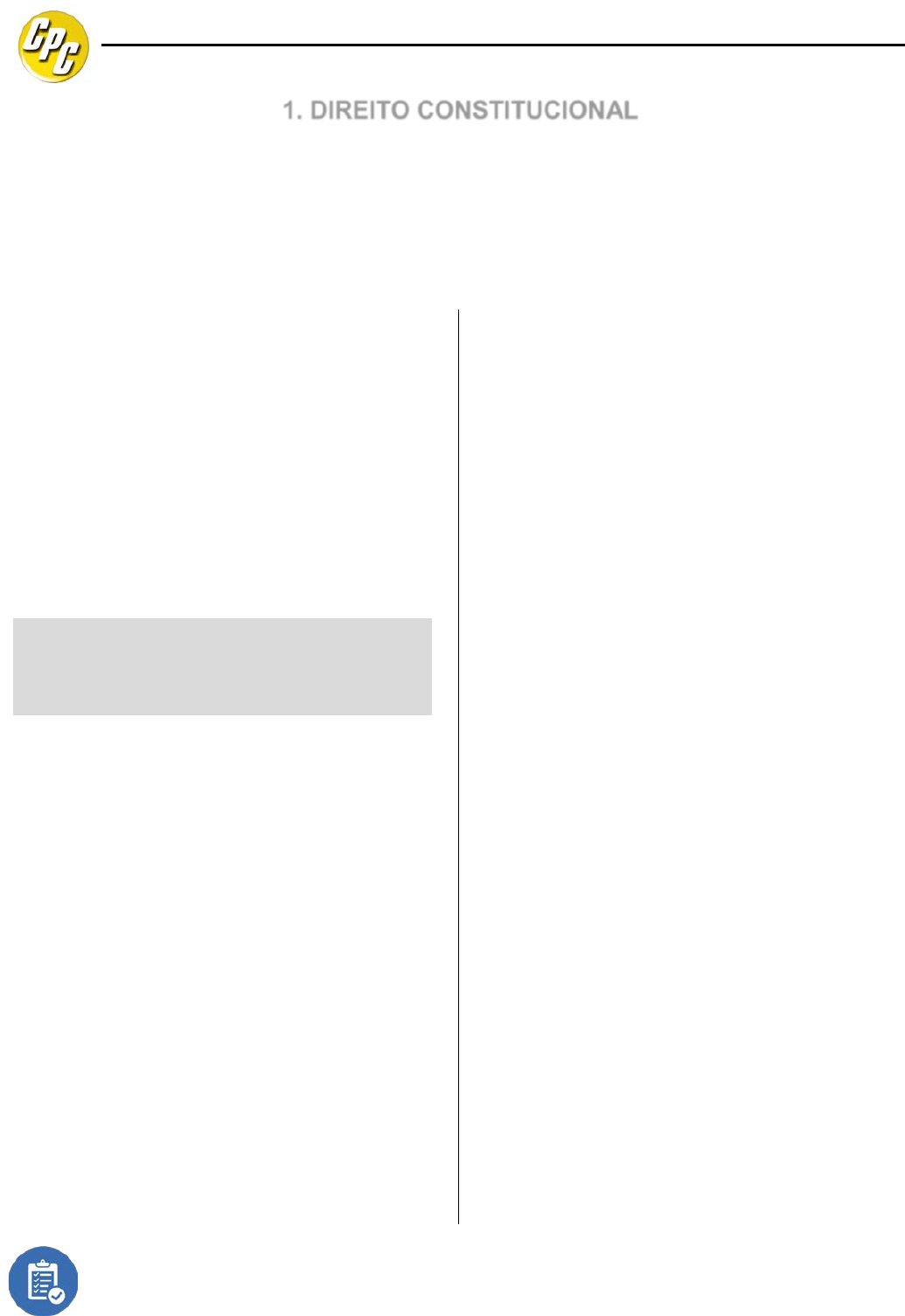 <p>1</p><p>#CPCpreparaecuida</p><p>WWW.CPCCONCURSOS.COM.BR</p><p>1. DIREITO CONSTITUCIONAL</p><p>CONSTITUIÇÃO FEDERAL:</p><p>• Dos direitos e deveres individuais e coletivos: art. 5º.</p><p>• Dos direitos sociais: arts. 6º a 11.</p><p>• Da administração pública: arts. 37 a 43.</p><p>• Do Poder Judiciário: arts. 92 a 126.</p><p>• Das funções essenciais à Justiça: arts. 127 a 135.</p><p>CONSTITUIÇÃO FEDERAL</p><p>PREÂMBULO</p><p>Nós, representantes do povo brasileiro, reunidos em</p><p>Assembléia Nacional Constituinte para instituir um Estado</p><p>Democrático, destinado a assegurar o exercício dos direitos</p><p>sociais e individuais, a liberdade, a segurança, o bem-estar, o</p><p>desenvolvimento, a igualdade e a justiça como valores</p><p>supremos de uma sociedade fraterna, pluralista e sem</p><p>preconceitos, fundada na harmonia social e comprometida, na</p><p>ordem interna e internacional, com a solução pacífica das</p><p>controvérsias, promulgamos, sob a proteção de Deus, a</p><p>seguinte CONSTITUIÇÃO DA REPÚBLICA FEDERATIVA DO</p><p>BRASIL.</p><p>TÍTULO II</p><p>DOS DIREITOS E GARANTIAS FUNDAMENTAIS</p><p>CAPÍTULO I</p><p>DOS DIREITOS E DEVERES INDIVIDUAIS E COLETIVOS</p><p>Art. 5º Todos são iguais perante a lei, sem distinção de</p><p>qualquer natureza, garantindo-se aos brasileiros e aos</p><p>estrangeiros residentes no País a inviolabilidade do direito à</p><p>vida, à liberdade, à igualdade, à segurança e à propriedade,</p><p>nos termos seguintes:</p><p>I - homens e mulheres são iguais em direitos e obrigações,</p><p>nos termos desta Constituição;</p><p>II - ninguém será obrigado a fazer ou deixar de fazer alguma</p><p>coisa senão em virtude de lei;</p><p>III - ninguém será submetido a tortura nem a tratamento</p><p>desumano ou degradante;</p><p>IV - é livre a manifestação do pensamento, sendo vedado o</p><p>anonimato;</p><p>V - é assegurado o direito de resposta, proporcional ao</p><p>agravo, além da indenização por dano material, moral ou à</p><p>imagem;</p><p>VI - é inviolável a liberdade de consciência e de crença, sendo</p><p>assegurado o livre exercício dos cultos religiosos e garantida,</p><p>na forma da lei, a proteção aos locais de culto e a suas</p><p>liturgias;</p><p>VII - é assegurada, nos termos da lei, a prestação de</p><p>assistência religiosa nas entidades civis e militares de</p><p>internação coletiva;</p><p>VIII - ninguém será privado de direitos por motivo de crença</p><p>religiosa ou de convicção filosófica ou política, salvo se as</p><p>invocar para eximir-se de obrigação legal a todos imposta e</p><p>recusar-se a cumprir prestação alternativa, fixada em lei;</p><p>IX - é livre a expressão da atividade intelectual, artística,</p><p>científica e de comunicação, independentemente de censura</p><p>ou licença;</p><p>X - são invioláveis a intimidade, a vida privada, a honra e a</p><p>imagem das pessoas, assegurado o direito a indenização pelo</p><p>dano material ou moral decorrente de sua violação;</p><p>XI - a casa é asilo inviolável do indivíduo, ninguém nela</p><p>podendo penetrar sem consentimento do morador, salvo em</p><p>caso de flagrante delito ou desastre, ou para prestar socorro,</p><p>ou, durante o dia, por determinação judicial;</p><p>XII - é inviolável o sigilo da correspondência e das</p><p>comunicações telegráficas, de dados e das comunicações</p><p>telefônicas, salvo, no último caso, por ordem judicial, nas</p><p>hipóteses e na forma que a lei estabelecer para fins de</p><p>investigação criminal ou instrução processual penal;</p><p>XIII - é livre o exercício de qualquer trabalho, ofício ou</p><p>profissão, atendidas as qualificações profissionais que a lei</p><p>estabelecer;</p><p>XIV - é assegurado a todos o acesso à informação e</p><p>resguardado o sigilo da fonte, quando necessário ao exercício</p><p>profissional;</p><p>XV - é livre a locomoção no território nacional em tempo de</p><p>paz, podendo qualquer pessoa, nos termos da lei, nele entrar,</p><p>permanecer ou dele sair com seus bens;</p><p>XVI - todos podem reunir-se pacificamente, sem armas, em</p><p>locais abertos ao público, independentemente de autorização,</p><p>desde que não frustrem outra reunião anteriormente</p><p>convocada para o mesmo local, sendo apenas exigido prévio</p><p>aviso à autoridade competente;</p><p>2</p><p>#CPCpreparaecuida</p><p>WWW.CPCCONCURSOS.COM.BR</p><p>XVII - é plena a liberdade de associação para fins lícitos,</p><p>vedada a de caráter paramilitar;</p><p>XVIII - a criação de associações e, na forma da lei, a de</p><p>cooperativas independem de autorização, sendo vedada a</p><p>interferência estatal em seu funcionamento;</p><p>XIX - as associações só poderão ser compulsoriamente</p><p>dissolvidas ou ter suas atividades suspensas por decisão</p><p>judicial, exigindo-se, no primeiro caso, o trânsito em julgado;</p><p>XX - ninguém poderá ser compelido a associar-se ou a</p><p>permanecer associado;</p><p>XXI - as entidades associativas, quando expressamente</p><p>autorizadas, têm legitimidade para representar seus filiados</p><p>judicial ou extrajudicialmente;</p><p>XXII - é garantido o direito de propriedade;</p><p>XXIII - a propriedade atenderá a sua função social;</p><p>XXIV - a lei estabelecerá o procedimento para desapropriação</p><p>por necessidade ou utilidade pública, ou por interesse social,</p><p>mediante justa e prévia indenização em dinheiro, ressalvados</p><p>os casos previstos nesta Constituição;</p><p>XXV - no caso de iminente perigo público, a autoridade</p><p>competente poderá usar de propriedade particular,</p><p>assegurada ao proprietário indenização ulterior, se houver</p><p>dano;</p><p>XXVI - a pequena propriedade rural, assim definida em lei,</p><p>desde que trabalhada pela família, não será objeto de penhora</p><p>para pagamento de débitos decorrente