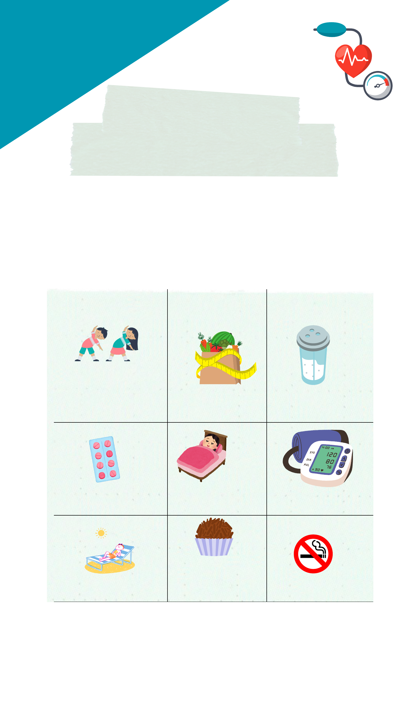 <p>Marque um X nos itens que estão presentes no</p><p>seu cuidado diário</p><p>BINGO DO</p><p>HIPERDIA</p><p>Referências : https://prodi.ifes.edu.br/images/stories/obesidade_diabetes_e_hipertens%C3%A3o.pdf</p><p>Praticar</p><p>atividade</p><p>física</p><p>Alimentação</p><p>saudável</p><p>Reduzir o</p><p>consumo de sal</p><p>Fazer o uso da medicação</p><p>regularmente</p><p>sono regular Aferir a pressão</p><p>regularmente</p><p>Lazer</p><p>Reduzir o</p><p>consumo</p><p>de doces</p><p>Não fumar</p>
