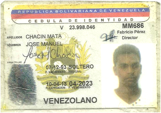 <p>REPUBLICA BOLIVARIANA DE VENEZUE CEDULA D E IDENTIDAD V 23.998.046 MM6 Fabricio F APELLIDOS CHACIN MATA Directo JOSE MANUEL FIRMATITULAR 07-12-93 SOLTERO F. NACIMIENTO EDO CIVIL 10-04-13 04-2023 F EXPEDICION F. VENCIMIENTO VENEZOLANO</p>