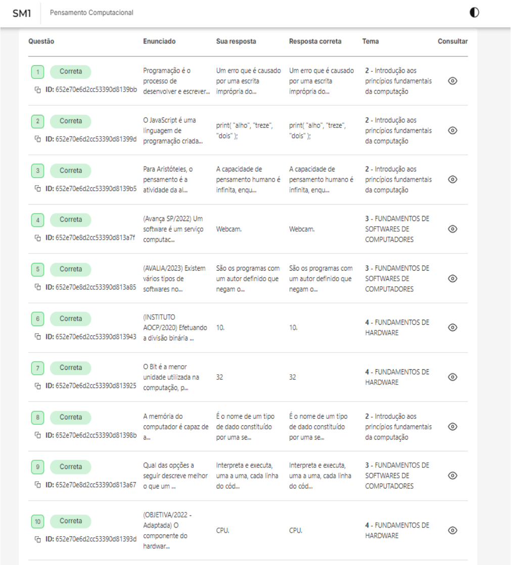 <p>SM1 Pensamento Computacional Questão Enunciado Sua resposta Resposta correta Tema Consultar 1 Correta Programação é Um erro que é causado Um erro que é causado 2 Introdução aos processo de por uma escrita por uma escrita princípios fundamentais ID: desenvolver e escrever... imprópria do... imprópria do... da computação 2 Correta JavaScript é uma 2 Introdução aos "treze", print( "alho", "treze", linguagem de princípios fundamentais ID: 652e70e6d2cc53390d81399d "dois") "dois" ); programação criada... da computação 3 Correta Para A capacidade de A capacidade de 2 Introdução aos pensamento é a pensamento humano é pensamento humano é princípios fundamentais ID: 652e70e6d2cc53390d8139b5 atividade da al... infinita, enqu... infinita, enqu... da computação 4 Correta (Avança SP/2022) Um 3 FUNDAMENTOS DE software é um serviço Webcam. SOFTWARES DE ID: 652e70e8d2cc53390d813a7f computac... COMPUTADORES 5 Correta (AVALIA/2023) Existem São os programas com São os programas com 3 FUNDAMENTOS DE vários tipos de um autor definido que um autor definido que SOFTWARES DE ID: 652e70e8d2cc53390d813a85 softwares no... negam O... negam O... COMPUTADORES 6 Correta (INSTITUTO 4 FUNDAMENTOS DE AOCP/2020) Efetuando 10. 10. HARDWARE ID: 652e70e6d2cc53390d813943 a divisão binária 7 Correta Bit é a menor 4 FUNDAMENTOS DE unidade utilizada na 32 32 ID: HARDWARE computação, p... 8 Correta A memória do É nome de um tipo É nome de um tipo 2 Introdução aos computador é capaz de de dado constituído de dado constituído princípios fundamentais ID: 652e70e6d2cc53390d81398b a... por uma se... por uma se... da computação 9 Correta Qual das opções a Interpreta e executa, Interpreta e executa, 3 FUNDAMENTOS DE seguir descreve melhor uma a uma, cada linha uma a uma, cada linha SOFTWARES DE ID: 652e70e8d2cc53390d813a67 que um do cód.. do cód... COMPUTADORES (OBJETIVA/2022 10 Correta Adaptada) 4 FUNDAMENTOS DE CPU. CPU. ID: 652e70e6d2cc53390d81393d componente do HARDWARE hardwar...</p>