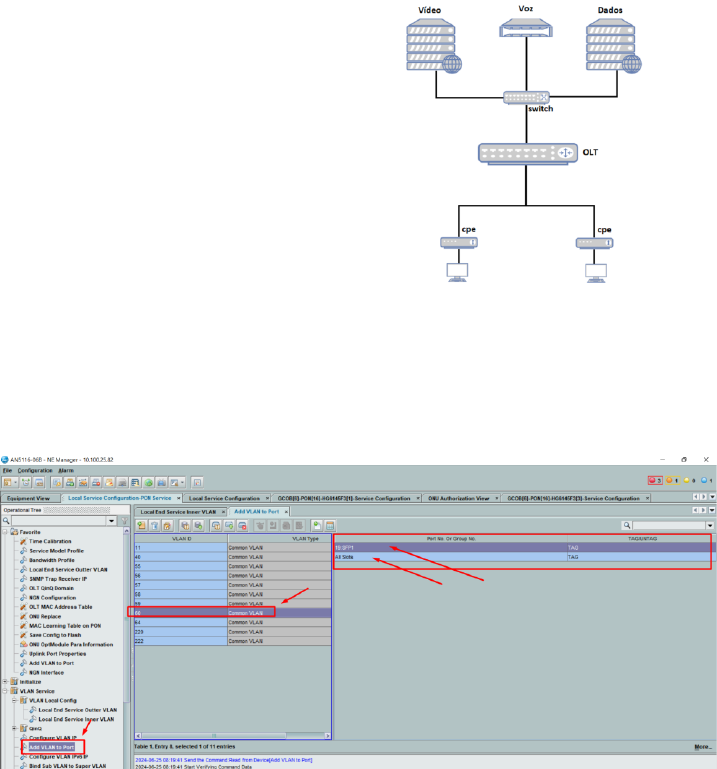 <p>OLT AN5516-06B</p><p>topologia</p><p>Configuração porta uplink</p><p>Configurar Add VLAN to Port</p><p>No menu Add VLAN to Port , inserir adicionar o vlan id utilizado pelo serviço de voz e depois adicionar a</p><p>porta uplink na vlan (são duas configurações, um na coluna da esquerda e outro na coluna da direita)</p><p>Obs: É necessário inserir duas linhas na coluna da direita (“All Slots” e a “Porta Uplink”).</p><p>Existem 3 formas de configuração do serviço de VOZ:</p><p>A: omci padrão</p><p>B: omci privado + omci padrão</p><p>C: VEIP</p><p>A: omci padrão</p><p>OMCI padrão, é o método de configuração do serviço padrão do GPON, isto é, a parametrização das</p><p>configurações de voz é enviada via omci, não sendo necessário realizar a configuração localmente na ont.</p><p>Obs: Neste modo, além da configuração do vlan id na interface uplink é necessário configurar a vlan de</p><p>serviço.</p><p>Configuração da VLAN de serviço</p><p>No menu Local End Service Outter VLAN, adicionar uma 1 linha e preencher os itens Service Name, inserir</p><p>o VLAN ID do serviço de VOZ e por último selecionar NGN em Service Type, então salvar as configurações.</p><p>Configuração do serviço de voz.</p><p>No menu NGN Interface, adicionar uma 1 linha e preencher com as informações do serviço de voz, em</p><p>Signalling Service Name selecionar a vlan de serviço configurado anteriormente, inserir uma identificação</p><p>do serviço, selecionar o protocolo SIP e preencher com os dados do servidor de voz e por último salvar as</p><p>configurações.</p><p>Configuração dos dados da conta SIP.</p><p>No menu NGN Configuration inserimos 1 linha para fazer o vínculo do serviço de voz previamente</p><p>configurado e inserimos outra linha com as configurações da conta sip, por último, salvar as configurações.</p><p>Obs: Cada linha da tabela da esquerda representa a configuração para uma onu, a tabela da direita</p><p>representa a conta sip para a onu</p><p>Configuração da conta na ont.</p><p>Acessar o menu Port Service Config da onu desejada</p><p>Selecionar a porta FXS, selecionar a conta sip desejada em User Index, modificar as opções de codec, dtmf</p><p>e fax conforme desejado e clicar em Create on Device para aplicar as configurações.</p><p>Neste modo, os dados da configuração da wan não são exibidos na interface web, devido a configuração</p><p>ter sido realizada puramente omci. As configurações da conta sip são exibidas normalmente na web.</p><p>B: omci privado + omci padrão</p><p>Este modo o processo é o mesmo do anterior, porém caso desejar que a wan apareça na interface web do</p><p>produto, é necessário configurar uma “wan service” do tipo VOIP.</p><p>No menu WAN Service inserimos 1 linha para criar a interface wan na ont, deve-se selecionar em VOIP em</p><p>Wan_mode, route em Wan_conn_type e inserir o vlan id em Wan_Vlan_ID, então salvar as configurações.</p><p>C: VEIP</p><p>VEIP é o método de configuração do serviço quando não há interoperabilidade entre OLT e ONT, neste</p><p>caso, é obrigatório realizar configuração tanto na OLT quanto na ONT (localmente)</p><p>Configurar Service Model Profile</p><p>No menu Service Model Profile, adicionar uma 1 linha, inserir uma descrição para o profile, selecionar o</p><p>modo Transparent e salvar as configurações.</p><p>Obs: Este profile pode ser usado tanto para voz quanto para dados, a olt não irá diferenciar o tipo de</p><p>serviço, a separação é realizada na ONT.</p><p>Configurar VEIP Data Service Config</p><p>No menu VEIP Data Service Config, adicionar uma 1 linha, inserir a vlan utilizada pelo serviço de voz em</p><p>CVID e selecionar o Service Profile configurado anteriormente e salvar as configurações.</p><p>Configurar a interface WAN e os parâmetros de voz diretamente na ONT</p>