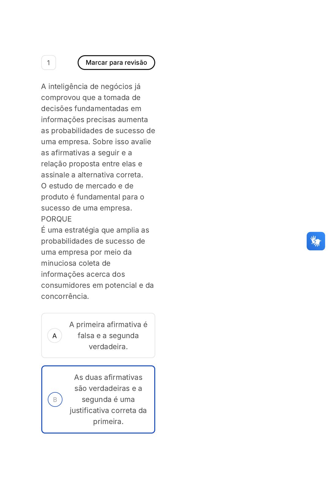 <p>A</p><p>B</p><p>1 Marcar para revisão</p><p>A inteligência de negócios já</p><p>comprovou que a tomada de</p><p>decisões fundamentadas em</p><p>informações precisas aumenta</p><p>as probabilidades de sucesso de</p><p>uma empresa. Sobre isso avalie</p><p>as afirmativas a seguir e a</p><p>relação proposta entre elas e</p><p>assinale a alternativa correta.</p><p>O estudo de mercado e de</p><p>produto é fundamental para o</p><p>sucesso de uma empresa.</p><p>PORQUE</p><p>É uma estratégia que amplia as</p><p>probabilidades de sucesso de</p><p>uma empresa por meio da</p><p>minuciosa coleta de</p><p>informações acerca dos</p><p>consumidores em potencial e da</p><p>concorrência.</p><p>A primeira afirmativa é</p><p>falsa e a segunda</p><p>verdadeira.</p><p>As duas afirmativas</p><p>são verdadeiras e a</p><p>segunda é uma</p><p>justificativa correta da</p><p>primeira.</p><p>C</p><p>D</p><p>E</p><p>A</p><p>B</p><p>A primeira afirmativa é</p><p>verdadeira e a segunda</p><p>é falsa.</p><p>As duas afirmativas</p><p>são verdadeiras, mas a</p><p>segunda não é uma</p><p>justificativa da</p><p>primeira.</p><p>As duas afirmativas</p><p>são falsas.</p><p>2 Marcar para revisão</p><p>Uma startup de tecnologia está</p><p>desenvolvendo um aplicativo de</p><p>bem-estar. Para garantir o</p><p>alinhamento com as</p><p>necessidades do mercado, a</p><p>equipe conduz uma pesquisa</p><p>focada nas preferências e</p><p>problemas enfrentados pelo</p><p>público-alvo.</p><p>Qual método de pesquisa de</p><p>mercado seria mais apropriado</p><p>para a startup?</p><p>Observação direta em</p><p>centros de bem-estar.</p><p>Análise financeira do</p><p>setor de bem-estar.</p><p>C</p><p>D</p><p>E</p><p>A</p><p>B</p><p>Estudo das estratégias</p><p>de marketing de</p><p>concorrentes.</p><p>Pesquisas online com</p><p>questionários</p><p>detalhados.</p><p>Análise de tendências</p><p>tecnológicas.</p><p>3 Marcar para revisão</p><p>O estudo de mercado eficiente</p><p>conta com dados dos</p><p>consumidores, que devem ser</p><p>colhidos de forma adequada</p><p>com uma pesquisa de mercado.</p><p>Uma pesquisa de mercado</p><p>utiliza dados primários e</p><p>secundários. É uma</p><p>desvantagem do uso de dados</p><p>primários:</p><p>demanda muito tempo</p><p>e recurso para coleta</p><p>de dados.</p><p>é preciso muita</p><p>tecnologia para coleta</p><p>desses dados.</p><p>00</p><p>hora</p><p>: 41</p><p>min</p><p>: 32</p><p>seg</p><p>Ocultar</p><p>Questão 5 de 10</p><p>Respondidas �10� Em branco �0�</p><p>Finalizar prova</p><p>1 2 3 4 5</p><p>6 7 8 9 10</p><p>SM2 Inovação e Empreendedorismo</p><p>C</p><p>D</p><p>E</p><p>A</p><p>B</p><p>são pouco precisos e</p><p>podem causar</p><p>distorções no longo</p><p>prazo.</p><p>produzem uma análise</p><p>que não considera as</p><p>demandas dos</p><p>consumidores.</p><p>estão disponíveis em</p><p>qualquer lugar, mas</p><p>precisam de uma</p><p>curadoria.</p><p>4 Marcar para revisão</p><p>Um fabricante de calçados</p><p>esportivos planeja lançar um</p><p>novo modelo. Para diferenciar-</p><p>se no mercado competitivo, a</p><p>empresa decide focar em um</p><p>segmento específico de atletas.</p><p>Qual estratégia de segmentação</p><p>de mercado é mais eficaz para</p><p>esta empresa?</p><p>Focar em atletas de</p><p>alto desempenho.</p><p>Segmentação baseada</p><p>na localização</p><p>geográfica dos atletas.</p><p>C</p><p>D</p><p>E</p><p>A</p><p>B</p><p>Segmentação por faixa</p><p>etária.</p><p>Direcionamento para</p><p>todos os tipos de</p><p>esportes.</p><p>Segmentação com</p><p>base no gênero dos</p><p>atletas.</p><p>5 Marcar para revisão</p><p>A correta manutenção das</p><p>finanças requer do gestor</p><p>alguns conhecimentos, dentre</p><p>eles a compreensão dos</p><p>conceitos de liquidez e</p><p>rentabilidade. Sobre o tema, é</p><p>correto dizer que:</p><p>a rentabilidade</p><p>máxima diminui</p><p>drasticamente os</p><p>retornos do</p><p>empreendedor.</p><p>a empresa deve ter a</p><p>maior rentabilidade</p><p>possível e ao mesmo</p><p>tempo a maior liquidez</p><p>possível.</p><p>C</p><p>D</p><p>E</p><p>um investimento com</p><p>boa rentabilidade é</p><p>aquele que é</p><p>facilmente</p><p>transformado em</p><p>dinheiro sem perda</p><p>significativa de valor.</p><p>uma liquidez máxima</p><p>pode sacrificar a</p><p>rentabilidade.</p><p>a liquidez é o retorno</p><p>que o empreendedor</p><p>consegue com o</p><p>investimento.</p><p>6 Marcar para revisão</p><p>A localização de um empresa é</p><p>um ponto central para o</p><p>empreendimento na medida em</p><p>que sua escolha estratégica</p><p>pode melhor inseri-la no</p><p>mercado consumidor. Sobre a</p><p>localização de uma empresa, é</p><p>correto dizer que:</p><p>A</p><p>B</p><p>C</p><p>D</p><p>E</p><p>altos custos de aluguel</p><p>não são um problema</p><p>de localização.</p><p>sempre se deve</p><p>priorizar o preço baixo</p><p>do imóvel, acima dos</p><p>demais fatores.</p><p>empresas de comércio</p><p>têm necessidades</p><p>diferentes das</p><p>empresas industriais.</p><p>os consumidores vão</p><p>aonde houver maior</p><p>atratividade do produto</p><p>ou serviço,</p><p>independentemente da</p><p>natureza do</p><p>empreendimento - seja</p><p>industrial ou comercial.</p><p>um arranjo físico bem</p><p>planejado não pode</p><p>gerar benefícios</p><p>fiscais.</p><p>7 Marcar para revisão</p><p>Sobre a Classificação Nacional</p><p>de Atividades Econômicas</p><p>�CNAE�, o empreendedor deve:</p><p>A</p><p>B</p><p>C</p><p>D</p><p>E</p><p>Listar o total de</p><p>investimento inicial da</p><p>empresa.</p><p>Consultar a página</p><p>web do Instituto</p><p>Brasileiro de Geografia</p><p>e Estatística �IBGE�.</p><p>Consultar a página</p><p>web da Prefeitura de</p><p>seu município.</p><p>Listar o total de sócios,</p><p>se for uma Empresa de</p><p>Sociedade Anônima.</p><p>Consultar a página</p><p>web da Receita</p><p>Federal.</p><p>8 Marca
