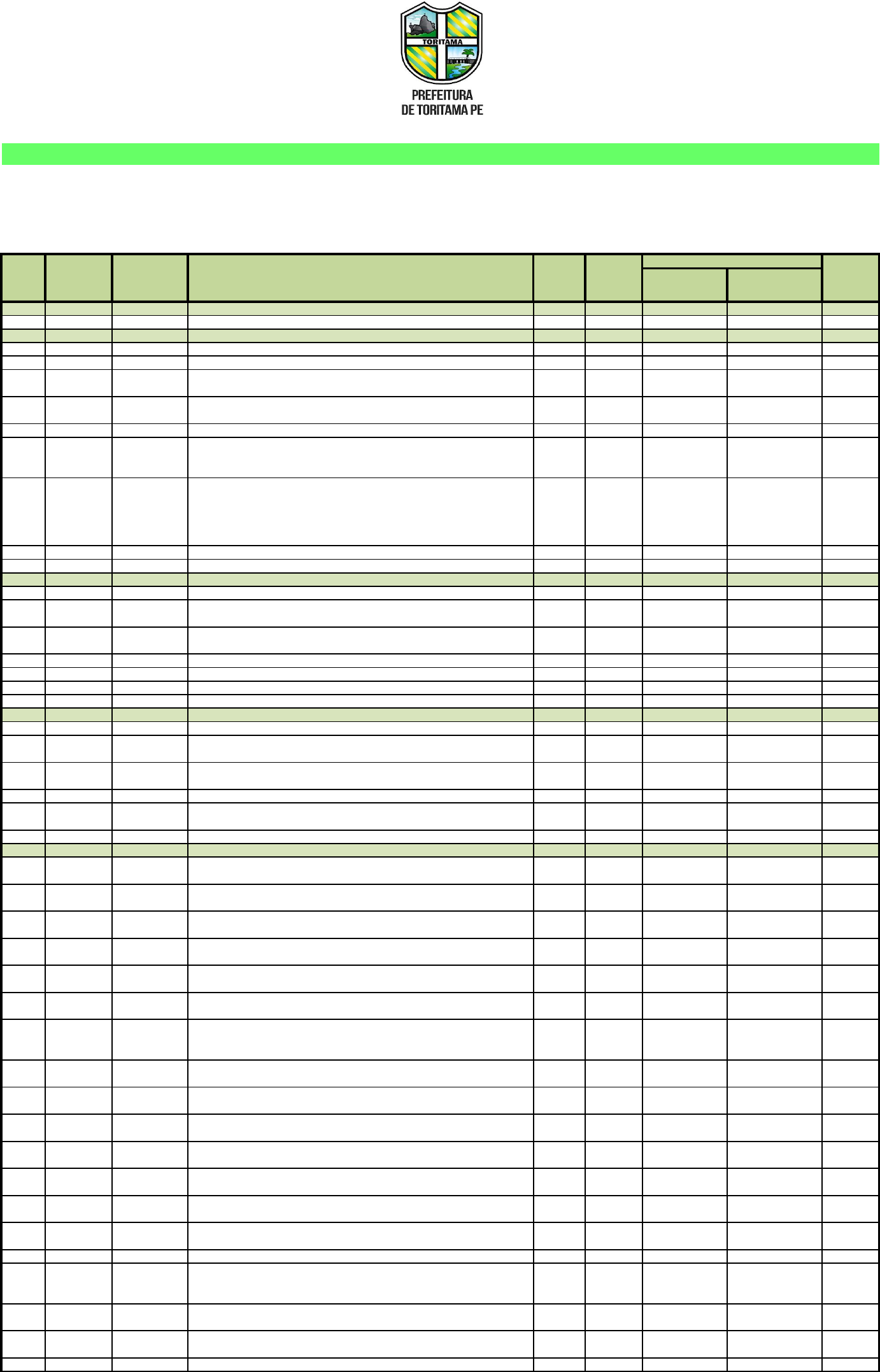 <p>Obra: CONSTRUÇÃO DE UMA ESCOLA COM 8 SALAS DE AULA, (CONCRETO/PVC - MODELO CONSTRUTIVO EM SÉRIE)</p><p>Município: Toritama - PERNAMBUCO</p><p>Endereço: RUA ANTONIO SOARES, ESQUINA DA RUA PEDRO ÂNGELO DA SILVA - FAZENDA VELHA - TORITAMA - PE</p><p>Tabelas de Referência: SINAPI DESONERADA (março/21); SEINFRA 027.1; ORSE (Fevereiro/2021)</p><p>UNITÁRIO C/</p><p>BDI=26,68%</p><p>TOTAL C/ BDI</p><p>1.0 ADMINISTRAÇÃO LOCAL DA OBRA 58.937,79R$</p><p>1.1 COMP. - 1 COMPOSIÇÃO Administração local da obra. unidade 1,00 58.937,79R$ 58.937,79R$ 1,353%</p><p>2.0 IMPLANTAÇÃO 55.202,24R$</p><p>2.1 C1046 SEINFRA Demolição de cobertura c/ telhas onduladas de fibrocimento. m² 67,41 5,59R$ 376,82R$ 0,009%</p><p>2.2 C1045 SEINFRA Demolição de cobertura c/ telhas cerâmicas. m² 93,75 13,40R$ 1.256,25R$ 0,029%</p><p>2.3 97629 SINAPI</p><p>Demolição de lajes, de forma mecâmizada com martelete, sem</p><p>reaproveitamento. AF_12/2017.</p><p>m³ 29,21 135,50R$ 3.958,29R$ 0,091%</p><p>2.4 97625 SINAPI</p><p>Demolição de alvenaria para qualquer tipo de bloco, de forma mecanizada,</p><p>sem reaproveitamento. AF_12/2017.</p><p>m³ 124,41 51,27R$ 6.378,25R$ 0,146%</p><p>2.5 C1066 SEINFRA Demolição de piso cimentado sobre lastro de concreto. m² 399,95 29,04R$ 11.614,40R$ 0,267%</p><p>2.6 100981 SINAPI</p><p>Carga, manobra e descarga de entulho em caminhão basculante 6 m³ -</p><p>carga com escavadeira hidráulica (caçamba de 0,80 m³ / 111 hp) e</p><p>descarga livre (unidade: m3). AF_07/2020.</p><p>m³ 201,61 8,27R$ 1.667,32R$ 0,038%</p><p>2.7 101207 SINAPI</p><p>Escavação vertical a céu aberto, emobras de edificação incluindo carga,</p><p>descarga e transporte, em solo de 1ª categoria com escavadeira hidráulica</p><p>(caçamba: 0,8 m³ / 111 hp), frota de 2 caminhões basculantes de 18 m³,</p><p>dmt até 1 km e velocidade média 14 km/h. AF_05/2020.</p><p>m³ 718,94 9,31R$ 6.693,37R$ 0,154%</p><p>2.8 98459 SINAPI Tapume com telha metálica. AF_05/2018. m² 222,88 104,35R$ 23.257,53R$ 0,534%</p><p>3.0 SERVIÇOS PRELIMINARES 42.959,01R$</p><p>3.1 COMP. - 2 COMPOSIÇÃO Placa de obra em chapa de aço galvanizado. m² 6,00 402,23R$ 2.413,38R$ 0,055%</p><p>3.2 93207 SINAPI</p><p>Execução de escritório em canteiro de obra em chapa de madeira</p><p>compensada, não incluso mobiliário e equipamentos. AF_02/2016.</p><p>m² 24,00 1.073,64R$ 25.767,36R$ 0,591%</p><p>3.3 99059 SINAPI</p><p>Locacao convencional de obra, utilizando gabarito de tábuas corridas</p><p>pontaletadas a cada 2,00m - 2 utilizações. AF_10/2018.</p><p>m 226,36 51,20R$ 11.589,63R$ 0,266%</p><p>3.4 C2850 SEINFRA Instalações provisórias de luz, força, telefone e lógica. unidade 1,00 1.657,23R$ 1.657,23R$ 0,038%</p><p>3.5 C2851 SEINFRA Instalação provisória de água unidade 1,00 1.270,45R$ 1.270,45R$ 0,029%</p><p>3.6 C2849 SEINFRA Instalações provisórias de esgoto unidade 1,00 R$ 260,96 260,96R$ 0,006%</p><p>4.0 MOVIMENTO DE TERRAS PARA FUNDAÇÕES 390.737,25R$</p><p>4.1 C0328 SEINFRA Aterro c/ compactação mecânica e controle, material de aquisição. m³ 3.200,64 113,37R$ 362.857,08R$ 8,329%</p><p>4.2 93358 SINAPI</p><p>Escavação manual de valas com profundidade menor ou igual a 1,30 M.</p><p>AF_02/2021.</p><p>m³ 293,01 R$ 74,16 21.729,38R$ 0,499%</p><p>4.3</p><p>93382 SINAPI</p><p>Reaterro manual de valas com compactação mecanizada. AF_04/2016. m³ 57,39 35,60R$ 2.043,23R$ 0,047%</p><p>4.4 96995 SINAPI Reaterro manual apiloado com soquete. AF_10/2017. m³ 43,98 R$ 44,96 1.977,48R$ 0,045%</p><p>4.5 101616 SINAPI</p><p>Preparo de fundo de vala com largura menor que 1,5 m (acerto do solo</p><p>natural). AF_08/2020.</p><p>m² 387,29 R$ 5,50 2.130,08R$ 0,049%</p><p>5.0 FUNDAÇÕES 452.039,19R$</p><p>5.1 95241 SINAPI</p><p>Lastro de concreto magro, aplicado em pisos ou radiers, espessura de</p><p>5cm. AF_07/2016.</p><p>m² 387,29 29,39R$ 11.382,39R$ 0,261%</p><p>5.2 C0074 SEINFRA</p><p>Alvenaria de tijolo cerâmico furado (9x19x19)cm c/ argamassa mista de cal</p><p>hidratada esp.=20cm.</p><p>m² 622,45 132,75R$ 82.630,72R$ 1,897%</p><p>5.3 96396 SINAPI</p><p>Execução e compactação de base e/ou sub-base com brita graduada</p><p>simples - Exclusive carga e transporte. AF_09/2017.</p><p>m³ 126,46 132,55R$ 16.762,19R$ 0,385%</p><p>5.4 97087 SINAPI</p><p>Camada separadora para execução de radier, em lona plástica.</p><p>AF_09/2017.</p><p>m² 1.264,59 2,85R$ 3.604,09R$ 0,083%</p><p>5.5 97086 SINAPI</p><p>Fabricação, montagem e desmontagem de forma para radier, em madeira</p><p>serrada, 4 utilização. AF_09/2017.</p><p>m² 71,97 107,37R$ 7.727,20R$ 0,177%</p><p>5.6 96535 SINAPI</p><p>Fabricação, montagem e desmontagem de fôrma para sapata, em madeira</p><p>serrada, e=25mm, 4 utilizações. AF_06/2017.</p><p>m² 162,00 133,99R$ 21.706,38R$ 0,498%</p><p>5.7 96538 SINAPI</p><p>Fabricação, monatgem e desmontagem de fôrma para sapata, em chapa</p><p>de madeira compensada resinada, e=17mm, 2 utilizações. AF_06/2017.</p><p>m² 15,00 270,08R$ 4.051,20R$ 0,093%</p><p>5.8 96536 SINAPI</p><p>Fabricação, montagem e desmontagem de fôrma para viga baldrame, em</p><p>madeira serrada, e=25mm, 4 utilizações. AF_06/2017.</p><p>m² 298,62 66,94R$ 19.989,36R$ 0,459%</p><p>5.9 92791 SINAPI</p><p>Corte e dobra de aço CA-60, diâmetro de 5.0mm, utilizado em estruturas</p><p>diversas, exceto lajes. AF_12/2015.</p><p>kg 1.948,50 15,15R$ 29.519,78R$ 0,678%</p><p>5.10 92792 SINAPI</p><p>Corte e dobra de aço ca-50, diâmetro de 6,3 mm, utilizado em estruturas</p><p>diversas, exceto lajes. AF_12/2015.</p><p>kg 201,50 15,76R$ 3.175,64R$ 0,073%</p><p>5.11 92793 SINAPI</p><p>Corte e dobra de aço CA-50, diâmetro de 8.0mm, utilizado em estruturas</p><p>diversas, exceto lajes. AF_12/2015.</p><p>kg 353,20 15,90R$ 5.615,88R$ 0,129%</p><p>5.12 92794 SINAPI</p><p>Corte e dobra de aço CA-50, diâmetro de 10.0mm, utilizado em estruturas</p><p>diversas, exceto lajes. AF_12/2015.</p><p>kg 3.830,30 14,77R$ 56.573,53R$ 1