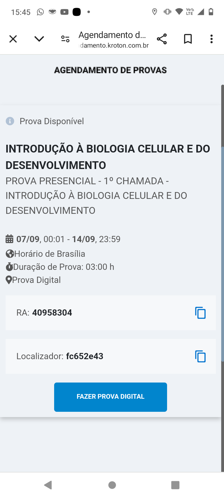 <p>15:45 LTE X Agendamento d damento.kroton.com.br AGENDAMENTO DE PROVAS i Prova Disponível INTRODUÇÃO À BIOLOGIA CELULAR E DO DESENVOLVIMENTO PROVA PRESENCIAL - 1° CHAMADA - INTRODUÇÃO À BIOLOGIA CELULAR E DO DESENVOLVIMENTO 07/09, 00:01 - 14/09, 23:59 Horário de Brasília Duração de Prova: 03:00 h Prova Digital RA: 40958304 Localizador: fc652e43 FAZER PROVA DIGITAL</p>