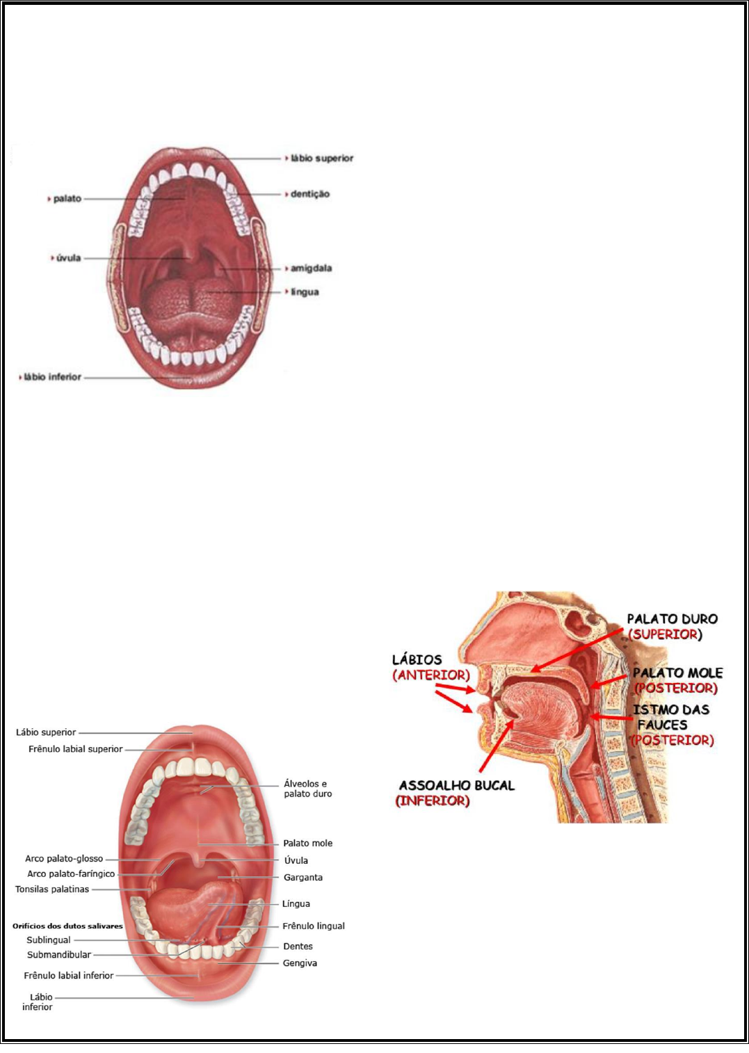 <p>Cavidade bucal</p><p>Bacharelado em Odontologia / Disciplina de Anatomia Odontológica</p><p>2</p><p>o</p><p>semestre- 2020</p><p>- Inicio do sistema digestório</p><p>- Mastigação</p><p>- Dentes</p><p>- Fala</p><p>- Paladar</p><p>----- cavidade bucal -----</p><p>- A boca é a única parte do tubo digestivo coberta</p><p>por mucosa na parte interna e pele na parte externa.</p><p>- A mucosa bucal é o revestimento da cavidade bucal</p><p>incluindo gengiva, palato, lábio, bochecha, soalho da</p><p>boca e outras estruturas.</p><p> Mucosa: Um tipo de epitélio de revestimento mais</p><p>tecido conjuntivo que reveste as cavidades úmidas do</p><p>corpo.</p><p>----- divisão da cavidade bucal -----</p><p>1- limites do vestibulo bucal</p><p>Anterior - Lábios</p><p>Interno - Arcada Dento-Alveolar</p><p>Lateral - Mucosa Jugal</p><p>2- limites da cavidade bucal</p><p>propriamente dita</p><p>Anterior e Lateral - Arcada Dento-Alveolar</p><p>Posterior - Istmo Das Fauces ; Palato Mole</p><p>Superior - Palato</p><p>Inferior - Assoalho Bucal</p><p>----- limites da cavidade bucal -----</p><p>1- Anterior - Lábios</p><p>2- Lateral - Bochechas</p><p>3- Posterior - Istmo Das Fauces; Palato Mole</p><p>4- Inferior - Assoalho Bucal</p><p>5- Superior - Palato Duro</p><p>1- PORÇÃO ANTERIOR: LÁBIOS</p><p>- Sulco nasolabial</p><p>- Filtro</p><p>- Tubérculo</p><p>- Comissura</p><p>- Ângulo</p><p>- Rima bucal</p><p>- Freio</p><p>- Porção cutânea</p><p>- Vermelhão dos lábios</p><p>- Porção mucosa</p><p>- Sulco mentolabial</p><p>Bacharelado em Odontologia / Disciplina de Anatomia Odontológica</p><p>2</p><p>o</p><p>semestre- 2020</p><p>1.1 - MÚSCULOS DO LÁBIO</p><p>1. Zigomático Maior</p><p>2. Zigomático Menor</p><p>3. Levantador do Lábio Superior</p><p>4. Orbicular dos Lábios</p><p>5. Risório</p><p>6. Bucinador</p><p>7. Masseter</p><p>8. Depressor do Ângulo da Boca</p><p>9. Depressor do Lábio Inferior</p><p>10. Mentuais</p><p>2- PORÇÃO LATERAL: BOCHECHAS</p><p>- As bochechas apresentam planos cutâneo,</p><p>muscular e mucoso.</p><p>- A camada muscular da bochecha é representada</p><p>principalmente pelo músculo bucinador.</p><p>2.1 - BOLA DE BICHAT</p><p>- O corpo adiposo da bochecha (Bola de Bichat) é</p><p>uma estrutura anatômica presente nesta região</p><p>anatômica e, frequentemente, responsável pelo</p><p>volume da estrutura facial em pacientes com rosto</p><p>arredondado.</p><p>- Desde 1988, este corpo adiposo tem sido uma área</p><p>de interesse, e tem, indubitavelmente, sido removido,</p><p>mais frequentemente, em procedimentos estéticos.</p><p>- A Bola de Bichat é uma massa arredondada ou</p><p>ovalada de gordura, encapsulada por uma camada</p><p>de tecido conjuntivo, situada externamente ao</p><p>músculo Bucinador e à frente da margem anterior do</p><p>músculo Masseter. O tamanho desta estrutura é</p><p>constante em diferentes pessoas com diferentes</p><p>pesos e é bem desenvolvido nos primeiros anos de</p><p>vida, o que é atribuído ao ato de sucção, durante a</p><p>amamentação, impedindo que as bochechas se</p><p>colapsem.</p><p>- A Bola de Bichat pode ser dividida em 3 lobos:</p><p>anterior, posterior e intermediário e pode estar em</p><p>íntima relação com o Nervo Facial e com o Ducto</p><p>Parotídeo.</p><p>PLANO SUPERFICIAL</p><p>- Risório, Zigomáticos, Platisma</p><p>PLANO INTERMEDIÁRIO</p><p>- Corpo Adiposo Da Bochecha</p><p>- Ducto Parotídeo</p><p>- Ramos Bucal Do Facial (VII)</p><p>- Vasos Faciais</p><p>- Nervo Bucal (V)</p><p>PLANO PROFUNDO</p><p>- Bucinador</p><p>PLANO PROFUNDO</p><p>- Bucinador</p><p>Cavidade bucal</p><p>Bacharelado em Odontologia / Disciplina de Anatomia Odontológica</p><p>2</p><p>o</p><p>semestre- 2020</p><p>3- PORÇÃO SUPERIOR: PALATO</p><p>3.2 – palate duro</p><p>4- PORÇÃO inferior: lingual e assoalho bucal</p><p>4.1- língua</p><p>- Órgão ímpar;</p><p>- Mediano;</p><p>- Simétrico;</p><p>- Formação muscular revestida por mucosa;</p><p>- Funções: mastigação, deglutição, sucção, fonação e gustação.</p><p>3.1– palate mole</p><p>Bacharelado em Odontologia / Disciplina de Anatomia Odontológica</p><p>2</p><p>o</p><p>semestre- 2020</p><p>PORÇÃO FIXA PORÇÃO MÓVEL</p><p>- Fixa, larga e espessa</p><p>- Corresponde a 1/3 posterior da</p><p>língual</p><p>- Nesta porção estão as tonsilas</p><p>linguais</p><p>- Corpo: dorso da língua, mucosa espessa com papilas</p><p>- Ápice: anterior, arredondado, que se continua nas margens laterais</p><p>- Margens laterais: contato com as arcadas dentárias</p><p>- Ventre: menos extensa, apresenta na linha mediana o frênulo lingual</p><p>(freio lingual)</p><p>Cavidade bucal</p><p>Bacharelado em Odontologia / Disciplina de Anatomia Odontológica</p><p>2</p><p>o</p><p>semestre- 2020</p><p>4.1- músculos da lingual</p><p>EXTRÍNSECOS INTRÍNSECOS</p><p>M. Palatoglosso</p><p>M. Genioglosso</p><p>M. Hioglosso</p><p>M. Estiloglosso</p><p>M. Longitudinal Superior da Língua</p><p>M. Longitudinal Inferior da Língua</p><p>M. Transverso</p><p>M. Vertical</p><p>Movem a lingua de um lado para o outro</p><p>e para dentro e para fora.</p><p>Movem o alimento para a mastigação</p><p>----- vascularização -----</p><p>- Artéria Lingual</p><p>- Palatina Ascendente</p><p>- Faríngea Ascendente</p><p>- Veias Linguais</p><p>----- inervação -----</p><p>SENSITIVA</p><p> Nervo Lingual (V)</p><p> Glossofaríngeo (IX)</p><p> Facial (VII)</p><p>MOTORA</p><p> N. Hipoglosso (XII)</p><p>----- assoalho bucal -----</p><p>- Mucosa</p><p>- Musculatura - Milohioideo</p><p>- Glândula submandibular</p><p>- Glândula sublingual</p><p>- Carúnculas sublinguais - Ducto de Wharton</p><p>- Freio lingual</p><p>Frênulo da Língua - liga a língua ao assoalho da</p><p>boca</p><p>Carúnculas Sublinguais - local onde os ductos das</p><p>Glândulas Submandibulares se exteriorizam.</p><p>----- tunica mucosa -----</p><p>Mucosa de revestimento (células</p><p>não-queratinizadas)</p><p>- Palato mo