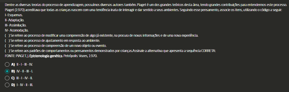 <p>Dentre as diversas teorias do processo de aprendizagem, possuímos diversos autores também Piaget é um dos grandes teóricos desta área, tendo grandes contribuições para entendermos este processo. Piaget (1970) acreditava que todas as crianças nascem com uma tendência inata de interagir e dar sentido a seus ambientes. Seguindo esse pensamento, associe os itens, utilizando código a III- IV ( ) Se refere ao processo de modificar uma compreensão de algo já existente, na procura de novas informações e de uma nova experiência. ( ) Se refere ao processo de ajustamento em resposta ao ambiente. ( ) Se refere ao processo de compreensão de um novo objeto ou evento. ( ) Se refere aos padrões de comportamentos ou pensamentos demonstrados por a alternativa que apresenta a sequência CORRETA: J Epistemologia genética. Vozes, 1970. A) B) C) III IV D) IV III.</p>