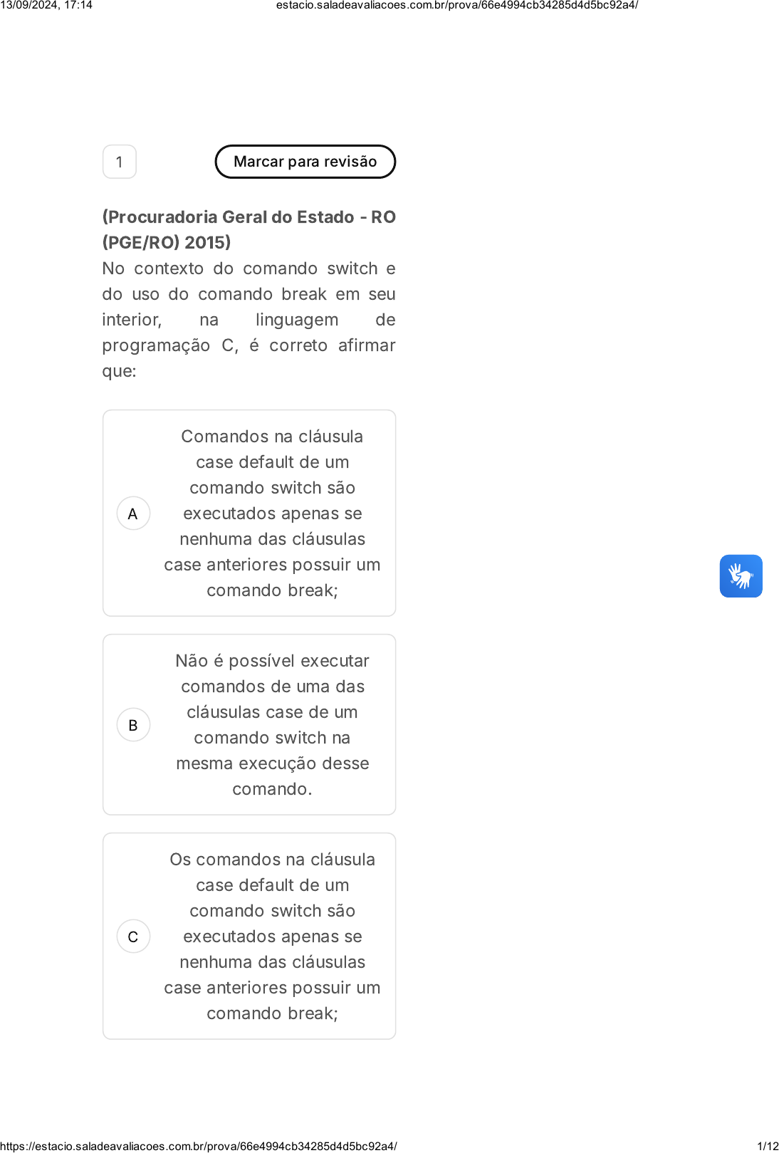 <p>A</p><p>B</p><p>C</p><p>1 Marcar para revisão</p><p>�Procuradoria Geral do Estado - RO</p><p>�PGE/RO� 2015�</p><p>No contexto do comando switch e</p><p>do uso do comando break em seu</p><p>interior, na linguagem de</p><p>programação C, é correto afirmar</p><p>que:</p><p>Comandos na cláusula</p><p>case default de um</p><p>comando switch são</p><p>executados apenas se</p><p>nenhuma das cláusulas</p><p>case anteriores possuir um</p><p>comando break;</p><p>Não é possível executar</p><p>comandos de uma das</p><p>cláusulas case de um</p><p>comando switch na</p><p>mesma execução desse</p><p>comando.</p><p>Os comandos na cláusula</p><p>case default de um</p><p>comando switch são</p><p>executados apenas se</p><p>nenhuma das cláusulas</p><p>case anteriores possuir um</p><p>comando break;</p><p>13/09/2024, 17:14 estacio.saladeavaliacoes.com.br/prova/66e4994cb34285d4d5bc92a4/</p><p>https://estacio.saladeavaliacoes.com.br/prova/66e4994cb34285d4d5bc92a4/ 1/12</p><p>D</p><p>E</p><p>A</p><p>B</p><p>C</p><p>Quando um comando</p><p>break é executado, o</p><p>comando switch é</p><p>encerrado e o fluxo de</p><p>controle passa para o</p><p>próximo comando após o</p><p>fim do comando switch;</p><p>Toda cláusula case de um</p><p>comando switch, incluindo</p><p>a cláusula case default,</p><p>deve conter um comando</p><p>break;</p><p>2 Marcar para revisão</p><p>Marque a opção que apresente o</p><p>comando que é usado em uma</p><p>estrutura do tipo switch-case para</p><p>evitar que as opções incorretas não</p><p>sejam utilizadas, caso uma</p><p>determinada opção seja</p><p>selecionada.</p><p>default</p><p>break</p><p>else</p><p>13/09/2024, 17:14 estacio.saladeavaliacoes.com.br/prova/66e4994cb34285d4d5bc92a4/</p><p>https://estacio.saladeavaliacoes.com.br/prova/66e4994cb34285d4d5bc92a4/ 2/12</p><p>D</p><p>E</p><p>A</p><p>B</p><p>C</p><p>D</p><p>E</p><p>continue</p><p>done</p><p>3 Marcar para revisão</p><p>�Baseado em CESPE � 2018 � ABIN</p><p>- Oficial Técnico de Inteligência -</p><p>Área de Tecnologia da Informação)</p><p>Marque a opção que representa a</p><p>seguinte lógica de programação,</p><p>porém usando apenas estruturas do</p><p>tipo if simples.</p><p>A expressão a seguir especifica</p><p>que: 1 será adicionado a x, se x for</p><p>maior que 0; 1 será subtraído de x,</p><p>se x for menor que 0; o valor de x</p><p>será mantido, se x for igual a zero.</p><p>if(x>0) x++; if(x<0) x++;</p><p>if(x>0) x--; if(x<0) x--;</p><p>if(x>=0) x++; if(x<=0) x--;</p><p>if(x>0) x--; if(x<0) x++;</p><p>if(x>0) x++; if(x<0) x--;</p><p>13/09/2024, 17:14 estacio.saladeavaliacoes.com.br/prova/66e4994cb34285d4d5bc92a4/</p><p>https://estacio.saladeavaliacoes.com.br/prova/66e4994cb34285d4d5bc92a4/ 3/12</p><p>A</p><p>B</p><p>C</p><p>4 Marcar para revisão</p><p>Com relação aos 3 segmentos de</p><p>estrutura de repetição, avalie cada</p><p>assertiva a seguir como</p><p>V(verdadeira) ou F(falsa).</p><p>I. O comando FOR é o mais</p><p>indicado quando sabemos quantas</p><p>vezes a repetição vai ocorrer.</p><p>II. O comando WHILE é uma</p><p>estrutura de repetição que precisa</p><p>de uma condição que controle</p><p>quando o trecho deve se repetir.</p><p>III. O comando DO... WHILE, por</p><p>realizar o teste ao final do laço de</p><p>repetição, vai sempre executar ao</p><p>menos 1 vez a sequência de</p><p>comandos a se repetir.</p><p>IV. O comando WHILE executa a</p><p>repetição até que a condição seja</p><p>verdadeira, isto é, enquanto a</p><p>condição for falsa.</p><p>Assinale a correta sequência de V e</p><p>F, para a classificação das</p><p>assertivas:</p><p>F, V, F, V</p><p>V, V, V, F</p><p>F, F, V, V</p><p>13/09/2024, 17:14 estacio.saladeavaliacoes.com.br/prova/66e4994cb34285d4d5bc92a4/</p><p>https://estacio.saladeavaliacoes.com.br/prova/66e4994cb34285d4d5bc92a4/ 4/12</p><p>D</p><p>E</p><p>A</p><p>B</p><p>V, V, V, V</p><p>V, V, F, V</p><p>5 Marcar para revisão</p><p>Assinale a alternativa que</p><p>corresponde ao enunciado:</p><p>Faça um programa que leia vinte</p><p>números inteiros e positivos e</p><p>mostre o menor número.</p><p>controle=1;</p><p>for</p><p>(cont=1;cont<=20;cont++)</p><p>{ scanf ("%d",&num);</p><p>if (controle==1�</p><p>menor=num;</p><p>else</p><p>if (num</p><p>menor=num;</p><p>controle++;</p><p>}</p><p>controle=0;</p><p>for</p><p>(cont=1;cont<=20;cont++)</p><p>{ scanf ("%d",&num);</p><p>if (controle==1�</p><p>menor=num;</p><p>else</p><p>if (num</p><p>menor=num;</p><p>controle++;</p><p>}</p><p>13/09/2024, 17:14 estacio.saladeavaliacoes.com.br/prova/66e4994cb34285d4d5bc92a4/</p><p>https://estacio.saladeavaliacoes.com.br/prova/66e4994cb34285d4d5bc92a4/ 5/12</p><p>C</p><p>D</p><p>E</p><p>controle=1;</p><p>for</p><p>(cont=1;cont<=20;cont++)</p><p>{ scanf ("%d",&num);</p><p>if (controle==1�</p><p>menor=num;</p><p>else</p><p>if (num</p><p>menor=num;</p><p>}</p><p>controle=1;</p><p>for</p><p>(cont=1;cont<=10;cont++)</p><p>{ scanf ("%d",&num);</p><p>if (controle==1�</p><p>menor=num;</p><p>else</p><p>if (num</p><p>menor=num;</p><p>controle++;</p><p>}</p><p>controle=1;</p><p>while (cont<=20�</p><p>{ scanf ("%d",&num);</p><p>if (controle==1�</p><p>menor=num;</p><p>else</p><p>if (num</p><p>menor=num;</p><p>controle++;</p><p>}</p><p>6 Marcar para revisão</p><p>Considere o seguinte trecho de</p><p>código na linguagem C e avalie as</p><p>00</p><p>hora</p><p>: 33</p><p>min</p><p>: 37</p><p>seg</p><p>Ocultar</p><p>Questão 7 de 10</p><p>Respondidas �10� Em branco �0�</p><p>Finalizar prova</p><p>1 2 3 4 5</p><p>6 7 8 9 10</p><p>SM2 Introdução À Programação De Computadores</p><p>13/09/2024, 17:14 estacio.saladeavaliacoes.com.br/prova/66e4994cb34285d4d5bc92a4/</p><p>https://estacio.saladeavaliacoes.com.br/prova/66e4994cb34285d4d5bc92a4/ 6/12</p><p>A</p><p>B</p><p>C</p><p>assertivas a seguir.</p><p>Ind=1;</p><p>while (ind<=5)</p><p>{</p><p>scanf("%d",&num);</p><p>controle++;</p><p>if (controle == 1 && num%2 ==</p><p