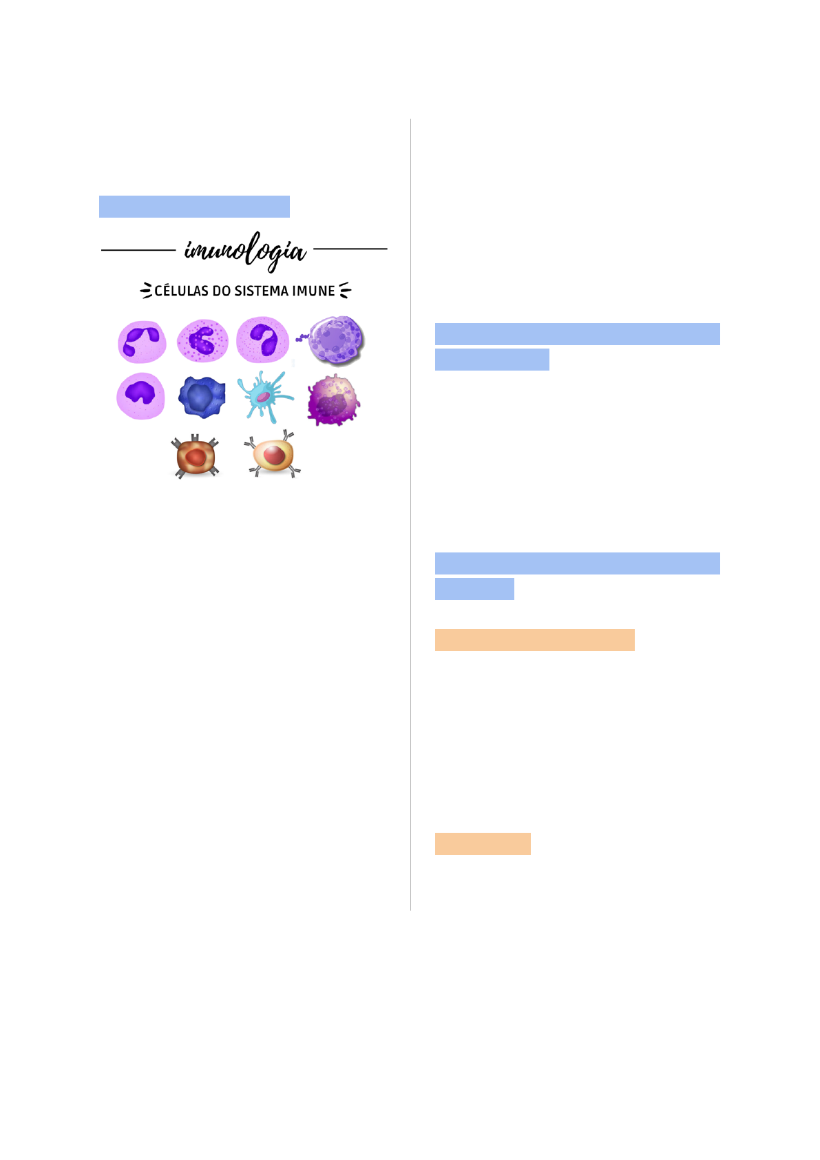 <p>DENTISTA</p><p>D</p><p>E SUCESSO</p><p>Resumo Módulo de Imunologia</p><p>Criado por: Dr. Bruno de Castro Joaquim | Academy Dentista de Sucesso</p><p>Aula 1: Introdução a</p><p>Imunologia</p><p>O que é Imunologia?</p><p>A Imunologia é o campo da</p><p>biologia que estuda o sistema</p><p>imunológico, um sistema</p><p>complexo de defesa do corpo</p><p>contra microrganismos</p><p>invasores, como bactérias, vírus,</p><p>fungos e parasitas, bem como</p><p>contra células cancerígenas.</p><p>O sistema imunológico é</p><p>essencial para manter a saúde e</p><p>a homeostase do organismo,</p><p>detectando e eliminando</p><p>ameaças potenciais.</p><p>A Imunologia abrange o</p><p>estudo das respostas</p><p>imunológicas, a função de</p><p>células imunológicas e moléculas</p><p>envolvidas na defesa e a</p><p>pesquisa de tratamentos e</p><p>vacinas para doenças.</p><p>Componentes do Sistema</p><p>Imunológico</p><p>O sistema imunológico é</p><p>composto por uma ampla</p><p>variedade de componentes que</p><p>trabalham em conjunto para</p><p>proteger o corpo.</p><p>Os principais componentes</p><p>incluem:</p><p>Células Imunológicas: Existem</p><p>várias células imunológicas,</p><p>como linfócitos T, linfócitos B,</p><p>macrófagos, neutrófilos e células</p><p>dendríticas, que desempenham</p><p>papéis específicos na defesa</p><p>imunológica.</p><p>Anticorpos: São proteínas</p><p>produzidas pelos linfócitos B que</p><p>reconhecem e se ligam a</p><p>_________________________________________________________________________</p><p>_________________________________________________________________________</p><p>_________________________________________________________________________</p><p>_________________________________________________________________________</p><p>_________________________________________________________________________</p><p>_________________________________________________________________________</p><p>_________________________________________________________________________</p><p>_________________________________________________________________________</p><p>_________________________________________________________________________</p><p>_________________________________________________________________________</p><p>Licenciado para - M</p><p>aria E</p><p>duarda A</p><p>breu S</p><p>ilva - 05997383598 - P</p><p>rotegido por E</p><p>duzz.com</p><p>DENTISTA</p><p>D</p><p>E SUCESSO</p><p>Resumo Módulo de Imunologia</p><p>Criado por: Dr. Bruno de Castro Joaquim | Academy Dentista de Sucesso</p><p>antígenos, como proteínas virais,</p><p>marcando-os para destruição.</p><p>Órgãos Linfóides: Isso inclui</p><p>órgãos como o baço, as</p><p>amígdalas, os linfonodos e a</p><p>medula óssea, onde ocorre a</p><p>produção, maturação e ativação</p><p>das células imunológicas.</p><p>Citocinas: São moléculas de</p><p>sinalização que regulam as</p><p>respostas imunológicas,</p><p>ajudando a coordenar a ação</p><p>das células imunológicas.</p><p>Células do Sistema</p><p>Imunológico</p><p>As células do sistema</p><p>imunológico desempenham</p><p>papéis cruciais na defesa do</p><p>corpo.</p><p>Aqui estão algumas das</p><p>principais células do sistema</p><p>imunológico:</p><p>Linfócitos T: São células que</p><p>desempenham um papel central</p><p>na resposta imunológica,</p><p>reconhecendo antígenos e</p><p>coordenando a resposta</p><p>imunológica.</p><p>Linfócitos B: Produzem</p><p>anticorpos, que são proteínas</p><p>que se ligam a antígenos</p><p>específicos, neutralizando-os ou</p><p>marcando-os para destruição.</p><p>Macrófagos: São células que</p><p>engolfam e digerem</p><p>microrganismos invasores,</p><p>apresentando partes desses</p><p>microrganismos a outras células</p><p>do sistema imunológico.</p><p>Neutrófilos: São células</p><p>fagocíticas que rapidamente se</p><p>deslocam para áreas de infecção</p><p>e engolfam microrganismos.</p><p>Células Dendríticas: São células</p><p>especializadas na captura de</p><p>antígenos e na apresentação</p><p>deles aos linfócitos T,</p><p>desempenhando um papel</p><p>importante na ativação do</p><p>sistema imunológico.</p><p>_________________________________________________________________________</p><p>_________________________________________________________________________</p><p>_________________________________________________________________________</p><p>_________________________________________________________________________</p><p>_________________________________________________________________________</p><p>_________________________________________________________________________</p><p>_________________________________________________________________________</p><p>_________________________________________________________________________</p><p>_________________________________________________________________________</p><p>_________________________________________________________________________</p><p>Licenciado para - M</p><p>aria E</p><p>duarda A</p><p>breu S</p><p>ilva - 05997383598 - P</p><p>rotegido por E</p><p>duzz.com</p><p>DENTISTA</p><p>D</p><p>E SUCESSO</p><p>Resumo Módulo de Imunologia</p><p>Criado por: Dr. Bruno de Castro Joaquim | Academy Dentista de Sucesso</p><p>Aula 2: Hematopoiese</p><p>A célula tronco pluripotente</p><p>pode se diferenciar em</p><p>Progenitora Mielóide (que vão</p><p>formar glóbulos vermelhos,</p><p>plaquetas e glóbulos brancos</p><p>que atuam na imunidade inata)</p><p>ou em Progenitora Linfóide (que</p><p>vão formar glóbulos brancos</p><p>mais específicos da imunidade</p><p>adaptativa).</p><p>Abaixo listei todas as células</p><p>finais formadas e suas funções:</p><p>Megacariócito: Célula que após</p><p>atingir maturidade se fragmenta</p><p>em vários “pedaços” de</p><p>membranas que vão se tornar as</p><p>plaquetas. Tem a função de</p><p>auxiliar no processo de</p><p>coagulação sanguínea.</