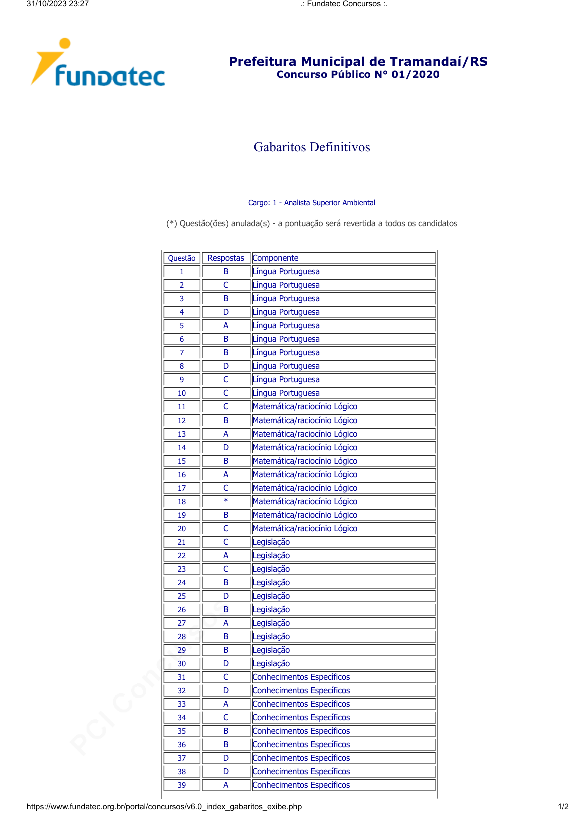 <p>pcimarkpci MDAwMDowMDAwOjAwMDA6MDAwMDowMDAwOmZmZmY6OThmODo0MGZh:RnJpLCAxMyBTZXAgMjAyNCAxNzoyMzoxNiAtMDMwMA==</p><p>www.pciconcursos.com.br</p><p>31/10/2023 23:27 .: Fundatec Concursos :.</p><p>https://www.fundatec.org.br/portal/concursos/v6.0_index_gabaritos_exibe.php 1/2</p><p>Prefeitura Municipal de Tramandaí/RS</p><p>Concurso Público N° 01/2020</p><p>Gabaritos Definitivos</p><p>Cargo: 1 - Analista Superior Ambiental</p><p>(*) Questão(ões) anulada(s) - a pontuação será revertida a todos os candidatos</p><p>Questão Respostas Componente</p><p>1 B Língua Portuguesa</p><p>2 C Língua Portuguesa</p><p>3 B Língua Portuguesa</p><p>4 D Língua Portuguesa</p><p>5 A Língua Portuguesa</p><p>6 B Língua Portuguesa</p><p>7 B Língua Portuguesa</p><p>8 D Língua Portuguesa</p><p>9 C Língua Portuguesa</p><p>10 C Língua Portuguesa</p><p>11 C Matemática/raciocínio Lógico</p><p>12 B Matemática/raciocínio Lógico</p><p>13 A Matemática/raciocínio Lógico</p><p>14 D Matemática/raciocínio Lógico</p><p>15 B Matemática/raciocínio Lógico</p><p>16 A Matemática/raciocínio Lógico</p><p>17 C Matemática/raciocínio Lógico</p><p>18 * Matemática/raciocínio Lógico</p><p>19 B Matemática/raciocínio Lógico</p><p>20 C Matemática/raciocínio Lógico</p><p>21 C Legislação</p><p>22 A Legislação</p><p>23 C Legislação</p><p>24 B Legislação</p><p>25 D Legislação</p><p>26 B Legislação</p><p>27 A Legislação</p><p>28 B Legislação</p><p>29 B Legislação</p><p>30 D Legislação</p><p>31 C Conhecimentos Específicos</p><p>32 D Conhecimentos Específicos</p><p>33 A Conhecimentos Específicos</p><p>34 C Conhecimentos Específicos</p><p>35 B Conhecimentos Específicos</p><p>36 B Conhecimentos Específicos</p><p>37 D Conhecimentos Específicos</p><p>38 D Conhecimentos Específicos</p><p>39 A Conhecimentos Específicos</p><p>pcimarkpci MDAwMDowMDAwOjAwMDA6MDAwMDowMDAwOmZmZmY6OThmODo0MGZh:RnJpLCAxMyBTZXAgMjAyNCAxNzoyMzoxNiAtMDMwMA==</p><p>www.pciconcursos.com.br</p><p>31/10/2023 23:27 .: Fundatec Concursos :.</p><p>https://www.fundatec.org.br/portal/concursos/v6.0_index_gabaritos_exibe.php 2/2</p><p>40 A Conhecimentos Específicos</p><p>Imprimir</p><p>Assinatura Eletrônica: 16247.5</p><p>pcimarkpci MDAwMDowMDAwOjAwMDA6MDAwMDowMDAwOmZmZmY6OThmODo0MGZh:RnJpLCAxMyBTZXAgMjAyNCAxNzoyMzoxNiAtMDMwMA==</p><p>www.pciconcursos.com.br</p><p>31/10/2023 23:29 .: Fundatec Concursos :.</p><p>https://www.fundatec.org.br/portal/concursos/v6.0_index_gabaritos_exibe.php 1/2</p><p>Prefeitura Municipal de Tramandaí/RS</p><p>Concurso Público N° 01/2020</p><p>Gabaritos Definitivos</p><p>Cargo: 2 - Assistente Social</p><p>(*) Questão(ões) anulada(s) - a pontuação será revertida a todos os candidatos</p><p>Questão Respostas Componente</p><p>1 B Língua Portuguesa</p><p>2 C Língua Portuguesa</p><p>3 B Língua Portuguesa</p><p>4 D Língua Portuguesa</p><p>5 A Língua Portuguesa</p><p>6 B Língua Portuguesa</p><p>7 B Língua Portuguesa</p><p>8 D Língua Portuguesa</p><p>9 C Língua Portuguesa</p><p>10 C Língua Portuguesa</p><p>11 C Matemática/raciocínio Lógico</p><p>12 B Matemática/raciocínio Lógico</p><p>13 A Matemática/raciocínio Lógico</p><p>14 D Matemática/raciocínio Lógico</p><p>15 B Matemática/raciocínio Lógico</p><p>16 A Matemática/raciocínio Lógico</p><p>17 C Matemática/raciocínio Lógico</p><p>18 * Matemática/raciocínio Lógico</p><p>19 B Matemática/raciocínio Lógico</p><p>20 C Matemática/raciocínio Lógico</p><p>21 C Legislação</p><p>22 A Legislação</p><p>23 C Legislação</p><p>24 B Legislação</p><p>25 D Legislação</p><p>26 B Legislação</p><p>27 A Legislação</p><p>28 B Legislação</p><p>29 B Legislação</p><p>30 D Legislação</p><p>31 B Conhecimentos Específicos</p><p>32 C Conhecimentos Específicos</p><p>33 A Conhecimentos Específicos</p><p>34 C Conhecimentos Específicos</p><p>35 D Conhecimentos Específicos</p><p>36 C Conhecimentos Específicos</p><p>37 B Conhecimentos Específicos</p><p>38 D Conhecimentos Específicos</p><p>39 A Conhecimentos Específicos</p><p>pcimarkpci MDAwMDowMDAwOjAwMDA6MDAwMDowMDAwOmZmZmY6OThmODo0MGZh:RnJpLCAxMyBTZXAgMjAyNCAxNzoyMzoxNiAtMDMwMA==</p><p>www.pciconcursos.com.br</p><p>31/10/2023 23:29 .: Fundatec Concursos :.</p><p>https://www.fundatec.org.br/portal/concursos/v6.0_index_gabaritos_exibe.php 2/2</p><p>40 A Conhecimentos Específicos</p><p>Imprimir</p><p>Assinatura Eletrônica: 15937.5</p><p>pcimarkpci MDAwMDowMDAwOjAwMDA6MDAwMDowMDAwOmZmZmY6OThmODo0MGZh:RnJpLCAxMyBTZXAgMjAyNCAxNzoyMzoxNiAtMDMwMA==</p><p>www.pciconcursos.com.br</p><p>31/10/2023 23:29 .: Fundatec Concursos :.</p><p>https://www.fundatec.org.br/portal/concursos/v6.0_index_gabaritos_exibe.php 1/2</p><p>Prefeitura Municipal de Tramandaí/RS</p><p>Concurso Público N° 01/2020</p><p>Gabaritos Definitivos</p><p>Cargo: 3 - Contador</p><p>(*) Questão(ões) anulada(s) - a pontuação será revertida a todos os candidatos</p><p>Questão Respostas Componente</p><p>1 B Língua Portuguesa</p><p>2 C Língua Portuguesa</p><p>3 B Língua Portuguesa</p><p>4 D Língua Portuguesa</p><p>5 A Língua Portuguesa</p><p>6 B Língua Portuguesa</p><p>7 B Língua Portuguesa</p><p>8 D Língua Portuguesa</p><p>9 C Língua Portuguesa</p><p>10 C Língua Portuguesa</p><p>11 C Matemática/raciocínio Lógico</p><p>12 B Matemática/raciocínio Lógico</p><p>13 A Matemática/raciocínio Lógico</p><p>14 D Matemática/raciocínio Lógico</p><p>15 B Matemática/raciocínio Lógico</p><p>16 A Matemática/raciocínio Lógico</p><p>17 C Matemática/raciocínio Lógico</p><p>18 * Matemática/raciocínio Lógico</p><p>19 B Matemática/raciocínio Lógico</p><p>20 C Matemática/raciocínio Lógico</p><p>21 C Legislação</p><p>22 A Legislação</p><p>23 C Legislação</p><p>24 B Legislação</p><p>25 D Legislação</p><p>26 B Legislação</p><p>27 A Legislação</p><p>28 B Legislação</p><p>29 B Legislação</p><p>30 D Legislação</p><p>31 B Conhecimentos Específicos</p><p>32 C Co