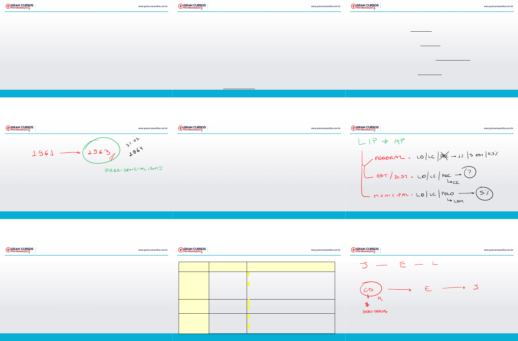 <p>Título I</p><p>Princípios Fundamentais</p><p>(artigos 1º a 4º)</p><p>Aragonê Fernandes</p><p>TEXTO CONSTITUCIONAL</p><p>Art. 1º A República Federativa do Brasil, formada pela união indissolúvel dos</p><p>Estados e Municípios e do Distrito Federal, constitui-se em Estado Democrático</p><p>de Direito e tem como fundamentos:</p><p>I - a soberania;</p><p>II - a cidadania;</p><p>III - a dignidade da pessoa humana;</p><p>IV - os valores sociais do trabalho e da livre iniciativa;</p><p>V - o pluralismo político.</p><p>Parágrafo único. Todo o poder emana do povo, que o exerce por meio de</p><p>representantes eleitos ou diretamente, nos termos desta Constituição.</p><p>Princípios Fundamentais</p><p>• Forma de Estado: Unitário x Federação x Confederação</p><p>• Forma de Governo: Monarquia x República</p><p>• Sistema de Governo: Parlamentarismo x Presidencialismo</p><p>• Regime de Governo: Ditadura x Democracia</p><p>Cláusula pétrea implícita?</p><p>FUNDAMENTOS DA RFB</p><p>• Mnemônico: SO – CI – DI – VA - PLU</p><p>• Poder: titularidade x exercício</p><p>• Democracia mista ou semidireta: indireta (representativa) + direta</p><p>• Iniciativa popular de lei nas diferentes esferas de governo</p><p>TEXTO CONSTITUCIONAL</p><p>Art. 2º São Poderes da União, independentes e harmônicos entre si, o</p><p>Legislativo, o Executivo e o Judiciário.</p><p>• Montesquieu e a teoria dos freios e contrapesos</p><p>• Posicionamento constitucional do Ministério Público, Defensoria Pública e do</p><p>Tribunal de Contas</p><p>SEPARAÇÃO DOS PODERES</p><p>Poder Função típica Funções atípicas</p><p>Executivo Administrar (executar)</p><p>1 legislar: por exemplo, ao editar uma medida provisória</p><p>ou um decreto autônomo.</p><p>2 julgar: julgamentos feitos pelo CADE acerca da possível</p><p>formação de cartéis ou outras formas de violação da</p><p>concorrência. Ainda, os julgamentos feitos pelo CARF,</p><p>órgão envolvido na Operação Zelotes.</p><p>Judiciário Julgar</p><p>1 legislar: elaboração de Regimentos Internos.</p><p>2 administrar: ‘cuidar’ de seus servidores. Ex.: conceder</p><p>férias.</p><p>Legislativo Legislar e fiscalizar</p><p>1 julgar: processar e julgar as autoridades indicadas pela</p><p>CF/88 (art. 52). Ex.: Pres. da República.</p><p>2 administrar: ‘cuidar’ de seus servidores. Ex.: concessão</p><p>de horas extras.</p><p>TEXTO CONSTITUCIONAL</p><p>Art. 3º Constituem objetivos fundamentais da República Federativa do Brasil:</p><p>I - construir uma sociedade livre, justa e solidária;</p><p>II - garantir o desenvolvimento nacional;</p><p>III - erradicar a pobreza e a marginalização e reduzir as desigualdades sociais e</p><p>regionais;</p><p>IV - promover o bem de todos, sem preconceitos de origem, raça, sexo, cor,</p><p>idade e quaisquer outras formas de discriminação.</p><p>OBJETIVOS INTERNOS</p><p>• Promoção do bem-estar de todos: união homoafetiva e transgêneros</p><p>• Atenção para a substantivização dos verbos no infinitivo</p><p>TEXTO CONSTITUCIONAL</p><p>Art. 4º A República Federativa do Brasil rege-se nas suas relações internacionais pelos</p><p>seguintes princípios:</p><p>I - independência nacional;</p><p>II - prevalência dos direitos humanos;</p><p>III - autodeterminação dos povos;</p><p>IV - não-intervenção;</p><p>V - igualdade entre os Estados;</p><p>VI - defesa da paz;</p><p>VII - solução pacífica dos conflitos;</p><p>VIII - repúdio ao terrorismo e ao racismo;</p><p>IX - cooperação entre os povos para o progresso da humanidade;</p><p>X - concessão de asilo político.</p><p>Parágrafo único. A República Federativa do Brasil buscará a integração econômica, política,</p><p>social e cultural dos povos da América Latina, visando à formação de uma</p><p>de nações.</p><p>Princípios nas Relações Internacionais</p><p>• Asilo político x refúgio político</p><p>• O caso Cesare Battisti</p><p>• Repúdio ao terrorismo e ao racismo</p><p>• Racismo social e figuras equiparadas</p><p>• Injúria racial</p><p>• Estrangeiros com família brasileira: expulsão x extradição</p><p>Título II</p><p>Direitos e Garantias Fundamentais</p><p>(artigos 5º a 17)</p><p>Aragonê Fernandes</p><p>Teoria Geral dos Direitos Fundamentais</p><p>Aragonê Fernandes</p><p>TEORIA GERAL DOS DIREITOS FUNDAMENTAIS</p><p>Características:</p><p>• Relatividade</p><p>• Concorrência</p><p>• Imprescritibilidade</p><p>• Inalienabilidade</p><p>• Irrenunciabilidade</p><p>• Historicidade</p><p>• Extensão a pessoas jurídicas?</p><p>• Extensão a estrangeiros?</p><p>EVOLUÇÃO DOS DIREITOS FUNDAMENTAIS</p><p>1ª Geração / Dimensão: “LIBERDADE” – absenteísmo ou abstensionismo</p><p>estatal (liberdades clássicas)</p><p>2ª Geração / Dimensão: “IGUALDADE” – welfare state ou estado do bem-estar</p><p>social (direitos sociais, culturais e econômicos)</p><p>3ª Geração / Dimensão: “FRATERNIDADE” – direitos trans/meta individuais,</p><p>difusos ou coletivos (meio ambiente, consumidor, aposentadoria)</p><p>Há outras gerações/dimensões?</p><p>OS QUATRO STATUS DE JELLINEK</p><p>> Status Negativo – proximidade com a 1ª geração/dimensão</p><p>> Status Positivo – proximidade com a 2ª geração/dimensão</p><p>> Status Ativo – possibilidade de o cidadão intervir na vontade estatal (direitos</p><p>políticos)</p><p>> Status Passivo – possibilidade de o Estado intervir na relação entre</p><p>particulares</p><p>DIMENSÕES DE APLICAÇÃO DOS DIREITOS FUNDAMENTAIS</p><p>VERTICAL HORIZONTAL TRANSVERSAL ou</p><p>DIAGONAL</p><p>DIREITOS e DEVERES INDIVIDUAIS e COLETIVOS</p><p>(Artigo 5º da CF)</p><p>Aragonê Fernandes</p><p>TEXTO CONSTITUCIONAL</p><p>Art. 5º Todos são iguais perante a lei, sem distinção de qualquer natureza,</p><p>garantindo-se aos brasileiros e aos estrangeiros residentes no País a</p><p>inviolabilidade do direito