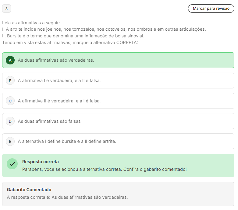 <p>3 Marcar para revisão Leia as afirmativas a seguir: I. A artrite incide nos joelhos, nos tornozelos, nos cotovelos, nos ombros e em outras articulações. II. Bursite é O termo que denomina uma inflamação de bolsa sinovial. Tendo em vista estas afirmativas, marque a alternativa CORRETA: A As duas afirmativas são verdadeiras. B A afirmativa I é verdadeira, e a II é falsa. C A afirmativa é verdadeira, e a é falsa. D As duas afirmativas são falsas E A alternativa define bursite e a II define artrite. Resposta correta Parabéns, você selecionou a alternativa correta. Confira gabarito comentado! Gabarito Comentado A resposta correta é: As duas afirmativas são verdadeiras.</p>
