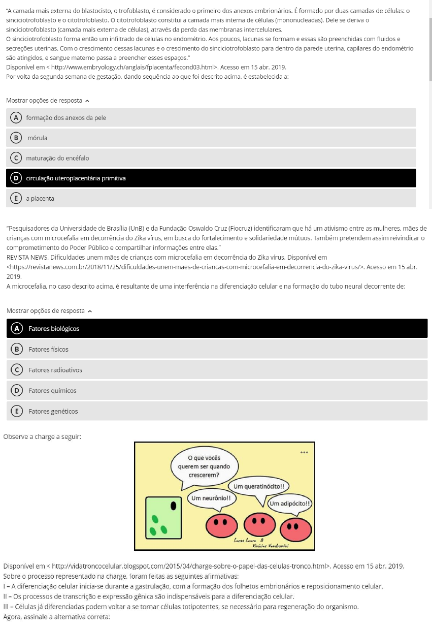 <p>"A camada mais externa do blastocisto, o trofoblasto, é considerado o primeiro dos anexos embrionários. É formado por duas camadas de células: o sinciciotrofoblasto e citotrofoblasto. o citotrofoblasto constitui a camada mais interna de células (mononucleadas). Dele se deriva o sinciciotrofoblasto (camada mais externa de células), através da perda das membranas intercelulares. o sinciciotrofoblasto forma então um infiltrado de células no endométrio. Aos poucos, lacunas se formam e essas são preenchidas com fluidos e secreções uterinas. Com o crescimento dessas lacunas e o crescimento do sinciciotrofoblasto para dentro da parede uterina, capilares do endométrio são atingidos, e sangue materno passa a preencher esses espaços." Disponível em < em 15 abr. 2019. Por volta da segunda semana de gestação, dando sequência ao que foi descrito acima, é estabelecida a: Mostrar opções de resposta A formação dos anexos da pele B mórula maturação do encéfalo D circulação uteroplacentária primitiva E placenta "Pesquisadores da Universidade de Brasília (UnB) e da Fundação Oswaldo Cruz (Fiocruz) identificaram que há um ativismo entre as mulheres, mães de crianças com microcefalia em decorrência do Zika vírus, em busca do fortalecimento e solidariedade Também pretendem assim reivindicar o comprometimento do Poder Público e compartilhar informações entre elas." REVISTA NEWS. Dificuldades unem mães de crianças com microcefalia em decorrência do Zika vírus. Disponível em 15 abr. 2019. A microcefalia, no caso descrito acima, é resultante de uma interferência na diferenciação celular e na formação do tubo neural decorrente de: Mostrar opções de resposta A Fatores biológicos B Fatores físicos Fatores radioativos D Fatores químicos E Fatores genéticos Observe a charge a seguir: o que vocês querem ser quando crescerem? Um queratinócito!! Um neurônio!! Um Vinicius Disponível em 15 abr. 2019. Sobre o processo representado na charge, foram feitas as seguintes afirmativas: A diferenciação celular inicia-se durante a gastrulação, com a formação dos folhetos embrionários e reposicionamento Os processos de transcrição e expressão gênica são indispensáveis para a diferenciação III Células já diferenciadas podem voltar a se tornar células totipotentes, se necessário para regeneração do organismo. Agora, assinale a alternativa correta:</p><p>Mostrar opções de resposta A Apenas a alternativa está correta. B Apenas as alternativas II e III estão corretas. C Apenas a afirmativa II está correta. D Apenas as afirmativas e II estão corretas. E As alternativas I, III estão corretas. A neurulação caracteriza-se pela formação do tubo neural, que dará origem ao Sistema Nervoso Central (SNC). Sua formação início pela diferenciação de células ectodérmicas, que adquire o aspecto de uma placa achatada denominada placa neural, desenvolvendo-se ao longo do dorso do embrião, como podemos observar na figura a seguir: Placa Neural ... Epiderme Dobramento Prega Neural Sulco neural Epiderme Crista Neural Tubo Neural Disponível em 15 abr. 2019. Qual é a estrutura responsável pela indução da placa neural e que também define o eixo craniocaudal do embrião? Mostrar opções de resposta ^ A Notocorda B Crista neural C Sulco neural D Epiderme E Nêurula</p><p>o desenvolvimento embrionário vai até a oitava semana de gestação. A partir deste período, o embrião, praticamente já formado, dá origem ao feto e inicia-se, então, o período fetal que vai da nona semana até o nascimento. período fetal é caracterizado: Mostrar opções de resposta A pela divisão mitótica sem crescimento no tamanho do embrião, apenas na quantidade de células que o forma. B pelo rápido crescimento e maturação de órgãos e tecidos. C pela formação do arquêntero, que o tubo digestório primitivo. D pela diferenciação celular a partir dos folhetos germinativos. E pelo desenvolvimento do tubo neural a partir da invaginação da placa neural. "A Inseminação Artificial (IA), também conhecida como Inseminação Intrauterina (IIU), consiste na colocação de uma amostra de esperma, preparada previamente no laboratório, no interior do útero materno a fim de aumentar o potencial de fecundação dos espermatozoides. Com este procedimento é possível sincronizar o melhor momento para o encontro dos gametas masculinos com o Desta forma, tratamos de diminuir a distância que separa o óvulo e o espermatozoide para que o casal engravide." Disponível em Acesso em 15 abr. 2019. De acordo com o exposto, podemos concluir que este tipo de inseminação favorece a ocorrência de qual etapa do desenvolvimento embriológico? Mostrar opções de resposta A blastogênese B fecundação C neurulação D nidação E gastrulação Em um experimento, para verificar o que acontece com as hemácias em diferentes tipos de concentração de solvente, foram obtidos os seguintes resultados: 1 2 3 Figura 6 Fonte: Reprodução Os meios em que se encontram as hemácias são, RESPECTIVAMENTE: Mostrar opções de resposta A Hipotônico, isotônico e hipertônico. B isotônico e hipotônico. Isotônico, hipotônico e hipertônico. D Hipertônico, hipotônico e isotônico. E Isotônico, hipertônico e hipotônico.</p><p>Chamamos de hematose processo no qual ocorrem trocas gasosas entre os alvéolos pulmonares e o sangue. Durante a hematose, o oxigênio liga-se às hemácias para ser transportado para os tecidos e o gás carbônico é eliminado para o meio externo. Essa troca gasosa é um exemplo de: Mostrar opções de resposta A Simporte. B Difusão facilitada. D Antiporte. E Difusão simples. Observe a imagem a seguir: Espaço extracelular Vinculina Actina Actina Caderina Catenina Célula 1 Membrana Plasmática Célula 2 As junções aderentes, também chamadas de zônulas de adesão, realizam a ancoragem entre as células vizinhas, mas não proporcionam a mesma vedação q