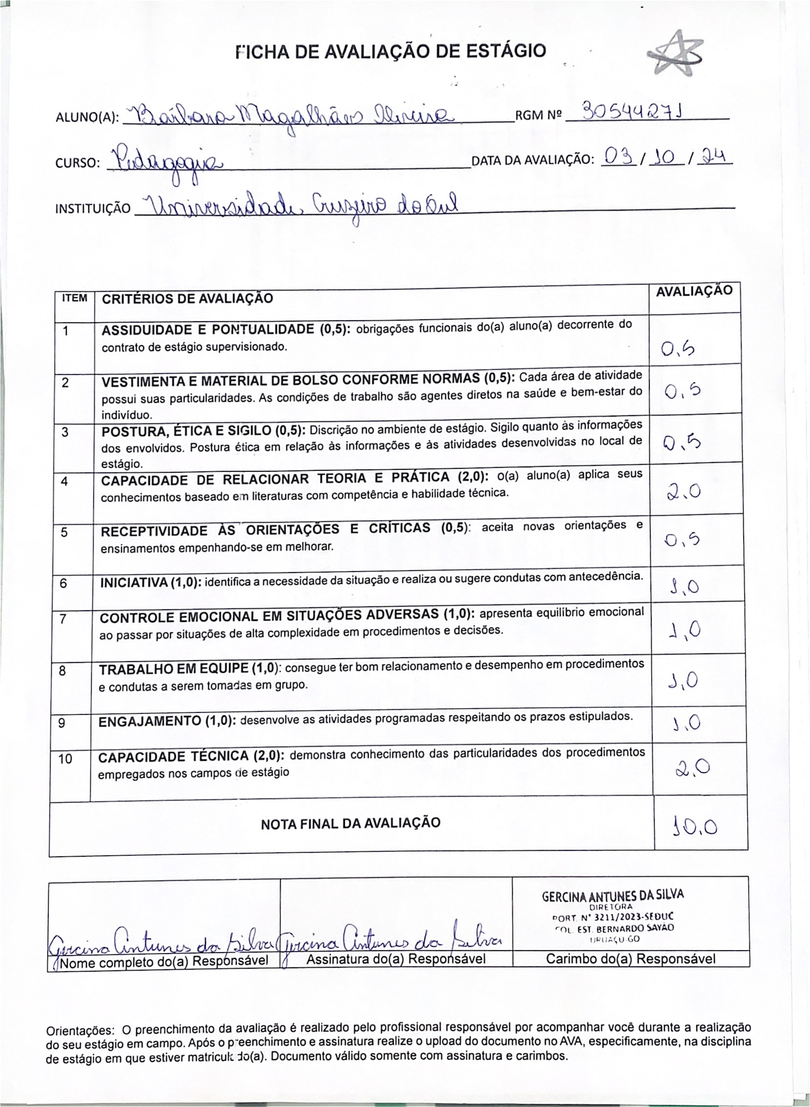 <p>FICHA DE AVALIAÇÃO DE ESTÁGIO ALUNO(A): Barbara RGM 30544271 CURSO: DATA DA AVALIAÇÃO: INSTITUIÇÃO Universidade ITEM CRITÉRIOS DE AVALIAÇÃO AVALIAÇÃO 1 ASSIDUIDADE E PONTUALIDADE (0,5): obrigações funcionais do(a) aluno(a) decorrente do contrato de estágio supervisionado. 05 2 VESTIMENTA E MATERIAL DE BOLSO CONFORME NORMAS (0,5): Cada área de atividade possui suas particularidades. As condições de trabalho são agentes diretos na saúde e bem-estar do indivíduo. 3 POSTURA, ÉTICA E SIGILO (0,5): Discrição no ambiente de estágio. Sigilo quanto às informações dos envolvidos. Postura ética em relação às informações e às atividades desenvolvidas no local de 05 estágio. 4 CAPACIDADE DE RELACIONAR TEORIA E PRÁTICA (2,0): o(a) aluno(a) aplica seus conhecimentos baseado em literaturas com competência e habilidade 2.0 5 RECEPTIVIDADE ÀS ORIENTAÇÕES E CRÍTICAS (0,5): aceita novas orientações e 05 ensinamentos empenhando-se em melhorar. 6 INICIATIVA (1,0): identifica a necessidade da situação e realiza ou sugere condutas com antecedência. 7 CONTROLE EMOCIONAL EM SITUAÇÕES ADVERSAS (1,0): apresenta emocional ao passar por situações de alta complexidade em procedimentos e decisões. 10 8 TRABALHO EM EQUIPE (1,0): consegue ter bom relacionamento e desempenho em procedimentos e condutas a serem tomadas em grupo. 9 ENGAJAMENTO (1,0): desenvolve as atividades programadas respeitando os prazos estipulados. 1.0 10 CAPACIDADE TÉCNICA (2,0): demonstra conhecimento das particularidades dos procedimentos empregados nos campos de estágio NOTA FINAL DA AVALIAÇÃO 10.0 GERCINA ANTUNES DA SILVA DIRETORA PORT N° 3211/2023-SEDUC do Assinatura do(a) Responsável da COL BERNARDO Nome completo do(a) Responsável Carimbo do(a) Responsável Orientações: preenchimento da avaliação é realizado pelo profissional responsável por acompanhar você durante a realização do seu estágio em campo. Após o preenchimento e assinatura realize o upload do documento no AVA, especificamente, na disciplina de estágio em que estiver matricula do(a). Documento válido somente com assinatura e carimbos.</p>