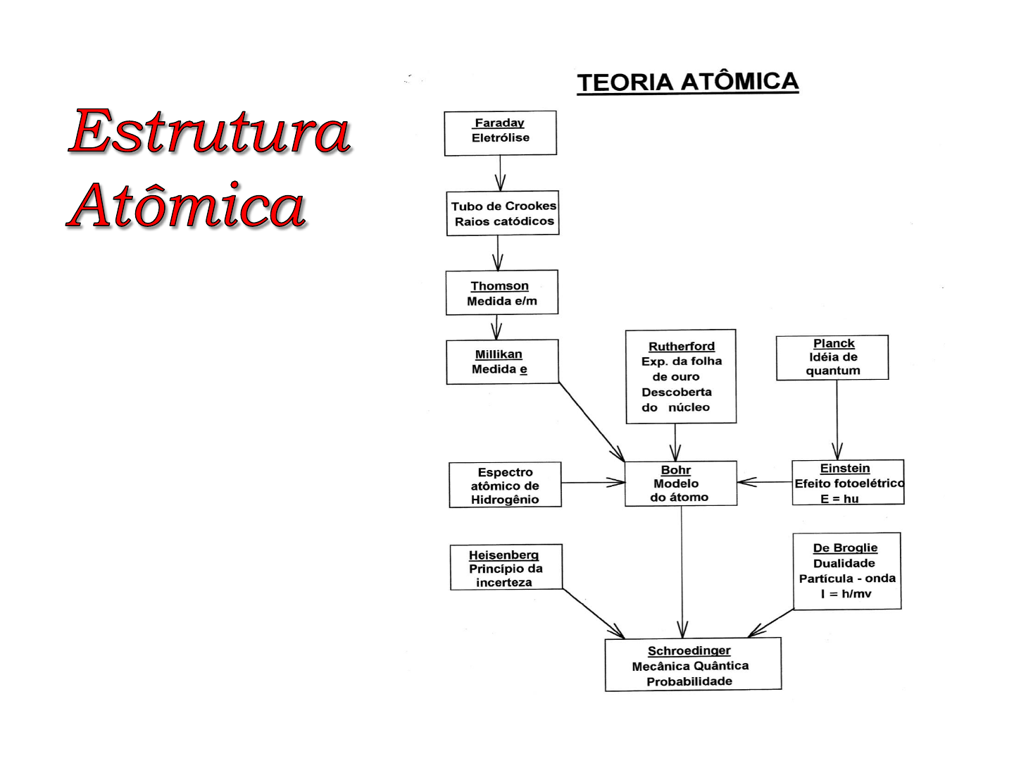<p>Raios Catódicos</p><p>Resultados independem do gás</p><p>usado para preencher a ampola de</p><p>vidro.</p><p>Feixe é formado por partículas que</p><p>possuem massa.</p><p>Feixe é capaz de girar um catavento</p><p>no interior da ampola.</p><p>Feixe é defletido por um campo</p><p>elétrico ou campo magnético.</p><p> Raio catódico = elétron</p><p>Elétrons possuem carga negativa</p><p>(A) Efeito de um obstáculo no “caminho dos raios catódicos.</p><p>High</p><p>voltage</p><p>cathode</p><p>source of</p><p>high voltage</p><p>yellow-green</p><p>fluorescence</p><p>shadow</p><p>(B) O efeito de um campo elétrico.</p><p>High</p><p>voltage</p><p>cathode</p><p>source of</p><p>high voltage</p><p>positive</p><p>plate</p><p>negative</p><p>plate</p><p>anode</p><p>source of</p><p>low voltage</p><p>+</p><p>-</p><p>Tubos de Crookes e a descoberta do elétron</p><p>Experimento de Thomson (1895)</p><p>Determinação da razão carga/massa do elétron = -1,76 x 1011 C/kg.</p><p>O experimento de Millikan (1903) – determinação da</p><p>carga do elétron</p><p>Determinação da carga do elétron = -1,602 x 10-19 C. Logo a</p><p>massa do elétron é 9,1 x 10-31kg.</p><p>O experimento de Rutherford e o átomo nuclear (1911)</p><p> Experimento realizado por Geiger e Marsden → 1 partícula</p><p>alfa em 20.000 retornava à direção de partida!</p><p>A natureza ondulatória da luz</p><p>c = λ x ν</p><p>c = velocidade da luz (m/s)</p><p>λ = comprimento de onda (m)</p><p>ν = frequência (⅟s = Hz)</p><p> Radiação eletromagnética (ou</p><p>energia radiante) é a emissão e</p><p>transmissão de energia através do</p><p>espaço na forma de ondas.</p><p>A hipótese de Planck</p><p>Energia quantizada e fótons</p><p> A distribuição dos λ</p><p>emitidos depende, em</p><p>alguma extensão, da</p><p>composição do material.</p><p> Planck sugeriu que quando a radiação eletromagnética interage</p><p>com a matéria, energia somente pode ser absorvida ou</p><p>emitida em certas quantidades discretas (QUANTUM); ou</p><p>seja, existe uma quantidade mínima que pode ser emitida (ou</p><p>absorvida) em qualquer instante.</p><p> Quantum = menor quantidade de energia que pode ser emitida</p><p>(ou absorvida) na forma de radiação eletromagnética.</p><p> A energia de um quantum é dada pela equação de Planck:</p><p>E = h x ν</p><p>Onde h é a constante de Planck = 6,62 x 10-34 J.s</p><p>A intensidade da radiação = número de quanta/s.</p><p>O efeito fotoelétrico – a explicação de Einstein</p><p> Luz incidindo em uma superfície metálica limpa faz com que</p><p>elétrons sejam ejetados da superfície.</p><p>Para cada metal existe uma frequência mínima de luz, abaixo da</p><p>qual nenhum elétron é emitido.</p><p> Einstein sugeriu que não devemos pensar em um feixe de luz</p><p>como uma onda, mas como um feixe de partículas. Ele supôs</p><p>que a energia radiante atingindo a superfície metálica é um</p><p>fluxo de pacotes minúsculos de energia (atualmente chamados</p><p>fótons – portadores de energia). Cada fóton tem sua energia</p><p>proporcional à freqüência da luz: Ef = h x  .</p><p> Agora consideremos dois feixes de luz com a mesma</p><p>freqüência (a qual é superior à freqüência crítica), mas</p><p>intensidades diferentes. O feixe mais intenso consiste de um</p><p>número maior de fótons, logo o número de elétrons ejetados é</p><p>maior que o número de elétrons produzidos pelo feixe menos</p><p>intenso. Quanto mais intensa a luz, maior o número de</p><p>elétrons emitidos pelo metal: Iluz α no de e-</p><p>(s) ejetados. O</p><p>aumento da intensidade da luz dá mais fótons, mas não</p><p>muda a sua energia individual.</p><p>O espectro atômico de raias ou linhas e o modelo atômico de</p><p>Bohr (1913).</p><p> A luz emitida por átomos depois de absorverem energia extra,</p><p>fornece dados sobre a estrutura atômica como conhecemos hoje.</p><p> CADA ELEMENTO QUÍMICO TEM UM ESPECTRO DE</p><p>EMISSÃO CARACTERÍSTICO.</p><p> Balmer e Rydberg propuseram equações matemáticas simples:</p><p>Equação de Rydberg</p><p>onde n é um número inteiro associado a cada raia e R é a cte</p><p>de Rydberg (1,096776 x 107 m-1, ou 2,18 x 10-18 J ou 3,29 x 1015</p><p>Hz).</p><p> De forma genérica a Equação de Rydberg pode ser escrita</p><p>como:</p><p>onde n1 = 1, 2, 3, ..... e n2 = (n1 +1), (n1 +2), (n1 +3), ....</p><p>-</p><p>-</p><p>Bohr relacionou os espectros dos átomos excitados com a Teoria</p><p>Quântica de Planck e às idéias de Rutherford sobre os elétrons estarem</p><p>fora do núcleo.</p><p>1) Em um átomo de hidrogênio o elétron se desloca em uma órbita</p><p>circular em volta do núcleo.</p><p>2) O elétron do átomo de hidrogênio somente pode ocupar certas</p><p>órbitas ou níveis de energia.</p><p>3) A energia de um elétron na n-ésima órbita do átomo de hidrogênio</p><p>é dada por:</p><p>ou</p><p>onde n é o nível da órbita e é adimensional com valores inteiros..</p><p>4) A diferença de energia entre os níveis corresponde a um quantum de</p><p>energia.</p><p>ou</p><p>A órbita com menor energia é n=1, é a mais próxima do</p><p>núcleo e a que deve ser ocupada pelo elétron.</p><p> Um conceito importante, introduzido por Bohr e aceito até hoje, é que um</p><p>elétron em um átomo permanece no seu nível de energia mais baixo, a</p><p>menos que seja perturbado. A energia é absorvida ou emitida quando o</p><p>elétron passa de um nível de energia para outro.</p><p>A dualidade partícula onda do elétron</p><p>A hipótese de de Broglie</p><p> De Broglie deduziu que as propriedades corpusculares e</p><p>ondulatórias se relacionam pela seguinte expressão:</p><p>onde λ é o comprimento de onda da partícula, h é a constante</p><p>de Planck e o produto mv o momento linear da partícula.</p><p>A difração da luz – fenômeno típico ondulatório</p><p>O princípio da incerteza</p><p> O princípio da incerteza de Heisenb