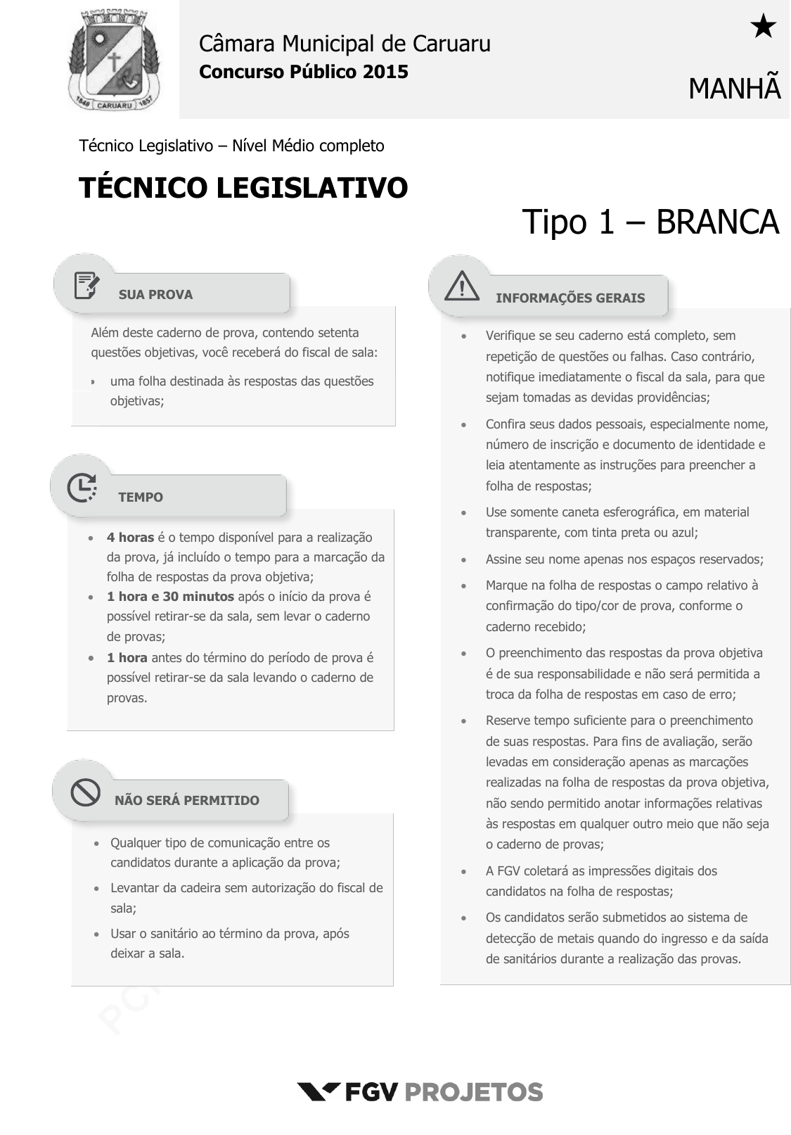 <p>pcimarkpci MjgwNDowMDE4OjAwZDk6YTdlYzowMDAxOjAwMDA6ZDUzZTo0NzRk:V2VkLCAwOCBOb3YgMjAyMyAwNzozMDoxMiAtMDMwMA==</p><p>www.pciconcursos.com.br</p><p>Câmara Municipal de Caruaru</p><p></p><p>Concurso Público 2015</p><p>MANHÃ</p><p>Técnico Legislativo – Nível Médio completo</p><p>TÉCNICO LEGISLATIVO</p><p>Tipo 1 – BRANCA</p><p>Além deste caderno de prova, contendo setenta</p><p>questões objetivas, você receberá do fiscal de sala:</p><p> uma folha destinada às respostas das questões</p><p>objetivas;</p><p></p><p> Verifique se seu caderno está completo, sem</p><p>repetição de questões ou falhas. Caso contrário,</p><p>notifique imediatamente o fiscal da sala, para que</p><p>sejam tomadas as devidas providências;</p><p> Confira seus dados pessoais, especialmente nome,</p><p>número de inscrição e documento de identidade e</p><p>leia atentamente as instruções para preencher a</p><p>folha de respostas;</p><p> Use somente caneta esferográfica, em material</p><p>transparente, com tinta preta ou azul;</p><p> Assine seu nome apenas nos espaços reservados;</p><p> Marque na folha de respostas o campo relativo à</p><p>confirmação do tipo/cor de prova, conforme o</p><p>caderno recebido;</p><p> O preenchimento das respostas da prova objetiva</p><p>é de sua responsabilidade e não será permitida a</p><p>troca da folha de respostas em caso de erro;</p><p> Reserve tempo suficiente para o preenchimento</p><p>de suas respostas. Para fins de avaliação, serão</p><p>levadas em consideração apenas as marcações</p><p>realizadas na folha de respostas da prova objetiva,</p><p>não sendo permitido anotar informações relativas</p><p>às respostas em qualquer outro meio que não seja</p><p>o caderno de provas;</p><p> A FGV coletará as impressões digitais dos</p><p>candidatos na folha de respostas;</p><p> Os candidatos serão submetidos ao sistema de</p><p>detecção de metais quando do ingresso e da saída</p><p>de sanitários durante a realização das provas.</p><p> 4 horas é o tempo disponível para a realização</p><p>da prova, já incluído o tempo para a marcação da</p><p>folha de respostas da prova objetiva;</p><p> 1 hora e 30 minutos após o início da prova é</p><p>possível retirar-se da sala, sem levar o caderno</p><p>de provas;</p><p> 1 hora antes do término do período de prova é</p><p>possível retirar-se da sala levando o caderno de</p><p>provas.</p><p> Qualquer tipo de comunicação entre os</p><p>candidatos durante a aplicação da prova;</p><p> Levantar da cadeira sem autorização do fiscal de</p><p>sala;</p><p> Usar o sanitário ao término da prova, após</p><p>deixar a sala.</p><p>SUA PROVA</p><p>TEMPO</p><p>NÃO SERÁ PERMITIDO</p><p>INFORMAÇÕES GERAIS</p><p>pcimarkpci MjgwNDowMDE4OjAwZDk6YTdlYzowMDAxOjAwMDA6ZDUzZTo0NzRk:V2VkLCAwOCBOb3YgMjAyMyAwNzozMDoxMiAtMDMwMA==</p><p>www.pciconcursos.com.br</p><p>pcimarkpci MjgwNDowMDE4OjAwZDk6YTdlYzowMDAxOjAwMDA6ZDUzZTo0NzRk:V2VkLCAwOCBOb3YgMjAyMyAwNzozMDoxMiAtMDMwMA==</p><p>www.pciconcursos.com.br</p><p>Câmara Municipal de Caruaru FGV – Projetos</p><p>Técnico Legislativo Tipo 1 – Cor BRANCA – Página 3</p><p>Língua Portuguesa</p><p>A charge a seguir refere-se às questões 01 e 02</p><p>(http://www.chargeonline.com.br/php/charges/AUTO_alecrim.jpg)</p><p>1</p><p>A charge mostra um posicionamento do chargista contrário à</p><p>redução da maioridade penal.</p><p>Assinale a opção que indica o componente da charge que não</p><p>colabora para a expressão desse posicionamento.</p><p>(A) A desproporção de tamanho entre o policial e o menino.</p><p>(B) A diferença qualitativa das armas dos personagens.</p><p>(C) A designação de “arma” dada à atiradeira.</p><p>(D) A utilização pelo policial de meios desproporcionais à</p><p>situação.</p><p>(E) O emprego de reticências após o título, obrigando o leitor a</p><p>uma reflexão.</p><p>2</p><p>Sob o ponto de vista do chargista, assinale a opção que indica o</p><p>detalhe gráfico inadequado para a caracterização visual dos</p><p>personagens.</p><p>(A) O policial é extremamente gordo, o que colabora para uma</p><p>sensação de despreparo para a função.</p><p>(B) O fato de o rosto do policial ser extremamente grande produz</p><p>o efeito de brutalidade e agressão.</p><p>(C) O detalhe de o chapéu do policial ser extremamente pequeno</p><p>marca também suas limitações de inteligência.</p><p>(D) As mãos levantadas do menino fazem com que seu pequeno</p><p>corpo apareça parcialmente, mostrando fragilidade e</p><p>pobreza.</p><p>(E) A circunstância de, mesmo rendido, o menino manter a</p><p>atiradeira numa das mãos indica o desrespeito dos cidadãos</p><p>pelas autoridades policiais.</p><p>Leia o texto a seguir e responda às questões 03, 04, 05 e 06.</p><p>A epidemia de dengue neste ano no Estado de São Paulo tem</p><p>provocado, em média, mais de uma morte por dia.</p><p>Desde o início do ano, já são ao menos 122 óbitos, segundo</p><p>levantamento da Folha de São Paulo em 60 dos 645 municípios</p><p>paulistas. Esse é o maior número em quatro anos e um dos mais</p><p>altos da série histórica do Ministério da Saúde.</p><p>O pico da doença, no entanto, ainda não chegou. Isso deve</p><p>ocorrer entre o fim de abril e o começo de maio, devido ao</p><p>comportamento do clima e à sazonalidade do mosquito</p><p>transmissor.</p><p>(Luiz Carlos Murauskas. Folhapress)</p><p>3</p><p>Na primeira frase do texto ocorre o emprego da forma verbal</p><p>“tem provocado”.</p><p>Esse tempo verbal mostra uma ação que</p><p>(A) se iniciou há muito pouco tempo.</p><p>(B) se encerrou em passado recente.</p><p>(C) se iniciou no passado e continua no presente.</p><p>(D) começou num momento anterior a outra ação passada.</p><p>(E) mostrou curta duração em passado recente.</p><p>4</p><p>O texto emprega algumas formas de pronomes demonstrativos:</p><p>“A epidemia de dengue neste (1) ano no Estado de São Paulo”;</p><p>