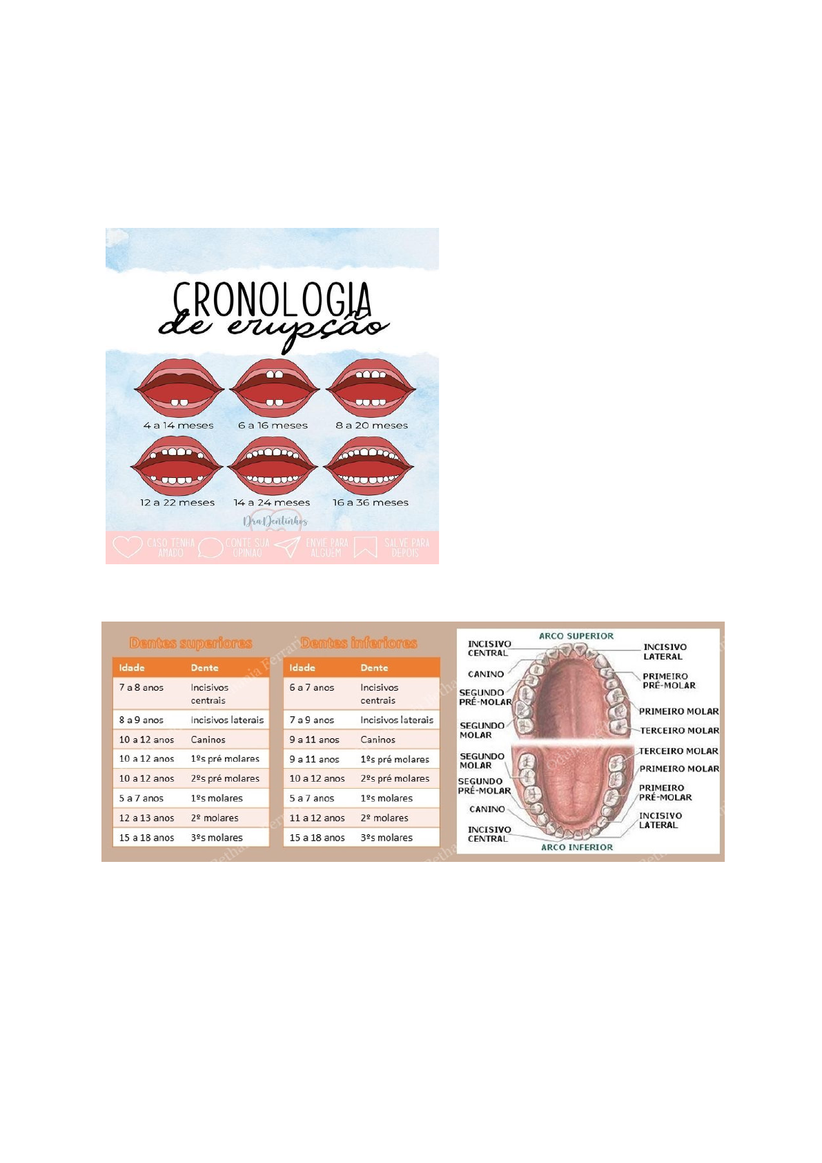 <p>Resumo geral Odontopediatria:</p><p>ORTODONTIA:</p><p>Cronologia da dentição decídua:</p><p>A dentição decídua não possui pré</p><p>molar;</p><p>Termina em torno de 10-12 anos, na</p><p>esfoliação completa de todos os</p><p>dentes decíduos</p><p>Dentição mista :</p><p>Começa com a erupção do 1º molar permanente</p><p>MALOCLUSÕES</p><p>Dependem de fatores extrínsecos e intrínsecos</p><p>Extrínsecos:</p><p>Ambiente: tarumas do nascimento, paralisia cerebral</p><p>Hábitos anormais de pressão/funcionais:</p><p>- Sucção normal (postura mandibular avançada, presso~es bucais excessivas)</p><p>- Sucção polegar e bico</p><p>- Interposição e sucção de língua</p><p>- Morder lábios e unhas</p><p>- Deglutição anormal</p><p>- Deglutição de fonação</p><p>- Anomalias respiratórias</p><p>- Amígdalas e adenoides</p><p>Hábitos deletérios:</p><p>- alteração no crescimento ósseo</p><p>- Más posições dentárias</p><p>- distúrbios na respiração</p><p>- distúrbios na fala</p><p>- Alteração no equilíbrio muscular facial</p><p>Deglutição com interposição lingual simples</p><p>- deglutição com contatos dentários anormais</p><p>- Relacionados com a sucção de chupeta e dedo</p><p>Deglutição com interposição lingual completa</p><p>- deglutição sem contato dentário e com língua projetada</p><p>- Respiração bucal</p><p>Sucção e morder o lábio</p><p>- Vestibuloversão dos incisivos superiores</p><p>Onicofagia (roer unhas)</p><p>- Mas posições dentárias</p><p>Postura</p><p>- alteração na posição mandibular</p><p>- Postura anormal da língua</p><p>Intrínsecos</p><p>Hereditariedade:</p><p>- Tamanho dente, língua e comprimento do arco, altura palato, apinhamento e</p><p>espaçamentos dos dentes.</p><p>OVERJET: Distância entre um dente e outro (classe II tem overjet grande)</p><p>OVERBITE: Quando morde; o ideal é menos da metade dos dentes inferiores.</p><p>TIPO FACIAL</p><p>BRAQUIFACIAL MESOFACIAL DOLICOFACIAL</p><p>- anomalias de número (supranumerários, perdas , ausências devido agenesia)</p><p>- Anomalias dimensionais</p><p>- Anomalias morfológicas</p><p>- Freio labial anormal</p><p>- Sequência anormal de erupção</p><p>- Anquiloses</p><p>- Cárie</p><p>- PERDA PREMATURA DE DECÍDUOS</p><p>ESPAÇO LIVRE DE NANCY:</p><p>Diferença entre a soma dos diâmetros mésio-distais dos caninos</p><p>e molares decíduos e a soma dos diâmetros mésio distais de</p><p>seus sucessor</p><p>( espaço que sobre quando cai os 2 molares e caninos decíduos</p><p>e nasce os 2º pré molares e canino permanente)</p><p>Retenção Prolongada</p><p>Causas:</p><p>- Falta de sincronia entre rizólise e rizogênese</p><p>- Rizólise: reabsorção radicular do dente decíduo</p><p>- Rizogênese formação radicular do dente permanente</p><p>- Rigidez periodonto</p><p>- anquilose</p><p>- ausência do permanente</p><p>Via eruptiva anormal:</p><p>Causas:</p><p>- Barreiras físicas</p><p>- Dentes supranumerários, raízes residuais, barreiras ósseas</p><p>- traumatismos</p><p>- tratamentos ortodônticos</p><p>- Distalizar molares</p><p>ORTODONTIA PREVENTIVA:</p><p>Orientar e conduzir o desenvolvimento dos dentes e ossos da face, a fim de evitar</p><p>problemas de oclusão dental no futuro</p><p>ORTODONTIA INTERCEPTATIVA:</p><p>Interceptar uma situação já existente de modo a desenvolver a oclusão anormal</p><p>ORTODONTIA CORRETIVA</p><p>Quando há necessidade de corrigir problemas de oclusão e alinhamento</p><p>CLASSIFICAÇÃO MÁ OCLUSÃO DE ANGLE</p><p>CLASSE I: cúspide mesio-vestibular do primeiro molar superior permanente oclui</p><p>com o sulco mesiovestibular do primeiro molar inferior permanente</p><p>CLASSE II : Quando a cúspide mesiovestibular do primeiro molar superior</p><p>permanente for ANTERIOR ao sulco mesio-vestibular do primeiro molar inferior</p><p>permanente</p><p>CLASSE III: Cúspide mesio-vestibular do primeiro molar superior permanente está</p><p>posicionada distalmente em relação ao sulco mesio-vestibular do primeiro molar</p><p>inferior permanente</p><p>APARELHOS USADOS NA ORTODONTIA:</p><p>Grampos:</p><p>MANTENEDOR DE ESPAÇO FIXO:</p><p>Banda Alça:</p><p>- Para perdas unitárias</p><p>- Não depende da cooperação do paciente</p><p>- Porém não evita a extrusão do dente antagonista e não restabelece função</p><p>mastigatória</p><p>Botão de Nance</p><p>- para perdas multiplas</p><p>- não depende da cooperação do paciente, é estetico e</p><p>não interfere na fala e fonação</p><p>- Porem atrapalha na higiene</p><p>Barra transpalatina</p><p>-Para perdas multiplas</p><p>-Não depende da cooperação do</p><p>paciente, é estético e não interfere</p><p>na deglutiçãoe fonação</p><p>Indicações</p><p>-Ancoragem dos primeiros molares</p><p>superiores</p><p>-Correção da inclinação dos</p><p>molares</p><p>-Distalização dos molares</p><p>-controle do torque dos molares</p><p>MANTENEDOR DE ESPAÇO REMOVÍVEL:</p><p>- Perdas anteriores ou posteriores, uni ou</p><p>bilaterais</p><p>- Restaurar função e estética</p><p>- Evita a extrusão dos dentes</p><p>antagonistas</p><p>- Necessita da colaboração do paciente</p><p>Aparelho removível com molas</p><p>- Movimentação ortodôntica</p><p>- Descruzamento de dentes</p><p>- Depende da colaboração do paciente</p><p>Placa expansora removível;</p><p>- Movimentação ortopédica (parafuso expansor)</p><p>- Mordida cruzada posterior</p><p>Grade Palatina</p><p>- Fixa ou removível</p><p>- Impede hábito deletério (chupar dedo)</p><p>- mordida aberta anterior</p><p>Placa lábio ativa:</p><p>-impede o posicionamento incorreto do lábio, recupera espaço</p><p>dos primeiros molares inferiores permanentes mesializados</p><p>Quadrihélice (fixo)</p><p>Mordida cruzada posterior uni ou bilateral</p><p>DISJUNTORES</p><p>Hirax:</p><p>Movimentação ortopédica</p><p>Indicado para atresias esqueléticas,mordida cruzada</p><p>posterior uni ou bilateral , falta de esp