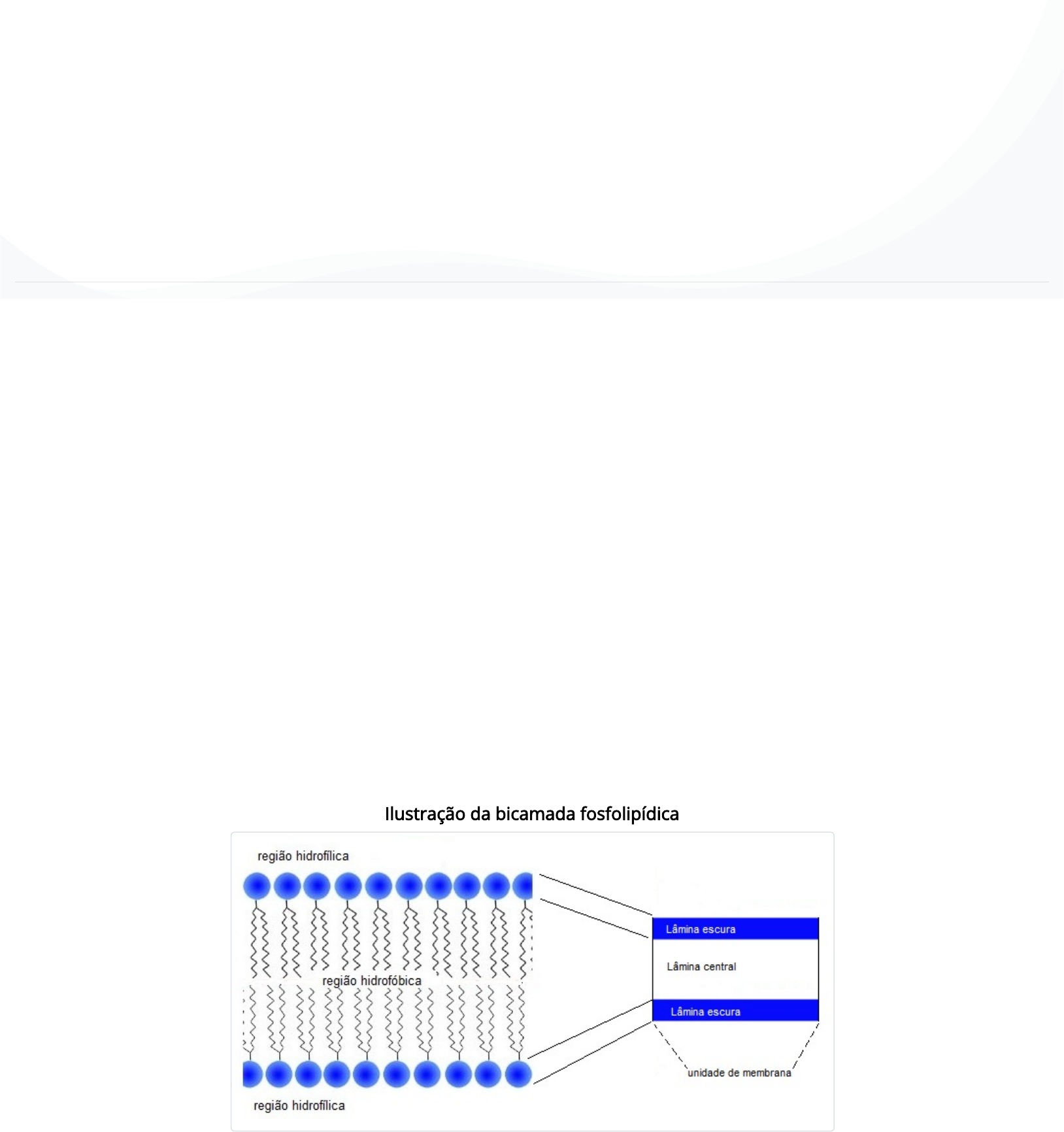 <p>Ilustração da bicamada fosfolipídica</p><p>Fonte: Wikimedia Commons.</p><p>Nesta webaula, estudaremos sobre a membrana plasmática e sua composição.</p><p>Membrana plasmática</p><p>A membrana plasmática é uma estrutura que delimita a célula, separando meio intracelular do meio extracelular.</p><p>Só pode ser visualizada no microsc��pio eletrônico, é a sua estrutura básica é semelhante em todos os tipos</p><p>celulares.</p><p>Composição</p><p>A membrana plasmática apresenta em sua composição proteínas, lipídios, carboidratos, que possuem</p><p>porcentagens variadas de cada um destes componentes, de acordo com o tipo celular considerado. Os lipídios</p><p>mais abundantes da membrana são os fosfolipídios, por conterem grupos fosfato e, dentre eles, os mais comuns</p><p>encontrados nas membranas celulares são os fosfoglicerídeos, es�ngolipídios, colesterol e glicolipídios.</p><p>Os fosfolipídios formam a bicamada lipídica ou fosfolipídica – estrutura básica da membrana plasmática e de</p><p>outras membranas. Auxiliam na permeabilidade da membrana e juntamente com as proteínas compõem o</p><p>modelo do mosaico �uido.</p><p>Proteínas</p><p>Dois grandes grupos de proteínas: integrais (associadas aos lipídios, integradas à membrana) e periféricas (não</p><p>estão associadas aos lipídios). Auxiliam nas atividades metabólicas da membrana.</p><p>Introdução à Biologia Celular e do</p><p>Desenvolvimento</p><p>Membrana plasmática</p><p>Você sabia que seu material didático é interativo e multimídia? Isso signi�ca que você pode interagir com o conteúdo de diversas formas, a</p><p>qualquer hora e lugar. Na versão impressa, porém, alguns conteúdos interativos �cam desabilitados. Por essa razão, �que atento: sempre</p><p>que possível, opte pela versão digital. Bons estudos!</p><p>Membranas plasmáticas na odontologia</p><p>As membranas plasmáticas são utilizadas em alguns casos especí�cos odontológicos, em que os ossos</p><p>insu�cientes para colocação de implante ou aparelho protético. Quando a regeneração óssea ou aumento de</p><p>massa óssea não ocorre da forma esperada, com o auxílio da técnica de Regeneração Óssea Guiada (ROG) é</p><p>possível realizar o posicionamento e estabilização da membrana, de modo que ela separe o tecido mole do tecido</p><p>ósseo do implante, impedindo a migração de células do tecido epitelial e conjuntivo no espaçamento que será</p><p>repovoado por células ósseas e outras células necessárias (COSTA et al., 2016).</p><p>Para �nalizar esta webaula e para conhecer um pouco mais a respeito das especializações da membrana</p><p>plasmática, para você visualizar imagens microscópicas destas especializações e veri�car a importância de</p><p>cada uma delas, consulte o material da Universidade Federal do Rio Grande do Sul: Especializações da</p><p>membrana plasmática. UFRGS. c2020.</p><p>Você também pode acessar o capítulo 5 (páginas 94 a 103) do livro a seguir: JUNQUEIRA, L. C.; CARNEIRO,</p><p>José. Biologia celular e molecular. 9. ed. Rio de Janeiro: Guanabara Koogan, 2012.</p>