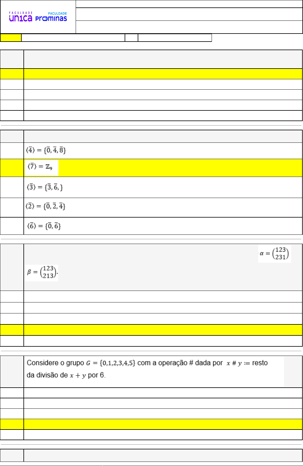 <p>14/09/2024 09:14:52 1/2</p><p>REVISÃO DE SIMULADO</p><p>Nome:</p><p>MARIA DE JESUS FERREIRA BRAGA</p><p>Disciplina:</p><p>Álgebra</p><p>Respostas corretas são marcadas em amarelo X Respostas marcardas por você.</p><p>Questão</p><p>001 (ENADE 2005) Se G é um grupo multiplicativo de ordem n e H é um subgrupo de G de</p><p>ordem m, então:</p><p>A) m é divisor de n.</p><p>X B) O índice de G em H é igual a mn.</p><p>C) mdc(m,n)=1.</p><p>D) O grupo quociente G/H é abeliano.</p><p>E) H tem um gerador de ordem m.</p><p>Questão</p><p>002 Considere o grupo (Z9,+ ). Assinale a alternativa correta.</p><p>A)</p><p>X B)</p><p>C)</p><p>D)</p><p>E)</p><p>Questão</p><p>003</p><p>Seja S3 o grupo simétrico de ordem 3 dado por S3={Id,α,α2,β,αβ,βα}, onde e</p><p>Assinale a alternativa correta.</p><p>A) {α,α2} é um subgrupo de S3.</p><p>B) {Id,α} é um subgrupo de S3.</p><p>C) {Id,α,β} é um subgrupo de S3.</p><p>X D) {Id,β} é um subgrupo de S3.</p><p>E) {Id,β,αβ} é um subgrupo de S3.</p><p>Questão</p><p>004</p><p>A) {0,2,3,4,5} é um subgrupo de G.</p><p>B) {0,3,4} é um subgrupo de G.</p><p>C) {1,2,3} é um subgrupo de G.</p><p>D) {0,2,4} é um subgrupo de G.</p><p>X E) {0} não é um subgrupo de G.</p><p>Questão</p><p>005 Considere os conjuntos Q+,⋅ ) e Q+,+). Assinale a alternativa correta.</p><p>14/09/2024 09:14:52 2/2</p><p>A) (Q+,+) não é um grupo pois a operação não é associativa;</p><p>B) (Q+,⋅) não é grupo pois os elementos não possuem inverso.</p><p>C) (Q+,⋅ ) não é um grupo pois a operação não possui elemento neutro.</p><p>X D) (Q+,⋅) e (Q+,+) são grupos.</p><p>E) (Q+,⋅) é um subgrupo de (Q,⋅).</p><p>Questão</p><p>006 Seja G um grupo abeliano e H um subgrupo de G. Julgue as alternativas abaixo como</p><p>verdadeiras ou falsas e marque a sequência correta.</p><p>()H é um grupo abeliano com a operação de G</p><p>()O elemento neutro de H é igual ao elemento neutro de G.</p><p>()O quociente G/H é um grupo chamado grupo quociente.</p><p>A) F,V,F.</p><p>B) V,V,F.</p><p>C) F,F,F.</p><p>X D) F,V,V.</p><p>E) V,V,V.</p><p>Questão</p><p>007 Determine qual dos conjuntos abaixo é um grupo com a operação indicada:</p><p>A) (Z+,+)</p><p>B) (Q-,⋅ )</p><p>C) (G,+), onde G = {x ∈ Z | x é par }</p><p>D) (Z,⋅ )</p><p>X E) (Z-,+)</p><p>Questão</p><p>008</p><p>(ENADE 2011) Considere os elementos pertencentes ao</p><p>grupo das permutações S3. Assinale a opção que representa αβ.</p><p>A)</p><p>B)</p><p>X C)</p><p>D)</p><p>E)</p>