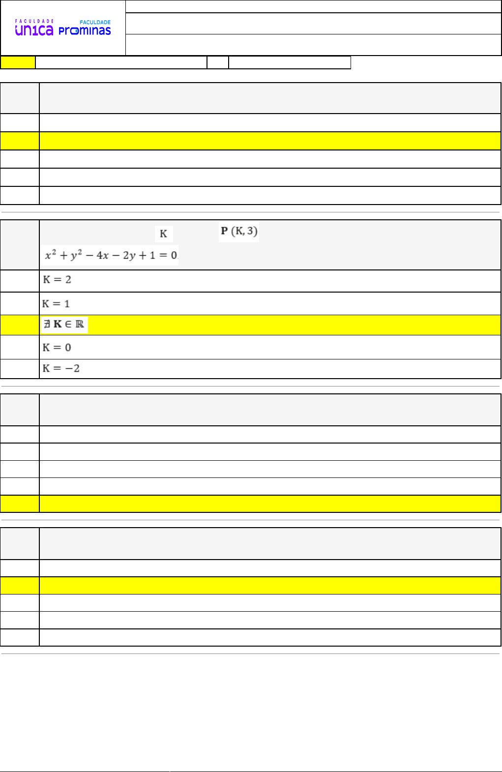 <p>12/09/2024 20:46:40 1/3</p><p>REVISÃO DE SIMULADO</p><p>Nome:</p><p>ANA MICHELLY CARVALHO PINTO</p><p>Disciplina:</p><p>Geometria Analítica</p><p>Respostas corretas são marcadas em amarelo X Respostas marcardas por você.</p><p>Questão</p><p>001 Um ponto P(x,y) se move de tal modo que sua distância ao ponto C(-2,3) é igual a 4. O</p><p>lugar geométrico do ponto P tem equação</p><p>A) x2+y2+3x-2y+12=0</p><p>B) x2+y2+4x-6y-3=0</p><p>X C) x2+y2-2x-2y+8=0</p><p>D) x2+y2+4x+2y-10=0</p><p>E) x2+y2+3x-8y+7=0</p><p>Questão</p><p>002 Para quais valores de o ponto é interno a circunferência</p><p>.</p><p>A)</p><p>B)</p><p>X C)</p><p>D)</p><p>E)</p><p>Questão</p><p>003 O valor de k para que as circunferências x2 + y2-12x - k=0 e x2 + y2=4 sejam tangentes</p><p>exteriormente é:</p><p>A) 20</p><p>B) -12</p><p>X C) -8</p><p>D) 5</p><p>E) -20</p><p>Questão</p><p>004 Os valores de m para que a reta r:4x+3y+m=0 e a circunferência</p><p>x2+y2-12x+16y+96=0 sejam secantes é:</p><p>A) -12 < m < 4</p><p>B) -10 < m < 10</p><p>X C) -7< m < 11</p><p>D) -5 < m < 15</p><p>E) 4 < m < 18</p><p>12/09/2024 20:46:40 2/3</p><p>Questão</p><p>005 (Enem 2018) Um jogo pedagógico utiliza-se de uma interface algébrico-geométrica do</p><p>seguinte modo: os alunos devem eliminar os pontos do plano cartesiano dando “tiros”,</p><p>seguindo trajetórias que devem passar pelos pontos escolhidos.</p><p>Para dar os tiros, o aluno deve escrever em uma janela do programa a equação</p><p>cartesiana de uma reta ou de uma circunferência que passa pelos pontos e pela origem</p><p>do sistema de coordenadas.</p><p>Se o tiro for dado por meio da equação da circunferência, cada ponto diferente da</p><p>origem que for atingido vale 2 pontos.</p><p>Se o tiro for dado por meio da equação de uma reta, cada ponto diferente da origem</p><p>que for atingido vale 1 ponto.</p><p>Em uma situação de jogo, ainda restam os seguintes pontos para serem eliminados:</p><p>Passando pelo ponto A, qual equação forneceria a maior pontuação?</p><p>A)</p><p>X B)</p><p>C)</p><p>D)</p><p>E)</p><p>Questão</p><p>006 A equação geral da circunferência concêntrica com a circunferência x2+y2+2x+6y-6=0</p><p>e tangente à reta que passa pelos pontos A(-2,4) e B(2,1) é:</p><p>A) x2+y2+3x+4y-1=0</p><p>X B) x2+y2-7x+6y-18=0</p><p>C) x2+y2+4x-9y-12=0</p><p>D) x2+y2+2x-8y-10=0</p><p>E) x2+y2+2x+6y-15=0</p><p>Questão</p><p>007 A reta é tangente a uma circunferência de centro Determine a</p><p>equação geral dessa circunferência.</p><p>A)</p><p>X B)</p><p>12/09/2024 20:46:40 3/3</p><p>C)</p><p>D)</p><p>E)</p><p>Questão</p><p>008 O comprimento da corda determinada pela reta x+y-2=0 sobre a circunferência de</p><p>centro(1,1) e raio 2√2 é:</p><p>A) 4√2</p><p>X B) 4√3</p><p>C) 4</p><p>D) 2√3</p><p>E) 2√2</p>