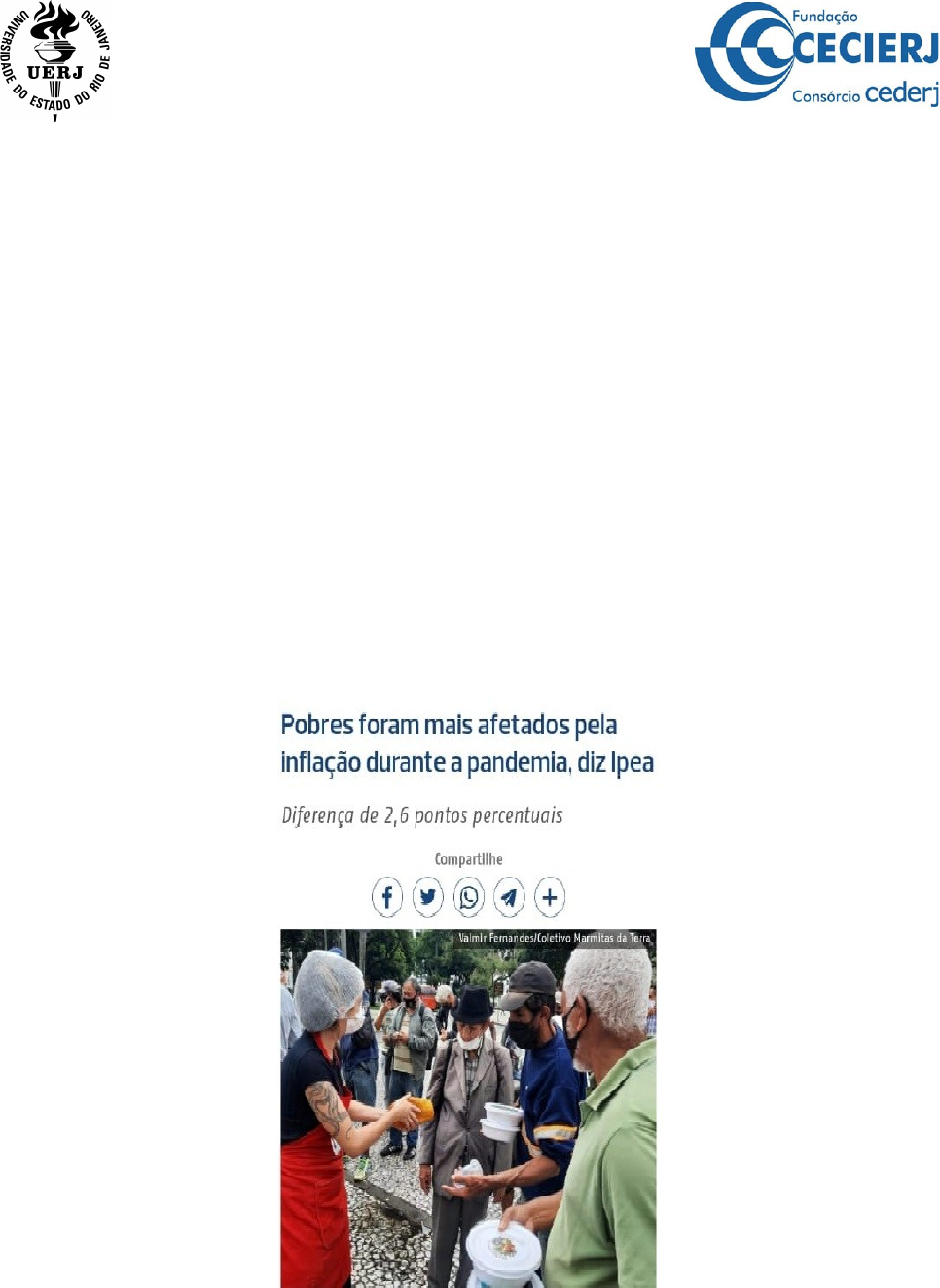 <p>AD2 Estágio Supervisionado III</p><p>Público Alvo: Ano: 6º</p><p>Tempo para realização da atividade: 40 minutos.</p><p>Após ler o texto Desterritorialização sem limites: Reflexões geográficas em tempos de pandemia</p><p>para os alunos, colocarei a imagem a seguir para ser feita uma avaliação e análise</p><p>do que a imagem e o texto tem em comum e o que os alunos conseguem interpretar e entender o</p><p>contexto da imagem.</p><p>Após apresentação da imagem, divida os alunos em grupos de 4 pessoas e peça que eles escrevam</p><p>no caderno o que eles conseguem relacionar a imagem com o texto Desterritorialização sem</p><p>limites: Reflexões geográficas em tempos de pandemia.</p><p>Ao terminar o tempo da atividade peça que os grupos troquem os cadernos e escolha um</p><p>representante para ler em voz alta a interpretação do outro grupo.</p><p>Gabarito:</p><p>O objetivo desta atividade é a troca de informação e de diferentes interpretações sobre a imagem, os</p><p>alunos terão uma ampla visão, com diferentes ideias na mesma imagem.</p><p>Podemos interpretar na imagem que a pandemia afetou diretamente os pobres, que ao invés dessas</p><p>pessoas estarem em sua residência em quarentena, precisaram se aglomerar para conseguir o que</p><p>comer, pois o auxílio emergencial não foi suficiente para suprir a necessidade das famílias, os</p><p>pobres não tiveram opção de ficar em quarentena, pois se não colocasse a vida em risco, passariam</p><p>fome.</p><p>Referências:</p><p>MOES, MALU,Pobres foram mais afetados pela inflação durante a pandemia, diz Ipea,</p><p>PODER360.COM.BR, 2021. DISPONIVEL EM :https://www.poder360.com.br/economia/pobres-</p><p>foram-mais-afetados-pela-inflacao-durante-a-pandemia/ . ACESSO EM: 28 DE OUTUBRO DE</p><p>2021.</p><p>https://www.poder360.com.br/economia/pobres-foram-mais-afetados-pela-inflacao-durante-a-pandemia/</p><p>https://www.poder360.com.br/economia/pobres-foram-mais-afetados-pela-inflacao-durante-a-pandemia/</p>