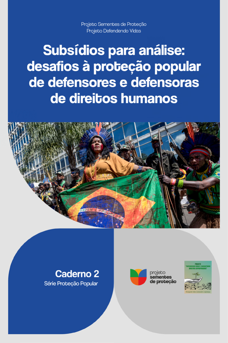 <p>Caderno 2</p><p>Série Proteção Popular</p><p>Subsídios para análise:</p><p>desafios à proteção popular</p><p>de defensores e defensoras</p><p>de direitos humanos</p><p>Projeto Sementes de Proteção de Defensores e Defensoras de Direitos Humanos</p><p>Proponentes</p><p>Sociedade Maranhense de Direitos</p><p>Humanos (SMDH/MNDH)</p><p>Associação Brasileira de Organizações</p><p>Não Governamentais (Abong)</p><p>We World GVC Onlus</p><p>Associadas</p><p>Movimento Nacional de Diretos Humanos</p><p>(MNDH)</p><p>Comissão Pastoral da Terra (CPT)</p><p>Associação Brasileira de Gays, Lésbicas,</p><p>Bissexuais, Travestis, Transexuais e</p><p>Intersexos (ABGLT)</p><p>Articulação para o Monitoramento dos</p><p>Direitos Humanos (AMDH)</p><p>Conselho Indigenista Missionário (CIMI)</p><p>Co-financiamento</p><p>União Europeia</p><p>Equipe Nacional</p><p>Coordenação Geral: Paulo César Carbonari</p><p>(MNDH/SMDH)</p><p>Equipe SMDH: Diana Melo, Joisiane San-</p><p>ches Gamba, Marcelo Fontenelle, Raissa</p><p>Lima Dias da Silva, Renata Castro Barros e</p><p>Fernando Borges de Oliveira</p><p>Equipe Abong: Adriana Torreão, Daiane</p><p>Amaral, Franklin Félix, Luiz Gustavo Pires,</p><p>Pedro Bocca e Raquel Catalani</p><p>Equipe WWB: Monica Bonadiman, José</p><p>Marques de Sousa Neto, Mirlania Lima</p><p>Bezerra e Francisco Rosângelo Marcelino</p><p>da Silva</p><p>Projeto Defendendo Vidas e Garantindo Direitos Expropriados</p><p>Proponente</p><p>Sociedade Maranhense de Direitos</p><p>Humanos (SMDH/MNDH)</p><p>Associadas</p><p>Movimento Nacional de Diretos Humanos</p><p>(MNDH)</p><p>Comissão Pastoral da Terra (CPT)</p><p>Conselho Indigenista Missionário (CIMI)</p><p>Co-financiamento</p><p>Misereor</p><p>Equipe Nacional</p><p>Equipe SMDH: Joisiane Sanches Gamba,</p><p>Alessandra Farias e Paulo César Moreira</p><p>Projeto Sementes de Proteção</p><p>Projeto Defendendo Vidas</p><p>Passo Fundo</p><p>Saluz</p><p>2022</p><p>Caderno 2</p><p>Série Proteção Popular</p><p>Subsídios para análise:</p><p>desafios à proteção popular</p><p>de defensores e defensoras</p><p>de direitos humanos</p><p>Dados Internacionais de Catalogação na Fonte</p><p>P964a Projeto Sementes de Proteção</p><p>Subsídios para análise : desafios à proteção popular de defensores e</p><p>defensoras de direitos humanos [recurso eletrônico] / Projeto Sementes de</p><p>Proteção ; Projeto Defendendo Vidas. – Passo Fundo : Saluz, 2022. – (Série</p><p>Proteção Popular ; v. 2).</p><p>40 p. ; 1,4 MB ; PDF.</p><p>ISBN: 978-85-69343-87-5</p><p>DOI: 10.5281/zenodo.6516256</p><p>1. Direitos Humanos. 2. Defensores de Direitos Humanos.</p><p>3. Educação popular. 4. Educação em Direitos Humanos. I. Projeto</p><p>Defendendo Vidas. II. Título. III. Série.</p><p>CDD: 323</p><p>CDU: 342.7</p><p>Catalogação: Marina Miranda Fagundes - CRB 14/1707</p><p>2022 - Projeto Sementes de Proteção e Projeto Defendendo Vidas</p><p>Esta obra está disponível nos termos da licença Atribuição-NãoComercial-</p><p>-CompartilhaIgual 4.0 Internacional (CC BY-NC-SA 4.0) de Creative Commons.</p><p>Este documento foi elaborado com a participação financeira da União Europeia. O seu</p><p>conteúdo é da responsabilidade exclusiva de seus/suas autores/as, não podendo, em</p><p>caso algum, considerar-se que reflete a posição da União Europeia. Da mesma maneira,</p><p>não reflete a posição da Misereor, ainda que tenha contado com seu apoio financeiro.</p><p>Edição: EAB Editora</p><p>Projeto gráfico, capa e diagramação: Diego Ecker</p><p>Revisão: Araceli Pimentel Godinho</p><p>Sistematização do texto: Joisiane Gamba, Marcelo Fontenelle, Luis Pedrosa, Alessandra</p><p>Farias, Paulo Cesar Moreira, Roseane Dias e Luismar Ribeiro Pinto</p><p>2022</p><p>Editora Acadêmica do Brasil Editoração e Diagramação LTDA</p><p>Rua Senador Pinheiro, 350, Sala 1</p><p>99070-220, Passo Fundo, RS</p><p>www.eabeditora.com.br</p><p>https://www.eabeditora.com.br</p><p>Sumário</p><p>Apresentação ....................................................... 7</p><p>Subsídios para análise: desafios para a proteção</p><p>popular na atuação de defensores/as de</p><p>direitos humanos ................................................. 9</p><p>Conjuntura política brasileira e mundial:</p><p>agravante para o risco e ameaça ............................ 12</p><p>A Política Pública de Proteção a Defensores e</p><p>Defensoras de Direitos Humanos .......................... 18</p><p>Os principais desafios para a proteção popular</p><p>de Defensores e Defensoras de Direitos Humanos . 24</p><p>Desafios para a organização popular ..................... 31</p><p>Notas finais .......................................................... 38</p><p>Projeto Sementes de Proteção................................ 39</p><p>Projeto Defendendo Vidas ..................................... 40</p><p>7</p><p>Apresentação</p><p>A Série Proteção Popular tem a finalidade de reunir</p><p>reflexões e sistematizações que vão sendo construídas</p><p>como parte das práticas de proteção popular de defenso-</p><p>res/as de direitos humanos. Serão Cadernos de subsídio</p><p>para alimentar a atuação na luta por direitos humanos,</p><p>os diversos direitos, e para a afirmação dos/as sujeitos/as</p><p>de direitos humanos.</p><p>A Série é parte da construção de uma convergência</p><p>entre o Projeto Sementes de Proteção de Defensores/as</p><p>de Direitos Humanos e do Projeto Defendendo Vidas e</p><p>Garantindo Direitos Expropriados, o primeiro com apoio</p><p>e cofinanciamento da União Europeia, e o segundo com</p><p>apoio da Misereor.</p><p>Este é o segundo Caderno e trata de apresentar subsídios</p><p>para a atuação de Defensores/as de Direitos Humanos.</p><p>Os elementos nele trazidos são indicativos para serem</p><p>complementados pela leitura das realidades locais e da</p><p>percepção que se pode encontrar em cada território