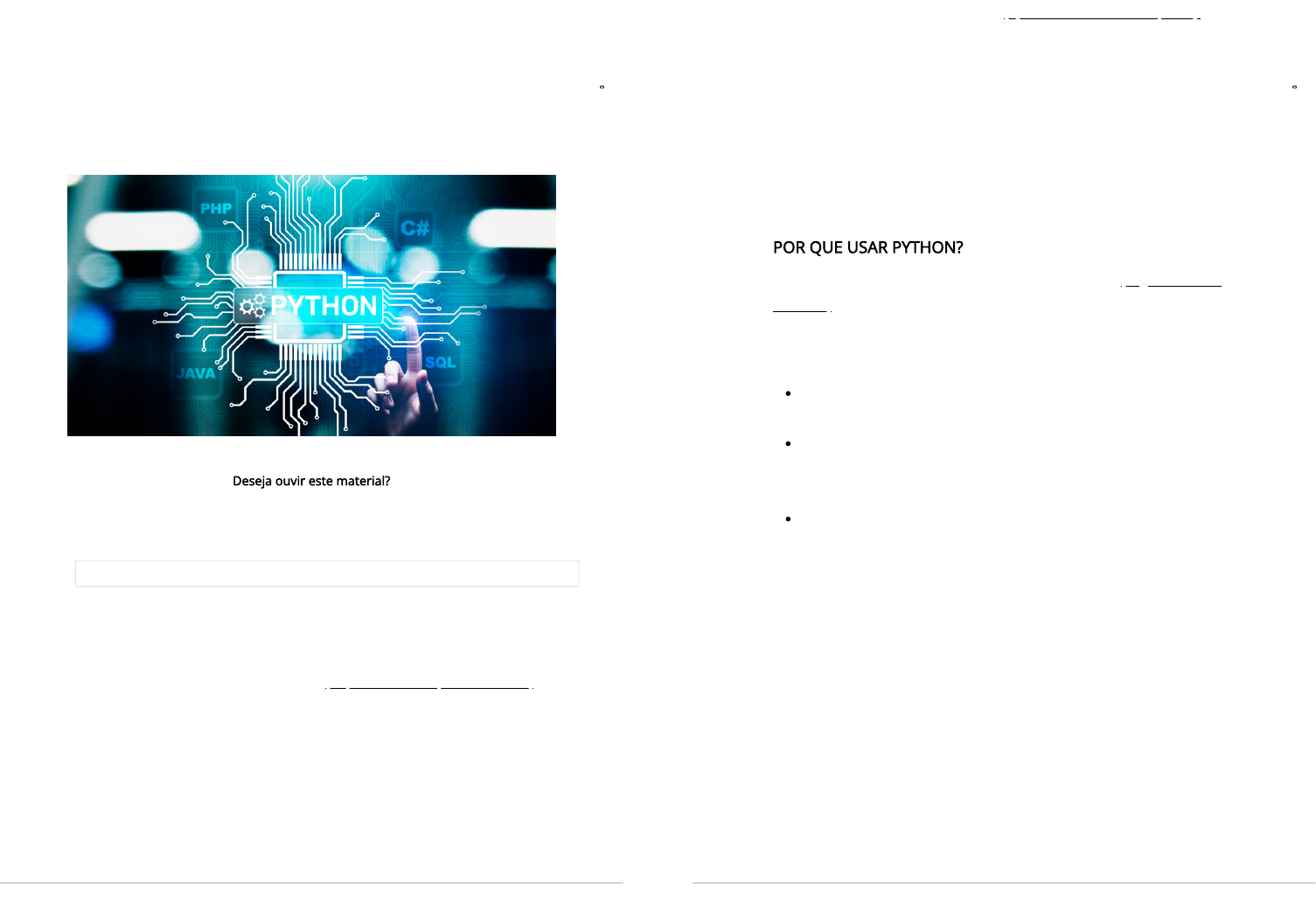 <p>NÃO PODE FALTAR</p><p>A LINGUAGEM PYTHON</p><p>Vanessa Cadan Sche�er</p><p>Imprimir</p><p>print("hello world!")</p><p>Diz a lenda dos programadores que, se você não imprimir o “hello world” quando</p><p>começar a aprender uma linguagem de programação, você não conseguirá</p><p>aprender nada da linguagem em questão (https://cienciacomputacao.com.br). Mito</p><p>ou verdade? Por via das dúvidas, essa foi nossa primeira linha de comando, de</p><p>muitas que aprenderemos nessa disciplina. Como você pode ver, um comando de</p><p>sintaxe "limpa", sem ponto e vírgula, sem colchetes, sem importação de bibliotecas</p><p>é a essência da linguagem de programação Python, que foi criada para ter</p><p>comandos e estruturas simples, de fácil leitura e compreensão.</p><p>Python foi criado no início dos anos 1990 por Guido van Rossum no Stichting</p><p>Mathematisch Centrum (CWI), na Holanda, como sucessor de uma linguagem</p><p>chamada ABC. Guido é o principal autor do Python, embora haja muitas</p><p>PRIMEIROS PASSOS EM PYTHON</p><p>Vamos conhecer o poder dessa linguagem de programação.</p><p>Fonte: Shutterstock.</p><p>Deseja ouvir este material?</p><p>Áudio disponível no material digital.</p><p>In [1]:</p><p>hello world!</p><p>0</p><p>V</p><p>er</p><p>a</p><p>n</p><p>o</p><p>ta</p><p>çõ</p><p>es</p><p>contribuições de outros pesquisadores (Python Reference Manual, 2020). Guido</p><p>passou por outras instituições, como a CNRI, em 1995, na Virginía (Corporação para</p><p>Iniciativas Nacionais de Pesquisa) e na BeOpen, em 2000, onde formou a BeOpen</p><p>PythonLabs. Em outubro do mesmo ano, a equipe do PythonLabs mudou-se para a</p><p>Digital Creations (agora Zope Corporation). Em 2001, a Python Software Foundation</p><p>(PSF) foi formada, uma organização sem �ns lucrativos criada especi�camente para</p><p>possuir a propriedade intelectual relacionada ao Python.</p><p>POR QUE USAR PYTHON?</p><p>Segundo o guia de desenvolvimento para iniciantes Python (Beginners Guide</p><p>Overview), Python é uma linguagem de programação orientada a objetos, clara e</p><p>poderosa, comparável a Perl, Ruby, Scheme ou Java. Podemos destacar algumas</p><p>características que tornam essa linguagem notável:</p><p>Utiliza uma sintaxe elegante, facilitando a leitura dos programas que você</p><p>escreve.</p><p>É uma linguagem fácil de usar, o que torna o Python ideal para o</p><p>desenvolvimento de protótipos e outras tarefas de programação ad-hoc, sem</p><p>comprometer a manutenção.</p><p>Vem com uma grande biblioteca padrão que suporta muitas tarefas comuns de</p><p>programação, como se conectar a servidores da Web, pesquisar texto com</p><p>expressões regulares, ler e modi�car arquivos.</p><p>0</p><p>V</p><p>er</p><p>a</p><p>n</p><p>o</p><p>ta</p><p>çõ</p><p>es</p><p>Possui inúmeras bibliotecas que estendem seu poder de atuação.</p><p>É uma linguagem interpretada, ou seja, uma vez escrito o código, este não</p><p>precisa ser convertido em linguagem de máquina por um processo de</p><p>compilação.</p><p>Permite atribuição mútlipla. Podemos atribuir valores a mais de uma variável</p><p>em uma única instrução. Por exemplo, a, b = 2, 3.</p><p>Uma das grandes características da linguagem é sua sintaxe. Uma das principais</p><p>ideias de Guido é que o código é lido com muito mais frequência do que está</p><p>escrito (PEP 8 - Style Guide for Python Code). Tal aspecto é tão relevante, que um</p><p>código que segue as regras do idioma python é chamado de “pythonic code”. Essas</p><p>regras são de�nidas pelo PEP 8 (Python Enhancement Proposal) e dizem respeito a</p><p>formatação, identação, parâmetros em funções e tudo mais que possa estar</p><p>relacionado à sintaxe do código.</p><p>Python tem se mostrado uma linguagem muito poderosa e está sendo amplamente</p><p>adotada por pro�ssionais na área de dados.</p><p>O interpretador Python 3 utiliza unicode por padrão, o que torna possível usar</p><p>nomes de variáveis com acento e até outros caracteres especiais, porém não é uma</p><p>boa prática. Tal �exibilidade mostra porque a linguagem tem sido adotada por</p><p>pessoas que não são da área de exatas, pois a leitura está mais próxima da</p><p>interpretação humana do que da máquina</p><p>ONDE PROGRAMAR?</p><p>Agora que já conhecemos um pouco dessa importante linguagem e já sabemos que</p><p>existe até um “código” de escrita determinado pelo PEP 8, podemos nos perguntar:</p><p>mas onde eu escrevo os códigos em Python e vejo os resultados? A implementação</p><p>de códigos em Python pode ser feita tanto em ferramentas instaladas no seu</p><p>computador quanto em ambientes em nuvem. Nesse universo de possiblidades, o</p><p>primeiro ponto que você precisa entender é que, para obter os resultados de um</p><p>código, precisamos ter um interpretador Python. Vamos começar analisando as</p><p>opções que podem ser instaladas.</p><p>INSTALAÇÃO DO INTERPRETADOR PYTHON</p><p>0</p><p>V</p><p>er</p><p>a</p><p>n</p><p>o</p><p>ta</p><p>çõ</p><p>es</p><p>Na página o�cial da linguagem (https://www.python.org/downloads/), podemos</p><p>encontrar as várias versões do interpretador Python puro (sem bibliotecas de</p><p>terceiros), disponíveis para diversos sistemas operacionais. Para instalar, basta</p><p>escolher o sistema operacional, fazer o download da versão mais atual do</p><p>interpretador 3.X e, após concluído o download, clique no arquivo executável que</p><p>foi descarregado do repositório o�cial.</p><p>No processo de instalação do interpretador Python, é preciso marcar a opção Add</p><p>Python 3.X to PATH (Figura 1.1). Ao marcar essa opção, a variável de ambiente Path</p><p>é con�gurada para entender o comando “python”. Caso não seja marcada a opção,</p><p>você precisará con�gurar manualmente depois.</p><p>Figura 1.1 | Processo de instalação do interpretado