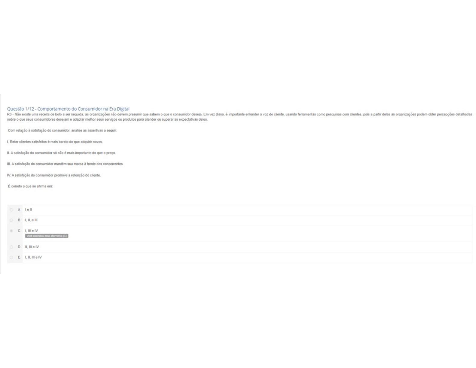 <p>Questão 1/12 Comportamento do Consumidor na Era Digital R3 Não existe uma receita de bolo a ser as organizações não devem presumir que que consumidor Em vez é importante entender a voz do usando ferramentas como pesquisas com clientes, pois a partir delas as organizações podem obter percepções detalhadas sobre que seus consumidores desejam e adaptar melhor seus serviços ou produtos para atender ou superar as expectativas Com relação à satisfação do analise as assertivas a Reter clientes satisfeitos é mais barato do que adquirir II. A satisfação do consumidor só não é mais importante do que preço. III A satisfação do consumidor mantém sua marca à frente dos concorrentes A satisfação do consumidor promove a retenção do É correto que se afirma A II B II. III C III IV assinalou D II. III IV E II. III e IV</p>