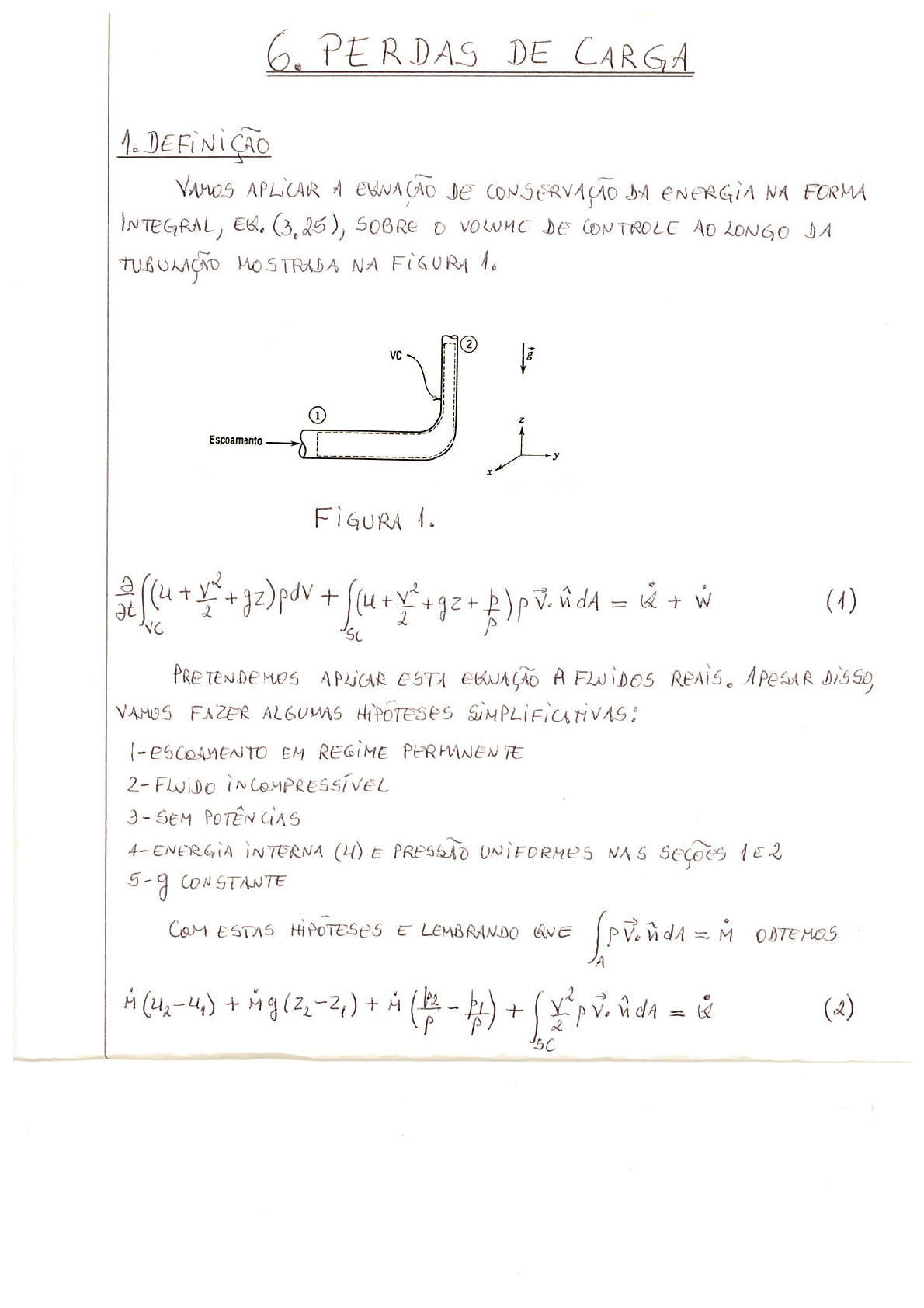 <p>6. PERDAS DE CARGA 1. A DE CONSERVAÇÃO DA NA FORMA INTEGRAL, EK. (3.25), SOBRE VOLUME DE CONTROLE LONGO DA Mo STRADA NA FIGURA 1. 2 VC 1 Escoamento y at a + 2 + pdv + + get p) P = is + w (1) VC SC PRETENDEMOS ESTA A FLUIDOS REAIS. APESAR Disso, VAMOS FAZER ALGUMAS 1- EM REGIME 2- FLUIDO 3- SEM 4- ENERGIA INTERNA (4) E NAS 1E2 5-g CONSTANTE ESTAS E LEMBRANDO QUE = in OBTEMOS + + P + 2 = is (2) SC</p><p>SABEMOS EM REAIS DE VELOCIDADES SAO UNIFORMES. PARA isso, USAREMOS DE (2) 2 2 V. & V 2 = M (3) A A A EK. (3) NA (2) TEMOS + + ( - + 2 - = is ESTA POR is E REARRANJANDO TERMOS ORTEM-SE 2 + 2 + = + -2 2 + + (42-41) - (4) M I II III IV DA A eNERGiA NA 1 (TERMO I) E NA 2 (TERMO II) MAIS A GERIDA ENTRE AS 1 E2 (TERHO III) E CALOR TRANSFERIDO (TERMO IV). Os TERMOS III SE ORIGINAM DA PERDA DE ME- ENTRE AS E 2. PORTANTO,</p><p>PERDA DE CARGA E A PELO AO ESCOAR EM UMA DEVIDO AO ATRITO ENTRE SUAS TODA A PERDIDA E EM ENERGIA TERMICA. A (4) PODE, SER REESCRITA coro + = + 2 + + (5) ONDE hT = PERDA DE CARGA TOTAL A PERDA to CARGA NORMALMENTE, E EM PERDA CARGA (hc) E PERDA DE CARGA LOCAL ou = hc + he (6) 2. PERDA DE CARGA CONTINUA A PERDA De CARGA UM SOFRE NO TAMENTE DESENVOLVIDO NUM DUTO DE CONSTANTE E CHAMADA DE PERDA DE CARGA ELA E POR DE hc= = f L (7) D 2 ONDE 89</p><p>f = FATOR DE DARCY L = COMPRIMENTO DO DUTO (m) DO DUTO (m) V = VELOCIDADE DO (m/s) EXPERIMENTALMENTE FATOR DE ATRITO E so DO be REYNOLDS (Re) CASO ESCOAMENTOS PARA FATOR DE ATRITO E DO Re E DA (e/D) DO DUTO. 0 TRO "e" REPRESENTA A ALTURA DA DAS DOS DUTOS. ALGUNS CONCRETO : e=0,30 A 3,0 mm FERRO e mm e 0,046 mm VAMOS UM PROBLEM EM E DESENVOLVIDO NA De UM DUTO 1) E EM SVA SAIDA 0 DUTO TEM LE DIAMETRO D E Z1 = - A (5) A TEM-SE = P2 + (P) P P COMO LAMINAR COMPLETIMENTO DESENVOLVIDO ENTRE PARALELAS A (4.58), PODEMOS OBTER UM A = - D2 dp 8u 324 (9) dx</p><p>Dr A DA (dp/dx) NO ESCOA- MENTO PLENAMENTE E IN A (9) ENTRE AS 162 DO DA TEMOS - 32MV = ou = (10) L D2 D2 A (8), 32 VLV D2 TRABALHANDO A PARA NA FORMA DA (7) CHEGAMOS A hc=32 = V 2V = 64 ) L = 64 L 2V VD D 2 1) 2 ESTE RESULTADO COM A (7) VERIFICAMOS 64 (ESCOAMENTO LAMINAR) (12) ReD ( FATOR DE ATRITO PARA BSCOAMENTOS TURBULENTOS FLUIDOS E OBTIDO ATRAVES DO DIAGRAM DE MOODY (1944) MOS- TRADO NA FIGURA 2. ESTE DIAGRAM DADOS DE FONTES. A iNCERTEZA DADOS E DE</p><p>DE MOODY PODE SER EM 4 1- ESCOAMEN TO LAMINOR ATE 2000 f(Res); 2- 20NA ENTRE 2000 e 4000; f ESCOAMENTO PULSANTE E DRA LAMINAR 3- ZONA DE f ESCOAMENTO 4- ZONA De TUBOS CONSTANTE TURBULENTO 0 FATOR ATRITO TURBULENTOS PODE SER OBTIDO DA DE MiLLER 2 = 0,25 log ( e/D + 5,74 0,9 (ESCOAMENTO TURBULENTO) (13) 3,7 É NOTAR PARA LAMINAR A PERDA DE CARGA E PROPORCIONAL i EG. (11). PARA TURBULENTO, A PERDA Je CARGA E PROPORCIONAL AO DA E EXEMPLO: D= 0,1m V= L= 10m e/D = 0,015 (FERRO FUNDIDO) Re, = VD ou V= ReDV (14) V D 91</p><p>0,09 Zona 0,08 Escoamento Zona de Zona completamente 0,07 0,06 0,05 0,04 0,05 0,03 0,02 0,04 0,015 0,01 Recr 0,03 0,008 0,006 0,025 0,004 0,02 0,002 0,001 0,0008 0,015 0,0006 0,0004 Canos lisos 0,0002 0,0001 0,01 0,009 0,000,05 0,008 2 3 4 8 104 2 3 4 8 105 2 3 456 8 106 0.000,01 2. 3 456 8 2 8 108 Número de Reynolds, Re = e/D e/D</p><p>f (Pa) 102 0,001 0,64 0,032 LAMINAR 0,01 0,064 0,32 104 0,1 0,049 0,024 24 105 1,0 0,044 2,2 TURBULENTO 106 10,0 0,044 220,0 2,2x105 NA TABELA Foi (7) E Ap A DEVE-SE OBSERVAR NO CASO DO UM FLUIDO NO De UM DE CONSTANTE, V=VE E, M=0, PERDA DE CARGA, ou SEVA, PORTANTO, DA (5) CHEGA-SE A + g2, = P2 t + 2 (15) E A DE BERNOULLi. E NOTAR A OBTIDA A PARTIR DA De DA E A Foi OBTIDA DA CONSERVAÇÃO DA QUANTIDADE CONTUDO, se CHEGAR ex. (15), ALEM DAS USADADAS NA OBTENÇÃO DA (4.29), TEVE-SE DERAR ESCOAMENTO E</p><p>OUTRO PONTO A DESTAGAR E 0 VAMOS CONSiDERIR UM DUTO DE TRINSVERSAL CONSTANTE EM 0 DE NA É E, NA CONFORME MOS TRIDO NA ALEM Disso Coro V1 = A EG. (5) PARA ESTE CASO RESULTA EM 2 + 2 - P2 + L2 -2 + = + (16) ONDE CONTEMPLA A PERDA De DEVIDO A DO NO DUTO 0 COMPRIMEN DE x p Comprimento de entrada Completamente desenvolvido 1 2 P1 Apent = p(K + a2 - 1) 2 Variação linear no escoamento de cano completamente desenvolvido P2 Extrapolado do escoamento completamente desenvolvido FIGURA 3.</p><p>DE (x) E DADO A PARA CASOS ESCOAMENT x=1 to LAMINAR PLENAMENTE DESENVOLVIDO: to EM DESENVOLVIMENTO 2>1 TURBULENTO PLENAMENTE [(n+1) (2n+1)] (17) ONDE "n" NUMERODE REYNOLDS CONFORME visto NO 5. EXEMPLOS: x=1,08 E n=10 2=1,03. NOTAR SEJA PERFIL De EXCETO AssiM, A ek (1b) VOLVIMENTO DE NA DA</p>