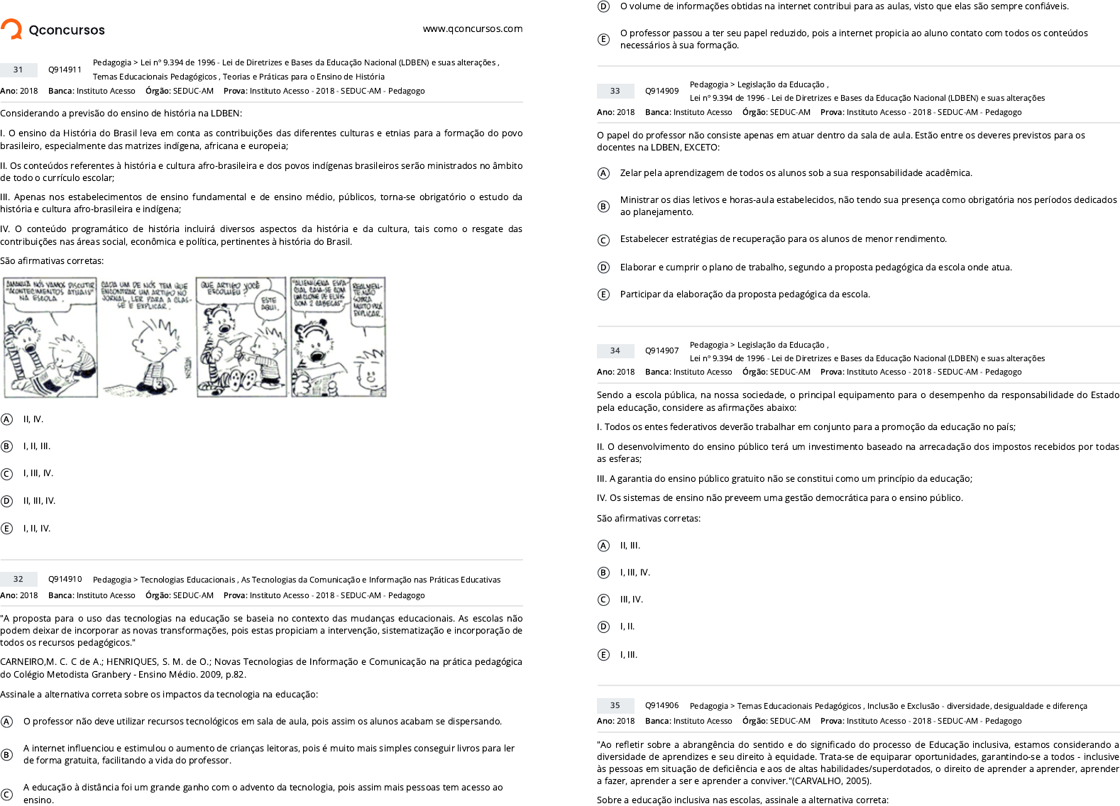 <p>www.qconcursos.com</p><p>Ano: 2018 Banca: Instituto Acesso Órgão: SEDUC-AM</p><p>Considerando a previsão do ensino de história na LDBEN:</p><p>I. O ensino da História do Brasil leva em conta as contribuições das diferentes culturas e etnias para a formação do povo</p><p>brasileiro, especialmente das matrizes indígena, africana e europeia;</p><p>II. Os conteúdos referentes à história e cultura afro-brasileira e dos povos indígenas brasileiros serão ministrados no âmbito</p><p>de todo o currículo escolar;</p><p>III. Apenas nos estabelecimentos de ensino fundamental e de ensino médio, públicos, torna-se obrigatório o estudo da</p><p>história e cultura afro-brasileira e indígena;</p><p>IV. O conteúdo programático de história incluirá diversos aspectos da história e da cultura, tais como o resgate das</p><p>contribuições nas áreas social, econômica e política, pertinentes à história do Brasil.</p><p>São a�rmativas corretas:</p><p>A II, IV.</p><p>B I, II, III.</p><p>C I, III, IV.</p><p>D II, III, IV.</p><p>E I, II, IV.</p><p>Ano: 2018 Banca: Instituto Acesso Órgão: SEDUC-AM</p><p>"A proposta para o uso das tecnologias na educação se baseia no contexto das mudanças educacionais. As escolas não</p><p>podem deixar de incorporar as novas transformações, pois estas propiciam a intervenção, sistematização e incorporação de</p><p>todos os recursos pedagógicos."</p><p>CARNEIRO,M. C. C de A.; HENRIQUES, S. M. de O.; Novas Tecnologias de Informação e Comunicação na prática pedagógica</p><p>do Colégio Metodista Granbery - Ensino Médio. 2009, p.82.</p><p>Assinale a alternativa correta sobre os impactos da tecnologia na educação:</p><p>A O professor não deve utilizar recursos tecnológicos em sala de aula, pois assim os alunos acabam se dispersando.</p><p>B</p><p>A internet in�uenciou e estimulou o aumento de crianças leitoras, pois é muito mais simples conseguir livros para ler</p><p>de forma gratuita, facilitando a vida do professor.</p><p>C</p><p>A educação à distância foi um grande ganho com o advento da tecnologia, pois assim mais pessoas tem acesso ao</p><p>ensino.</p><p>31 Q914911</p><p>>Pedagogia Lei nº 9.394 de 1996 - Lei de Diretrizes e Bases da Educação Nacional (LDBEN) e suas alterações ,</p><p>Temas Educacionais Pedagógicos , Teorias e Práticas para o Ensino de História</p><p>Prova: Instituto Acesso - 2018 - SEDUC-AM - Pedagogo</p><p>32 Q914910 >Pedagogia Tecnologias Educacionais , As Tecnologias da Comunicação e Informação nas Práticas Educativas</p><p>Prova: Instituto Acesso - 2018 - SEDUC-AM - Pedagogo</p><p>D O volume de informações obtidas na internet contribui para as aulas, visto que elas são sempre con�áveis.</p><p>E</p><p>O professor passou a ter seu papel reduzido, pois a internet propicia ao aluno contato com todos os conteúdos</p><p>necessários à sua formação.</p><p>Ano: 2018 Banca: Instituto Acesso Órgão: SEDUC-AM</p><p>O papel do professor não consiste apenas em atuar dentro da sala de aula. Estão entre os deveres previstos para os</p><p>docentes na LDBEN, EXCETO:</p><p>A Zelar pela aprendizagem de todos os alunos sob a sua responsabilidade acadêmica.</p><p>B</p><p>Ministrar os dias letivos e horas-aula estabelecidos, não tendo sua presença como obrigatória nos períodos dedicados</p><p>ao planejamento.</p><p>C Estabelecer estratégias de recuperação para os alunos de menor rendimento.</p><p>D Elaborar e cumprir o plano de trabalho, segundo a proposta pedagógica da escola onde atua.</p><p>E Participar da elaboração da proposta pedagógica da escola.</p><p>Ano: 2018 Banca: Instituto Acesso Órgão: SEDUC-AM</p><p>Sendo a escola pública, na nossa sociedade, o principal equipamento para o desempenho da responsabilidade do Estado</p><p>pela educação, considere as a�rmações abaixo:</p><p>I. Todos os entes federativos deverão trabalhar em conjunto para a promoção da educação no país;</p><p>II. O desenvolvimento do ensino público terá um investimento baseado na arrecadação dos impostos recebidos por todas</p><p>as esferas;</p><p>III. A garantia do ensino público gratuito não se constitui como um princípio da educação;</p><p>IV. Os sistemas de ensino não preveem uma gestão democrática para o ensino público.</p><p>São a�rmativas corretas:</p><p>A II, III.</p><p>B I, III, IV.</p><p>C III, IV.</p><p>D I, II.</p><p>E I, III.</p><p>Ano: 2018 Banca: Instituto Acesso Órgão: SEDUC-AM</p><p>"Ao re�etir sobre a abrangência do sentido e do signi�cado do processo de Educação inclusiva, estamos considerando a</p><p>diversidade de aprendizes e seu direito à equidade. Trata-se de equiparar oportunidades, garantindo-se a todos - inclusive</p><p>às pessoas em situação de de�ciência e aos de altas habilidades/superdotados, o direito de aprender a aprender, aprender</p><p>a fazer, aprender a ser e aprender a conviver."(CARVALHO, 2005).</p><p>Sobre a educação inclusiva nas escolas, assinale a alternativa correta:</p><p>33 Q914909</p><p>>Pedagogia Legislação da Educação ,</p><p>Lei nº 9.394 de 1996 - Lei de Diretrizes e Bases da Educação Nacional (LDBEN) e suas alterações</p><p>Prova: Instituto Acesso - 2018 - SEDUC-AM - Pedagogo</p><p>34 Q914907</p><p>>Pedagogia Legislação da Educação ,</p><p>Lei nº 9.394 de 1996 - Lei de Diretrizes e Bases da Educação Nacional (LDBEN) e suas alterações</p><p>Prova: Instituto Acesso - 2018 - SEDUC-AM - Pedagogo</p><p>35 Q914906 >Pedagogia Temas Educacionais Pedagógicos , Inclusão e Exclusão - diversidade, desigualdade e diferença</p><p>Prova: Instituto Acesso - 2018 - SEDUC-AM - Pedagogo</p><p>A</p><p>A inclusão ocorre quando a escola não possui um local destinado a atender aos alunos que possuam alguma</p><p>necessidade especí�ca educacional.</p><p>B A escola é considerada inclusiva quando enfatiza os bons resultados dos alunos nas propostas pedagógicas.</p><p>C Na escola inclusiva, ocorre