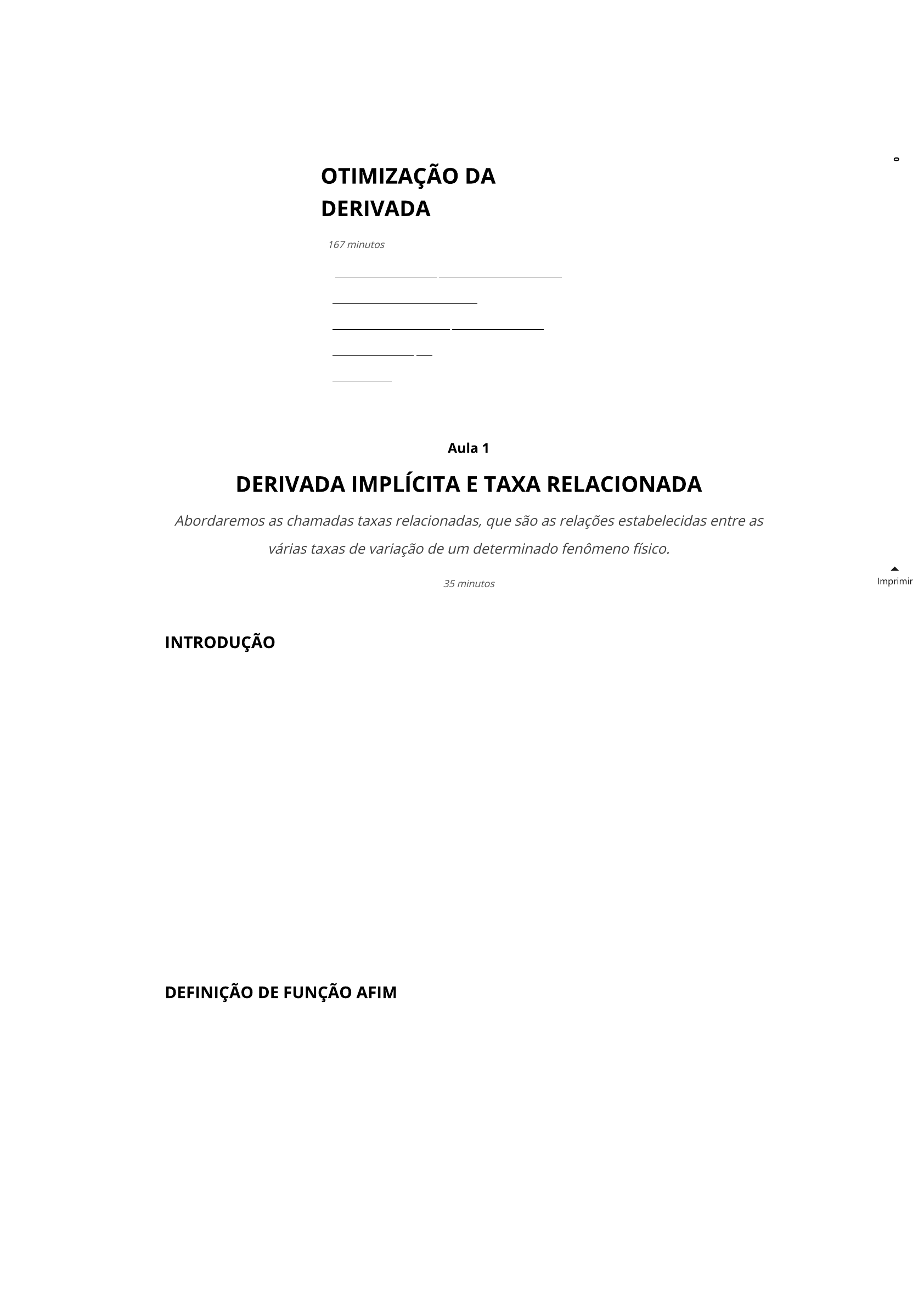 <p>A história do cálculo perpassa a busca em descrever o comportamento dos fenômenos físicos.</p><p>É nesse contexto que nossa aula começa. Abordaremos as chamadas taxas relacionadas, que são as</p><p>relações estabelecidas entre as várias taxas de variação de um determinado fenômeno físico.</p><p>É comum que esses modelos matemáticos, que expressam fenômenos da natureza, não sejam</p><p>apresentados por equações explícitas ou simpli�cadas, o que nos leva à necessidade de trabalhar com</p><p>equações implícitas e, consequentemente, seus processos de derivação. Além disso, pela complexidade das</p><p>equações envolvidas nos modelos, apresentaremos as técnicas de derivação para expressões com</p><p>expoentes racionais.</p><p>Esse é o contexto da nossa aula. Bons estudos!</p><p>Sempre que temos uma função escrita na forma y=f(x) dizemos que y é uma função explícita de x, pois</p><p>podemos isolar a variável dependente de um lado e a expressão da função do outro. Mas, fazer esse tipo de</p><p>ajuste na equação, muitas vezes, não é possível ou é mais complicado quando precisamos resolver um</p><p>problema que envolve derivadas.</p><p>Nesses casos, trabalhamos com o que é chamado a função implícita de x e utilizamos a regra da cadeia</p><p>como técnica de derivação.</p><p>Seja a equação . Observa-se que y é uma função explícita de x, pois podemos escrever</p><p>, onde .</p><p>y = x</p><p>2</p><p>− 5 y = f (x)</p><p>f (x) = x</p><p>2</p><p>− 5</p><p>Abordaremos as chamadas taxas relacionadas, que são as relações estabelecidas entre as</p><p>várias taxas de variação de um determinado fenômeno físico.</p><p>35 minutos</p><p> Aula 1 - Derivada implícita e taxa relacionada</p><p> Aula 2 - Máximos e mínimos</p><p> Aula 3 - Concavidade e pontos de in�exão</p><p> Aula 4 - Otimização</p><p> Referências</p><p>167 minutos</p><p>Imprimir</p><p>V</p><p>er</p><p>a</p><p>n</p><p>o</p><p>ta</p><p>çõ</p><p>es</p><p>wlldd_231_u4_cal_int_dif https://conteudo.colaboraread.com.br/202301/WHITE_LABEL/CALCULO_DIFERENCIAL_E_I...</p><p>1 of 34 8/5/2024, 6:06 PM</p><p>Entretanto, a equação de�ne a mesma função, pois, isolando y, obtemos .</p><p>Quando escrita na forma , dizemos que y é uma função em relação a x.</p><p>Dada a equação , determine .</p><p>Para não esquecermos que y é função em relação a x, podemos escrever a equação como</p><p>. Assim, derivando ambos os lados em relação a x, obtemos ou .</p><p>Caso derivássemos a equação na sua forma explícita, , obteríamos exatamente o mesmo</p><p>resultado.</p><p>Dada a equação determine y'.</p><p>Note que a expressão y’ é uma função de x, logo, adotaremos a notação y(x) para evidenciar a necessidade</p><p>da aplicação da regra da cadeia.</p><p>Derivando ambos os lados em relação a x, temos:</p><p>Muitas aplicações necessitam desse tipo de derivação, como, por exemplo, problemas de otimização e</p><p>problemas que envolvem taxas relacionadas. A capacidade de resolver uma derivada de forma implícita</p><p>também nos ajuda a entender o comportamento de algumas funções.</p><p>As taxas relacionadas permitem que avaliemos equações que apresentam mais de uma taxa de variação</p><p>instantânea conectadas entre si por uma mesma variável independente, sendo que essas expressões</p><p>podem estar na forma implícita.</p><p>Dessa forma, novamente temos a regra da cadeia como umas das principais ferramentas de cálculo para</p><p>solucionar problemas que envolvem taxas relacionadas.</p><p>Suponha que duas variáveis x e y sejam funções de outra variável t.</p><p>e</p><p>Podemos interpretar as derivadas e como as taxas de variação instantânea de x e y em relação a t.</p><p>Em certas aplicações, x e y podem estar relacionadas por uma equação como</p><p>Diferenciando essa equação implicitamente em relação a t, obtemos:</p><p>2x</p><p>2</p><p>− 2y = 10 y = x</p><p>2</p><p>− 5</p><p>2x</p><p>2</p><p>− 2y = 10</p><p>y = x</p><p>2</p><p>− 5</p><p>4x</p><p>2</p><p>− 2y = 6 y' (x)</p><p>4x</p><p>2</p><p>− 2y (x) = 6</p><p>8x − 2y′(x) = 0 y′(x) = 4x</p><p>y = 2x</p><p>2</p><p>− 3</p><p>x</p><p>2</p><p>y + 2y</p><p>3</p><p>= 3x + 2y</p><p>2xy (x) + x</p><p>2</p><p>y' (x) + 6[y (x)]</p><p>2</p><p>y' (x) = 3 + 2y' (x)</p><p>y′(x) [x</p><p>2</p><p>+ 6[y (x)]</p><p>2</p><p>− 2] = 3 − 2xy (x) ⇒ y′(x) =</p><p>3−2xy</p><p>x</p><p>2</p><p>+6y</p><p>2</p><p>−2</p><p>x = f (t) y = g (t)</p><p>dx</p><p>dt</p><p>dy</p><p>dt</p><p>x</p><p>2</p><p>− y</p><p>3</p><p>− 2x + 7y</p><p>2</p><p>− 2 = 0</p><p>d(x</p><p>2</p><p>)</p><p>dt</p><p>−</p><p>d(y</p><p>3</p><p>)</p><p>dt</p><p>− 2</p><p>d(x)</p><p>dt</p><p>+ 7</p><p>(y</p><p>2</p><p>)</p><p>dt</p><p>−</p><p>d(2)</p><p>dt</p><p>= 0</p><p>V</p><p>er</p><p>a</p><p>n</p><p>o</p><p>ta</p><p>çõ</p><p>es</p><p>wlldd_231_u4_cal_int_dif https://conteudo.colaboraread.com.br/202301/WHITE_LABEL/CALCULO_DIFERENCIAL_E_I...</p><p>2 of 34 8/5/2024, 6:06 PM</p><p>As derivadas e são chamadas de taxas relacionadas, pois estão relacionadas por uma equação. Tal</p><p>equação pode ser usada para achar uma das taxas, quando a outra é conhecida.</p><p>Por exemplo, a velocidade é uma taxa de variação de um deslocamento em relação ao tempo. Assim, é</p><p>possível interpretar as taxas de variação e como velocidades instantâneas.</p><p>As derivadas podem representar diferentes taxas de variação, dependendo do contexto .</p><p>Podemos citar, além da velocidade, a taxa de variação da temperatura em relação ao tempo, dentre outras.</p><p>Outro problema muito comum, quando possuímos um modelo matemático que representa algum</p><p>fenômeno da natureza, está no fato de que as equações que o compõem costumam ser bastante</p><p>complexas. Nesse sentido, apresentamos a técnica para derivar equações com expoentes racionais. Na</p><p>verdade, em nada
